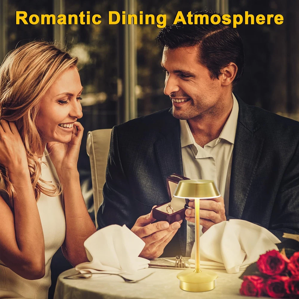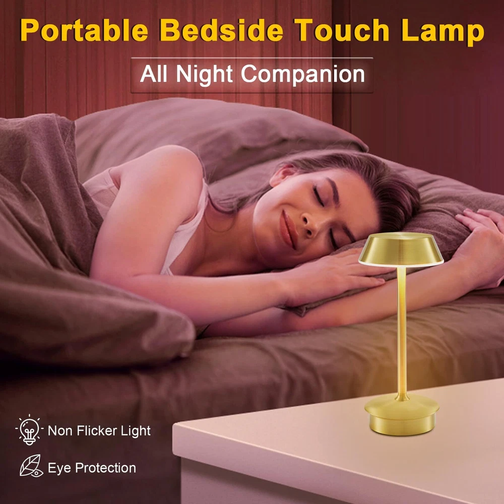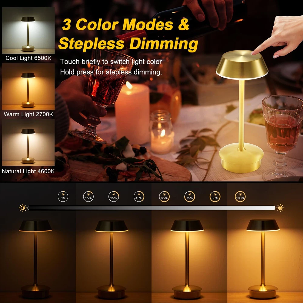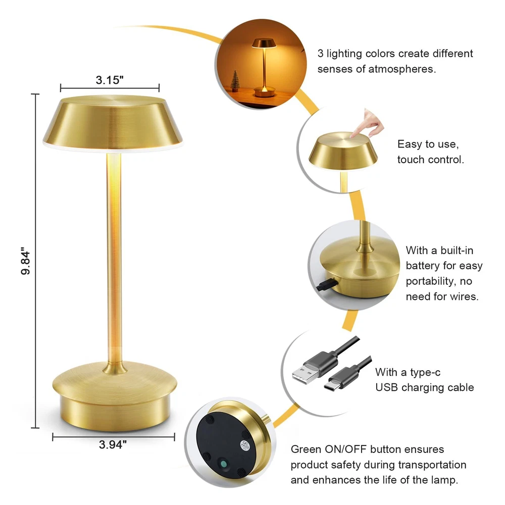 Portable Battery Table Lamp: Our small cordless table lamp utilizes advanced electroplating treatment, providing a sturdy and fade-resistant surface. Compared to other small table lamps on the market, this LED table lamp features 40 bright LED bulbs and a 4000mAh large-capacity rechargeable battery. The maximum brightness is higher, and it also supports longer working time at the same brightness setting. With its small and portable size, this rechargeable table lamp can be placed anywhere, such as hallways, kitchen counters, desks, card tables, and bookshelves. Moreover, it can be carried outdoors for camping or served as a atmosphere decor on patio tables or terraces 3 Lighting Colors & Stepless Dimmable: The cordless led table lamp has a dimmable touch sensor featuring 3 lighting colors: cool light (6500K), warm color (2700K), natural light (4600K). Easy to use! You can switch the light color by tapping the lampshade briefly or by tapping and holding it to adjust the brightness steplessly. The lowest setting of warm light is helpful for better sleep, while the highest setting of natural or cool light provides ambient lighting for home decor, reading, working. It can work for 10 to 48 hours after being fully charged Pretty Decor: This gold table light is made of sturdy aluminum alloy, featuring a minimalist cone design that resembles a giraffe when it lights up. With brushed surface finishing and shining appearance, it will be an attractive indoor and outdoor décor piece absolutely. The anti-glare acrylic panel can gently diffuse the warm light, creating a comfortable ambiance for various scenes, including restaurant, bar, dinner table, coffee table, living room, bedroom, bathroom, office Ideal for Most Occasions: The round lampshade on portable table lamp offers 360 degrees lighting, creating a cozier and more romantic atmosphere. This battery operated table lamp can used as mood lighting to adorn your home or dining areas. Moreover, you can use this cordless lamp for lighting for power outage. It can place in living room, dining room, bedroom, study room, game table, bar, café, guest room, dorm, garden, patio, porch, outdoor camping, picnic, etc. This's a nice gift Versatility and Portability: This small table lamp's cordless design is perfect for use in areas without outlets and flexible to move around everywhere without worrying about cords twisting annoyance. Moreover, the rechargeable table lamp also serves as a reliable light source during power outages. Choosing battery-operated lamp will be a wise choice