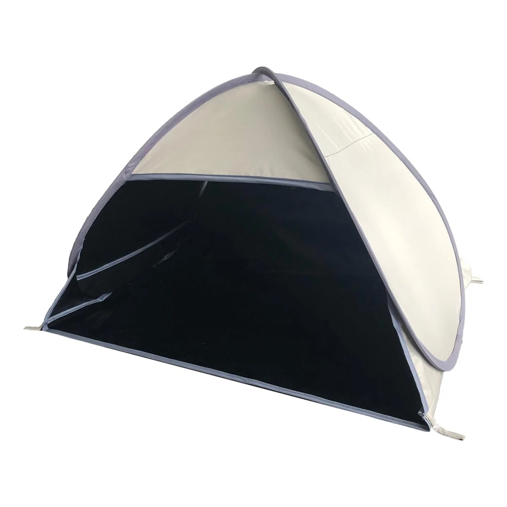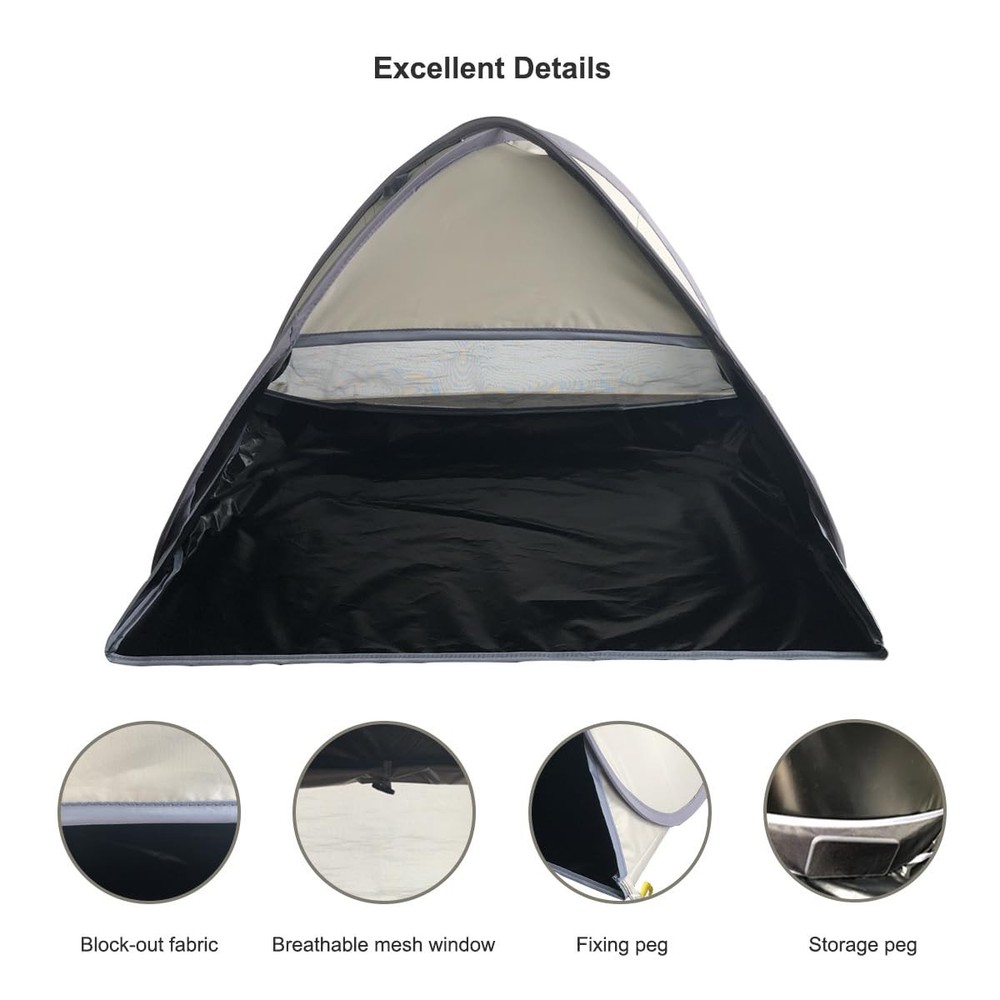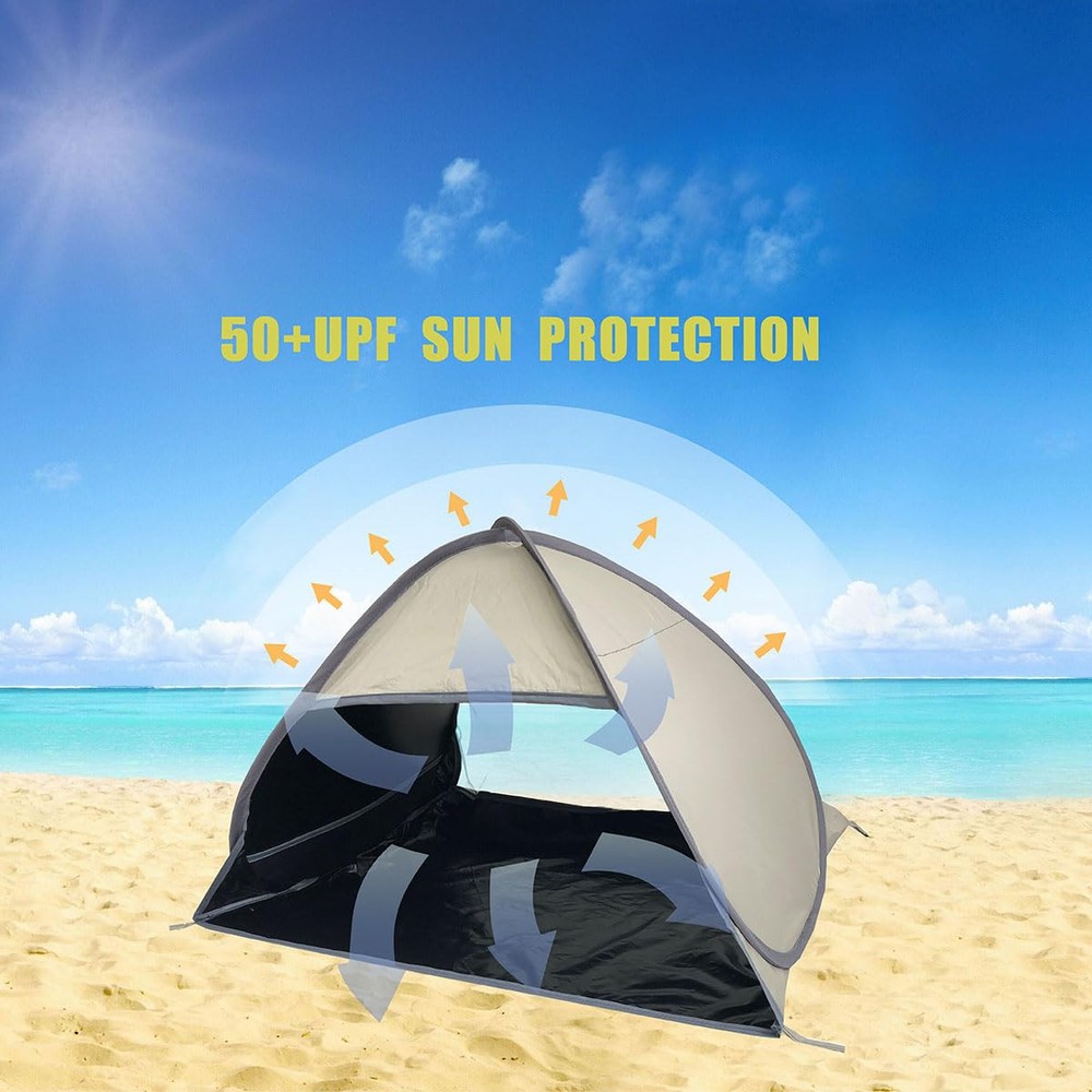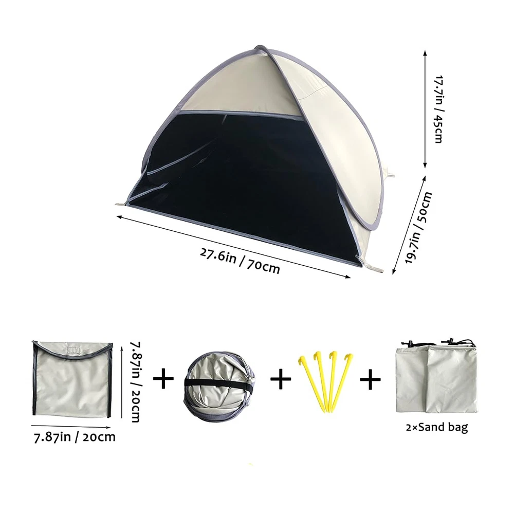 Fixing Methods : The small beach tent comes with a sand bag on both sides and 4 extra sand pegs,which you can make use of to fix the tent,the pop up beach tent won't be blowed away by the wind easily. Breathable Window : The upgraded head tent is breathable than the original one,which is added a meshed window on the back.You can breath the fresh air by opening the window,and view the scenery arround. Good Shading : Made of 190T black coated ployster,the mini beach sun shelter can be as a head tent to block out,it can also be a good shelter for small animals such as dogs/cats. Varied Purposes: Apart from the original function as a head tent , the beach canopy can also be a small dog beach tent , even you can put a laptop in it to work outside. Complete Accessories : A small pop up beach tent / two sand bags/ 4 sand pegs / a storage bag / an instructions are all included.
