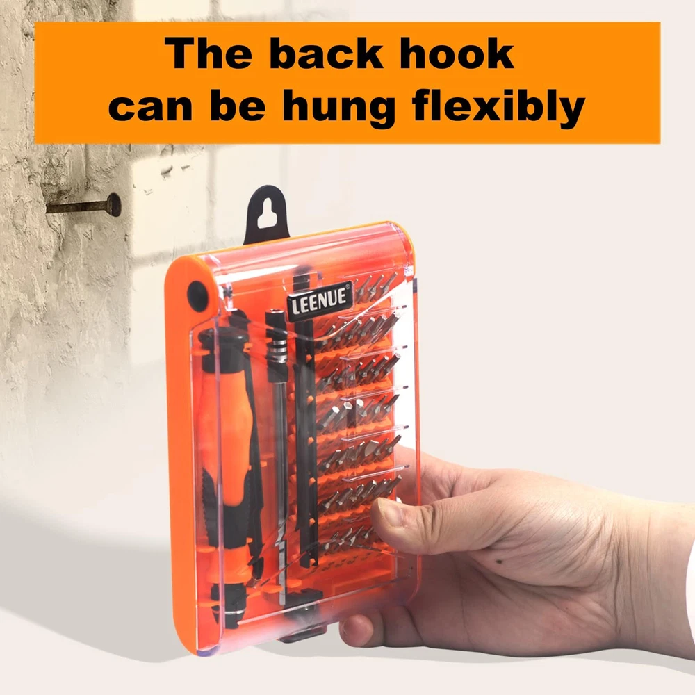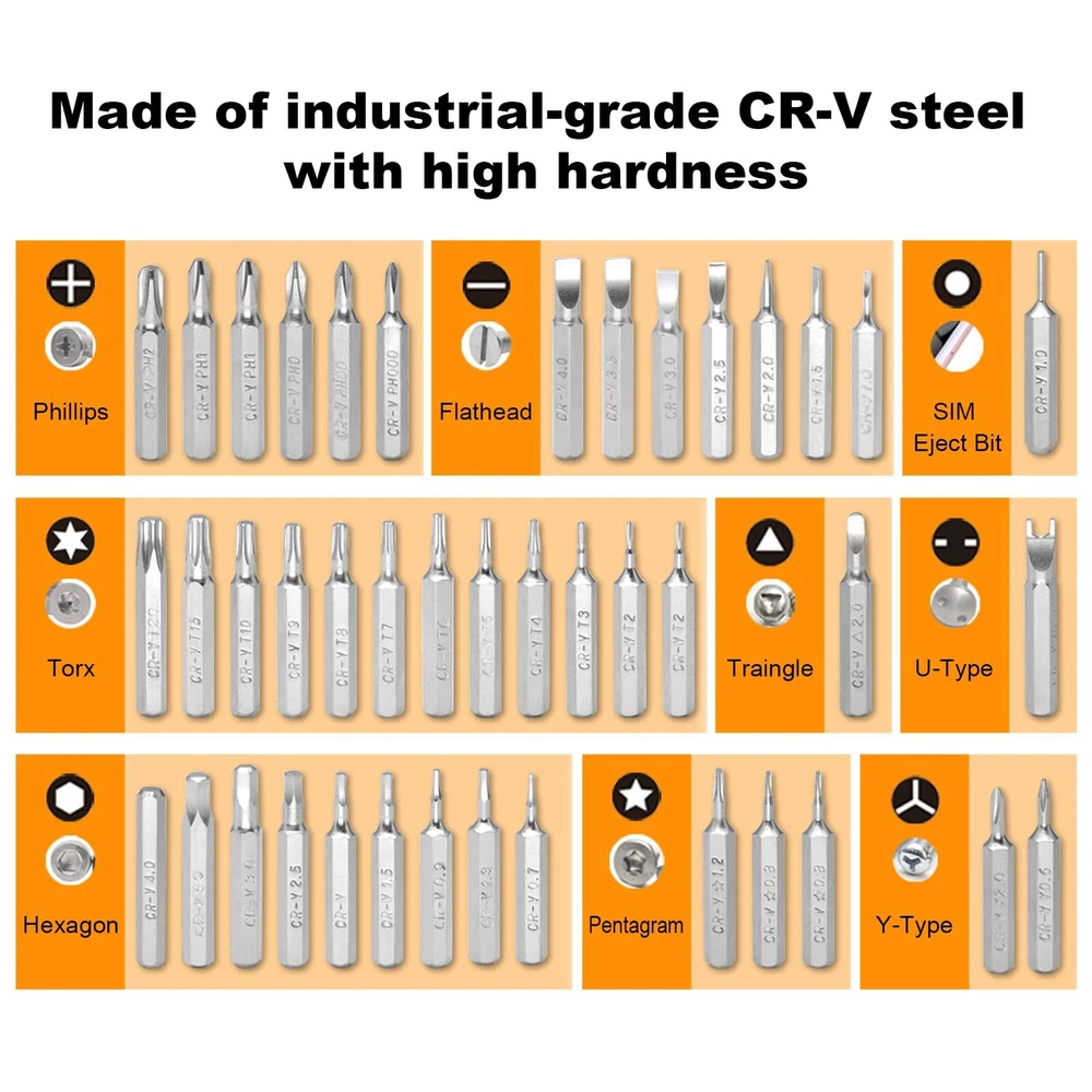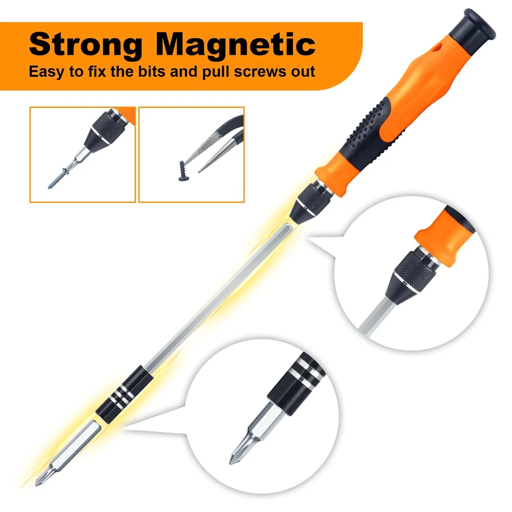 VARIETY OF BITS - This mini screwdriver set comes with a box with 42 different shaped screw heads, divided into 9 types. These types include Phillips, Torx, Triangle, Flathead, Pentalobe (Star), Hex, U-Sharp, Tri-wing, and SIM card eject pin, among others. DURABLE & STURDY - This set includes 42 precision screwdriver heads made of CR-V steel after high-temperature treatment. It has high hardness and good corrosion resistance. This mini screwdriver set is perfect for computers, smartphones, laptops, cameras, game consoles, glasses, watches, toys, and other electronic repair works. HUMANIZED DESIGN - Our magnetic driver ensures stable adsorption of screwdriver heads, making it easy to remove screws and prevent them from falling. The stainless steel pliers and a 4.72-inch extension rod assist you in working in narrow spaces. EASY STORAGE - The spring-loaded box helps organize accessories, eliminating the worry of losing or mixing them up. The box is clearly marked with different types of heads, allowing you to find the one you need quickly. The back of the box also features a hanging hole, enabling easy storage on a tool wall. WHAT YOU GET - This pack includes a magnetic mini screwdriver set with 42 heads, a non-slip handle, an extension rod, and pliers. Rest assured, all our products come with an 18-month warranty, lifetime technical support, and 24-hour friendly customer service.