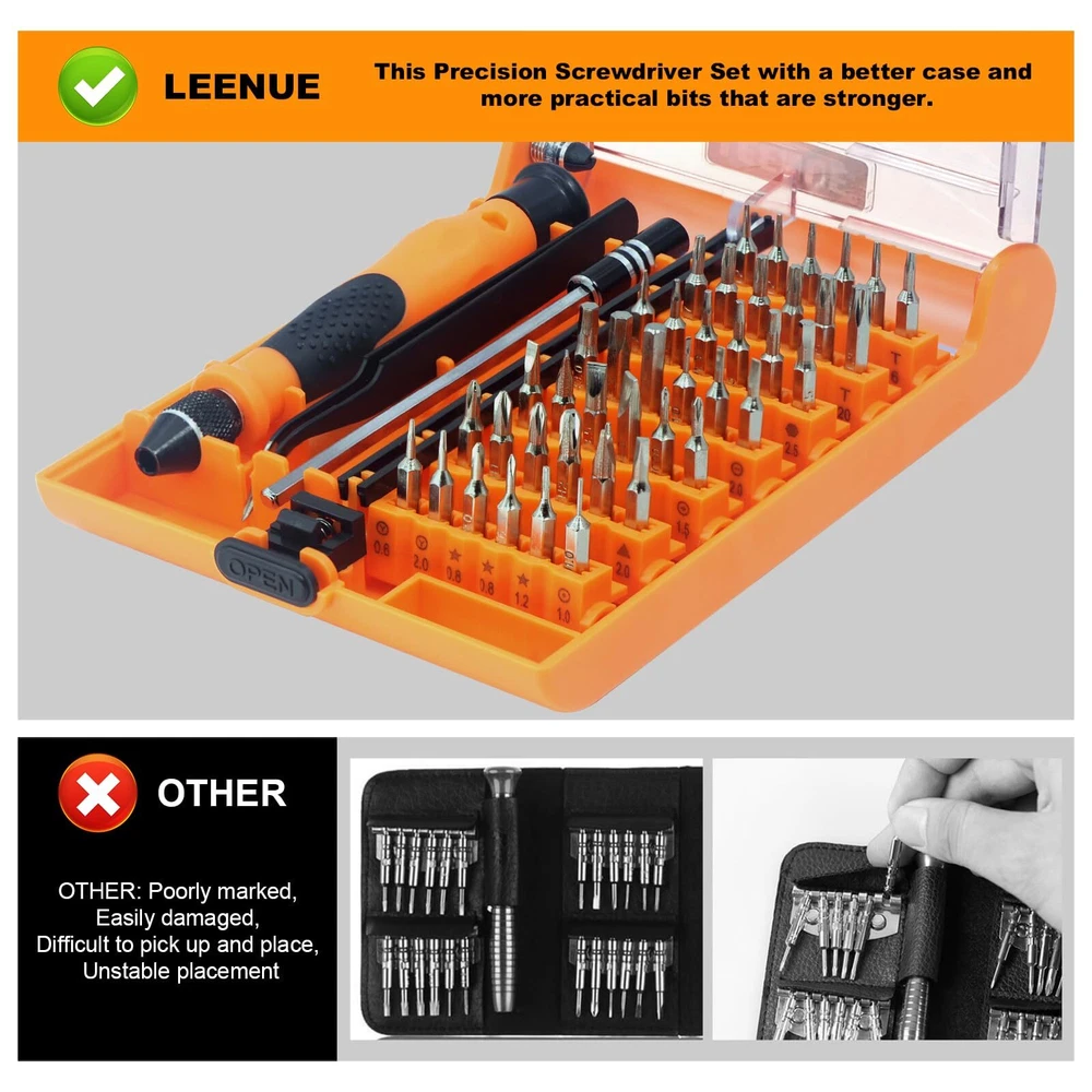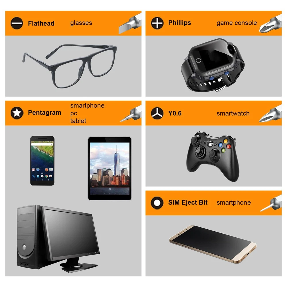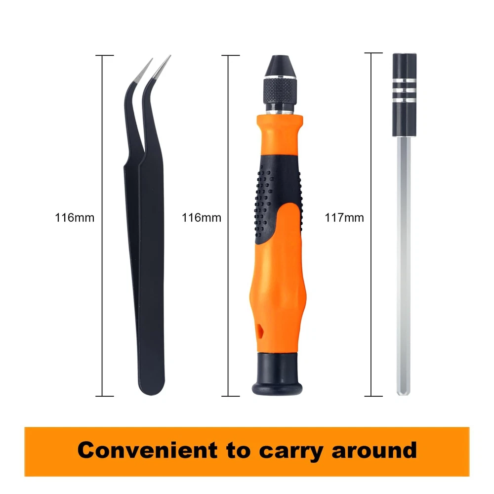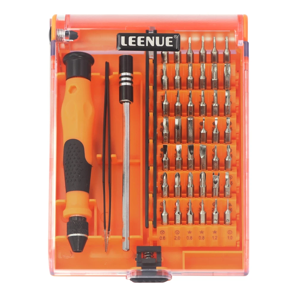 VARIETY OF BITS - This mini screwdriver set comes with a box with 42 different shaped screw heads, divided into 9 types. These types include Phillips, Torx, Triangle, Flathead, Pentalobe (Star), Hex, U-Sharp, Tri-wing, and SIM card eject pin, among others. DURABLE & STURDY - This set includes 42 precision screwdriver heads made of CR-V steel after high-temperature treatment. It has high hardness and good corrosion resistance. This mini screwdriver set is perfect for computers, smartphones, laptops, cameras, game consoles, glasses, watches, toys, and other electronic repair works. HUMANIZED DESIGN - Our magnetic driver ensures stable adsorption of screwdriver heads, making it easy to remove screws and prevent them from falling. The stainless steel pliers and a 4.72-inch extension rod assist you in working in narrow spaces. EASY STORAGE - The spring-loaded box helps organize accessories, eliminating the worry of losing or mixing them up. The box is clearly marked with different types of heads, allowing you to find the one you need quickly. The back of the box also features a hanging hole, enabling easy storage on a tool wall. WHAT YOU GET - This pack includes a magnetic mini screwdriver set with 42 heads, a non-slip handle, an extension rod, and pliers. Rest assured, all our products come with an 18-month warranty, lifetime technical support, and 24-hour friendly customer service.