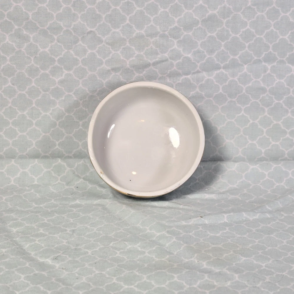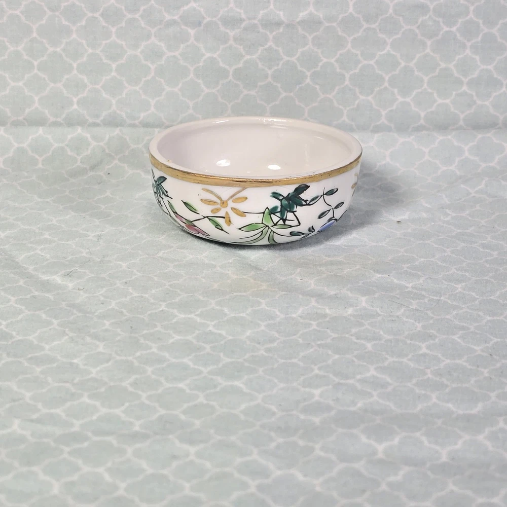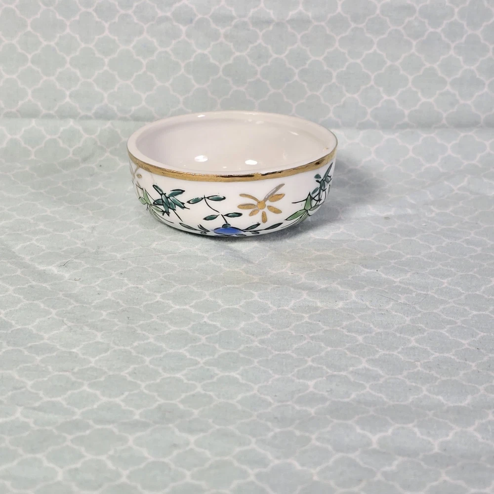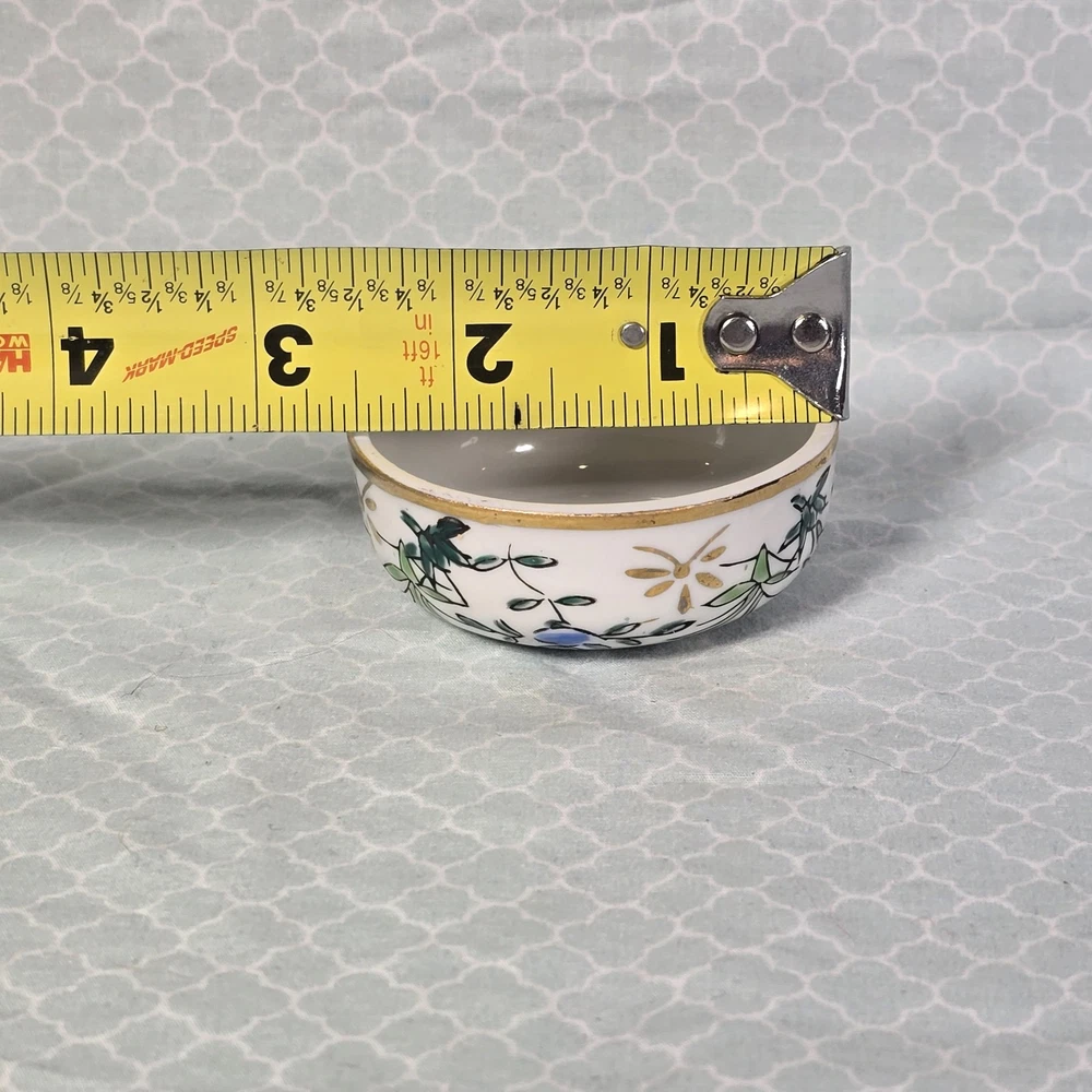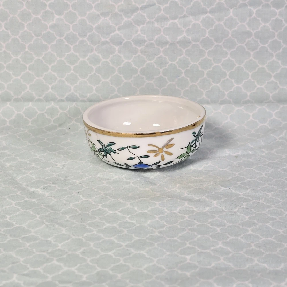 This small trinket dish features a floral painted design on a white ceramic or porcelain material with a gold rim. It is perfect for holding small items like jewelry or keys, adding a decorative touch to any space.