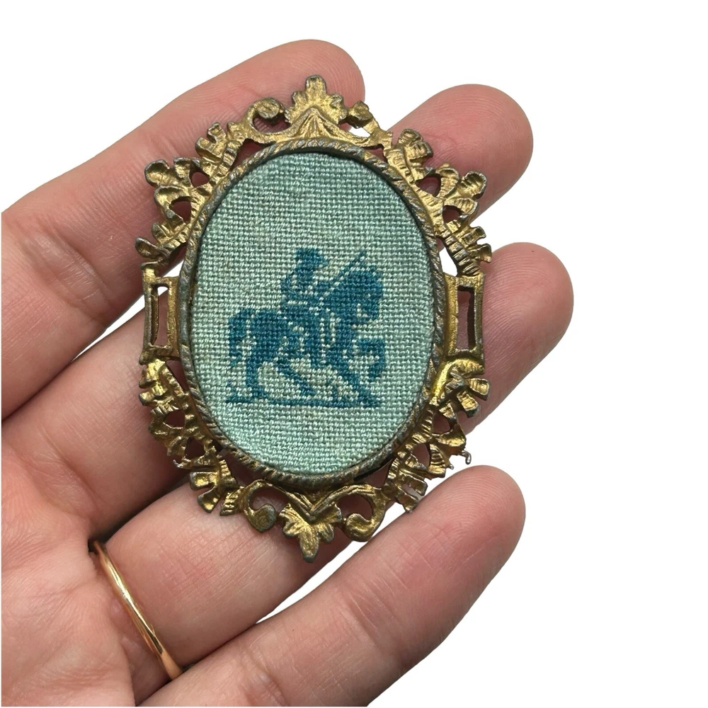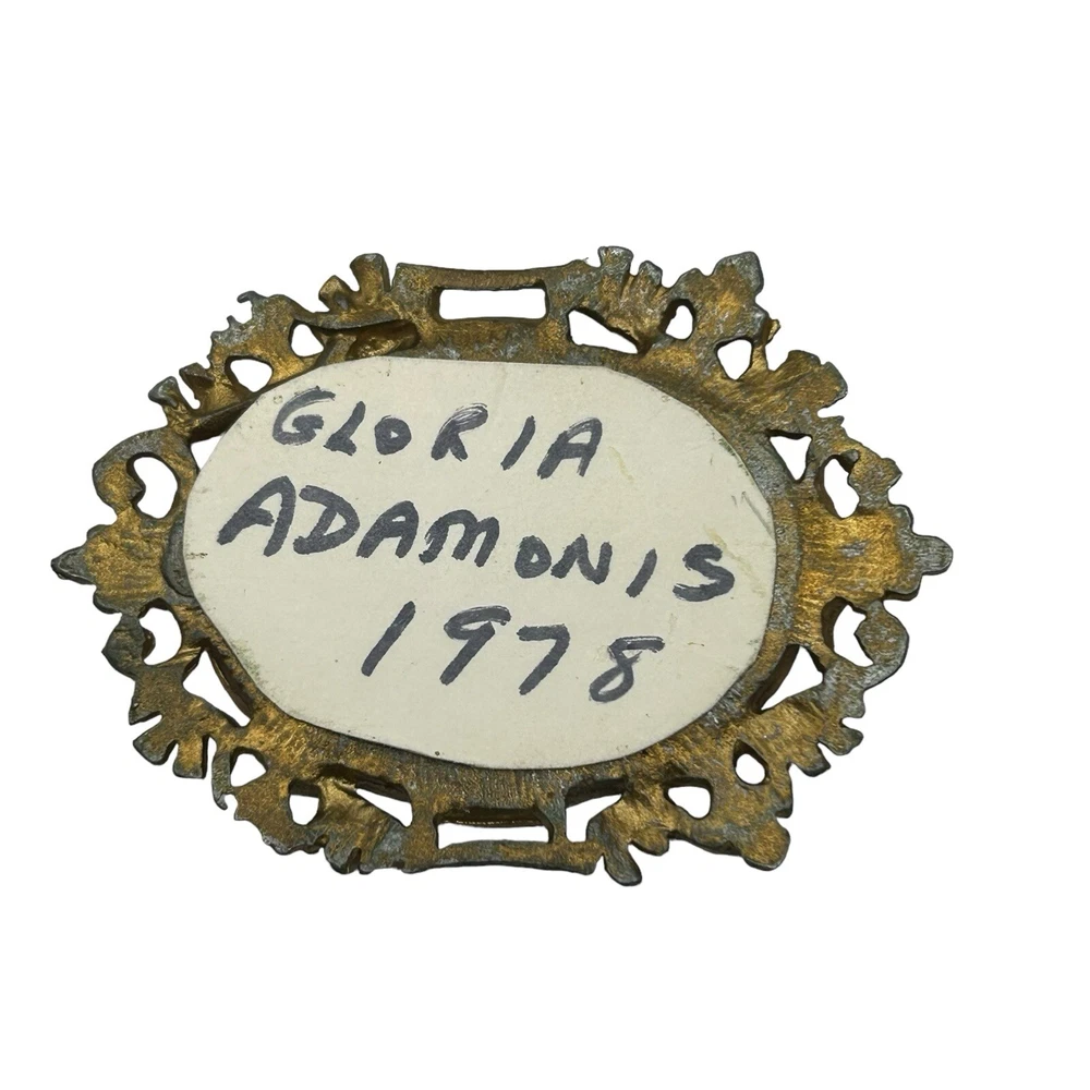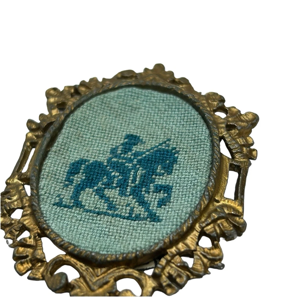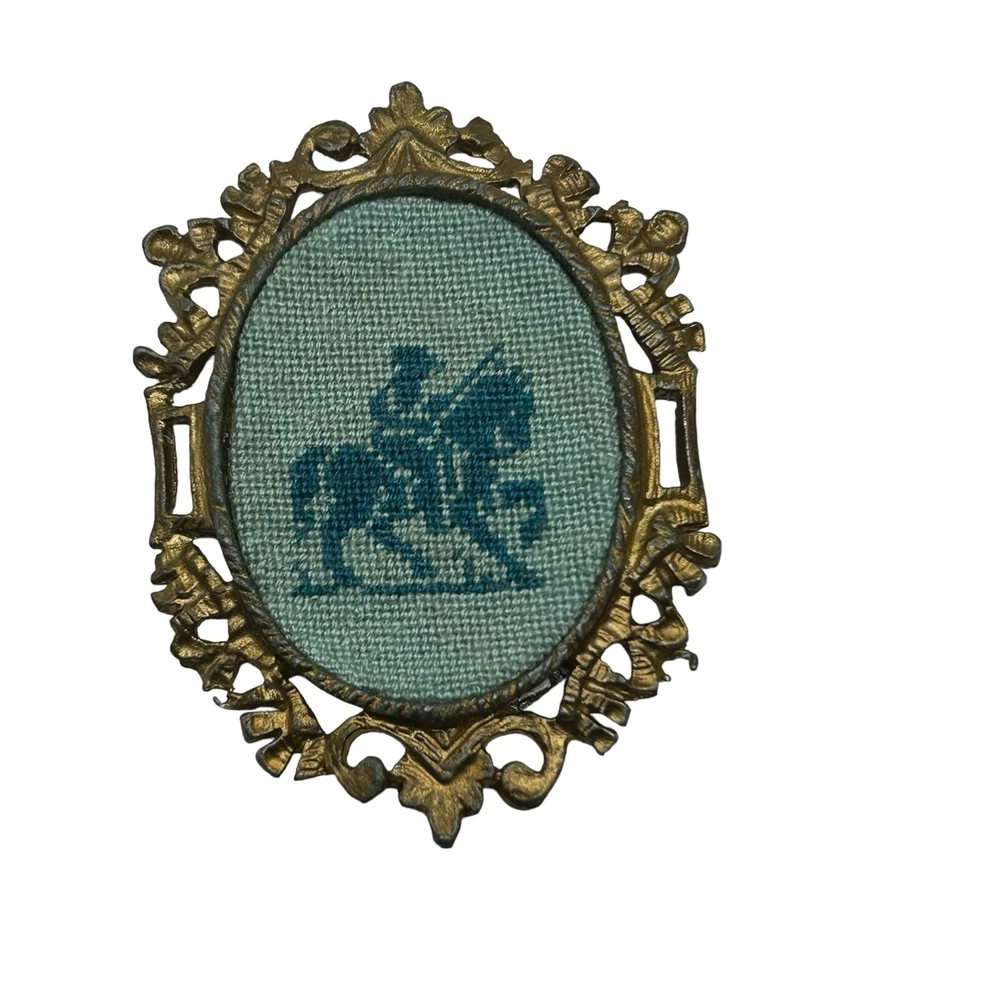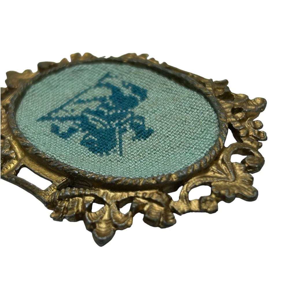 Small Vintage Needlework Art in Ornate Oval Brass Frame Matador Signed 1978 A unique and lovely finished needlepoint artwork handheld sized that can be shown in a number ways. Signed on the back with artist’s name and year. It appears it can be used as a necklace with a chain as well! Item shows no major damage. No damage at all to artwork. Expect age appropriate wear to frame including minor surface scratches, tarnish, and loss of finish but nothing that takes away from its charm. Please see all images for further details. Be sure to see all our other items for possible bundle and shopping deals! Will pack with extra care and attention that vintage items require. Quick shipping guaranteed. Returns accepted at buyer’s expense. Display boxes and props not included unless otherwise noted. Own this lovely item!