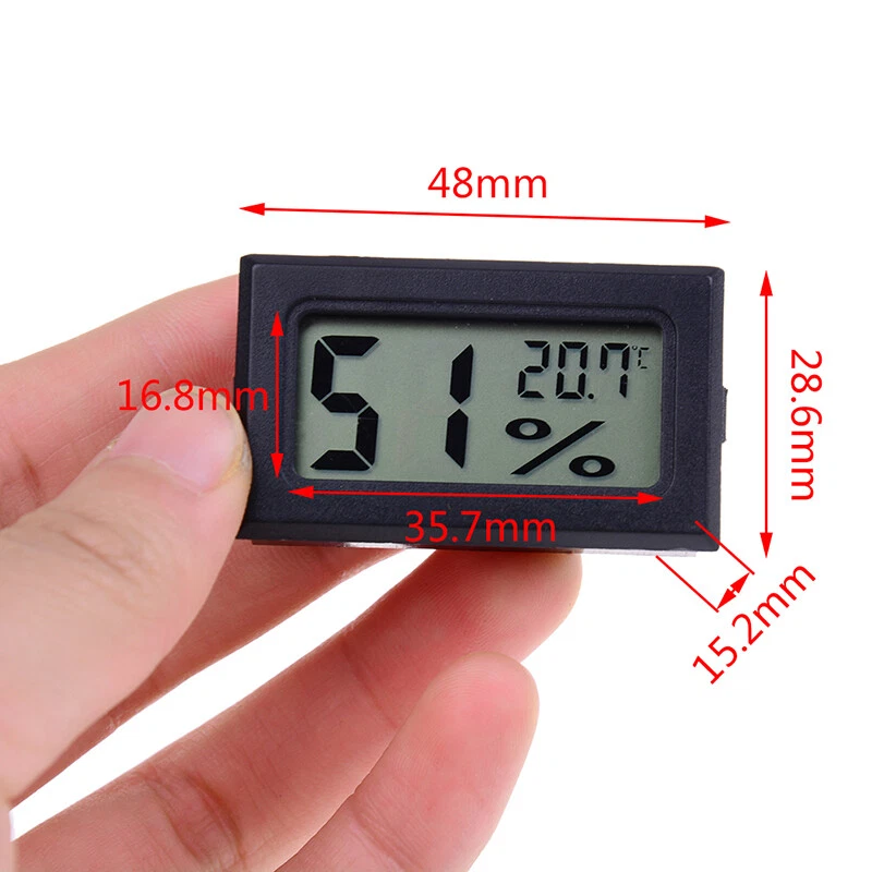 Features: Color: Black,White(Random Color) Temperature measurement accuracy: ± 1.0 ℃(at room temperature ) Temperature measurement range:-50℃-70℃ Humidity Sampling cycle: 10 seconds Relative Humidity measurement range: 10% -99% Humidity Display Resolution: 1% Humidity measurement accuracy: ± 5% (at room temperature ) Size: 48 × 28.6 × 15.2 (mm) LCD Size:35.7*16.8mm Display: LCD Rated Voltage: DC1.5v(2 x AG13 button batteries) Package includes: 1Pcs (Random Color,2 button batteries included) Note:Real color could be a little bit different from stock photos due to screen reflection). The indoor temperature and humidity display Default Celsius temperature. On Dec 5, 2024 at 09:56:38 PST, seller added the following information: