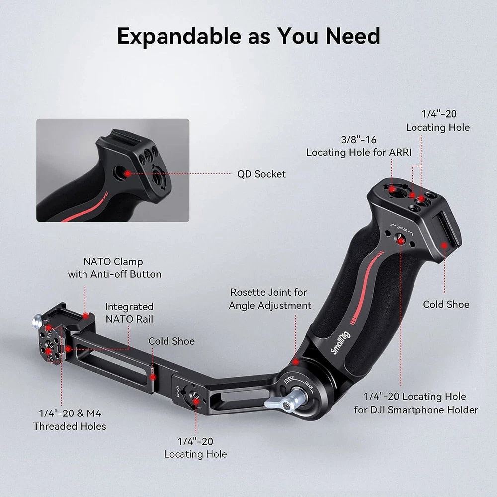 SmallRig Sling Handgrip for DJI RS 2|RSC 2|RS 3|RS 3 Pro|RS 3 mini 3028 About this item For DJI RS 3 Mini / RS 3 / RS 3 Pro / RS 2 / RSC 2 : SmallRig Sling Handgrip 3028C designed for the DJI RS series reduces arm fatigue and adds stability to low-angle gimbal shots. It can support up to 8 kg / 17.6 lbs and adopts a longer arm bracket, making it more versatile for RS 3 Pro and larger camera setups. Optimized Ergonomic Design : This gimbal sling handle has been updated with a curved design that better fits ergonomics. Its grip length has been increased with finger stops, providing a more comfortable and secure grip for larger hands. Constructed with a combo of silicone and aluminum alloy, it is lightweight but strong. Its sleek design and compact structure match perfectly with the stabilizer. Quick Release Features : It securely attaches to your gimbal with a NATO clamp, with anti-removal stud for safe and quick operation. On this version we integrate a NATO rail on the side, allows for mounting SmallRig 3026B to provides a good spot for your monitor. Additionally, a QD socket is added, providing the option to mount a QD neck or shoulder strap for additional support. 180 Degree Adjustment : SmallRig gimbal handgrip offers 180° adjustment through its built-in rosette joint, giving you the flexibility to shoot from various angles and reducing the strain on your arm. The rosette joint can be detached, allowing you to use the handgrip on its own as a rosette handgrip. Abundant Mounting Points : It features multiple 1/4"-20 and 3/8"-16 threads for ARRI, enabling you to mount magic arms 2115/3874 or monitor mounts 2903B. Besides, two cold shoe mounts are situated on top and side, allowing you to attach a wireless mic or video transmitter. \ Notice: Max Payload: 6 kg Compatibility: DJI RS 2 DJI RSC 2 DJI RS 3 DJI RS 3 Pro DJI RS 3 Mini In the Box: Handle × 1 Specifications Product Dimensions: 199.0 x 68.3 x 54.5mm Package Dimensions: 221.0 × 112.5 × 40.0mm Net Weight: 310.0 ± 5.0g Package Weight: 375.0 ± 5.0g Material(s): Aluminum Alloy, Silicone Compatible Model for DJI RS 2 / RSC 2 / RS 3 / RS 3 Pro / RS 3 mini Country/Region of Manufacture China MPN 3028B Compatible Brand For DJI Brand SmallRig Features Quick Release, Adjustable Material Aluminum Alloy, Silicone To Fit Camera Type Handgrip Model 3028B Item Weight 0.65 lbs