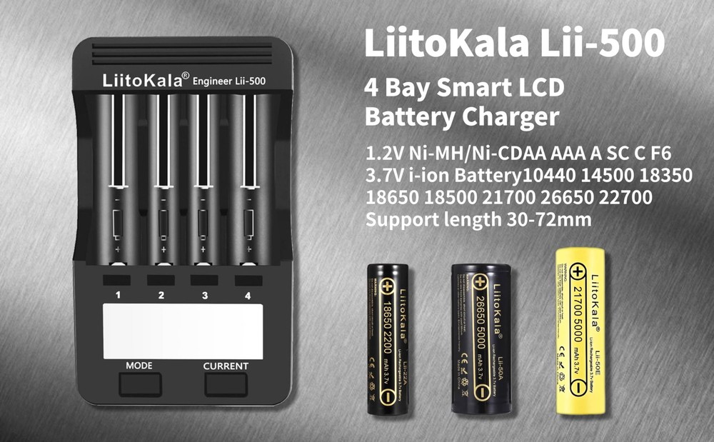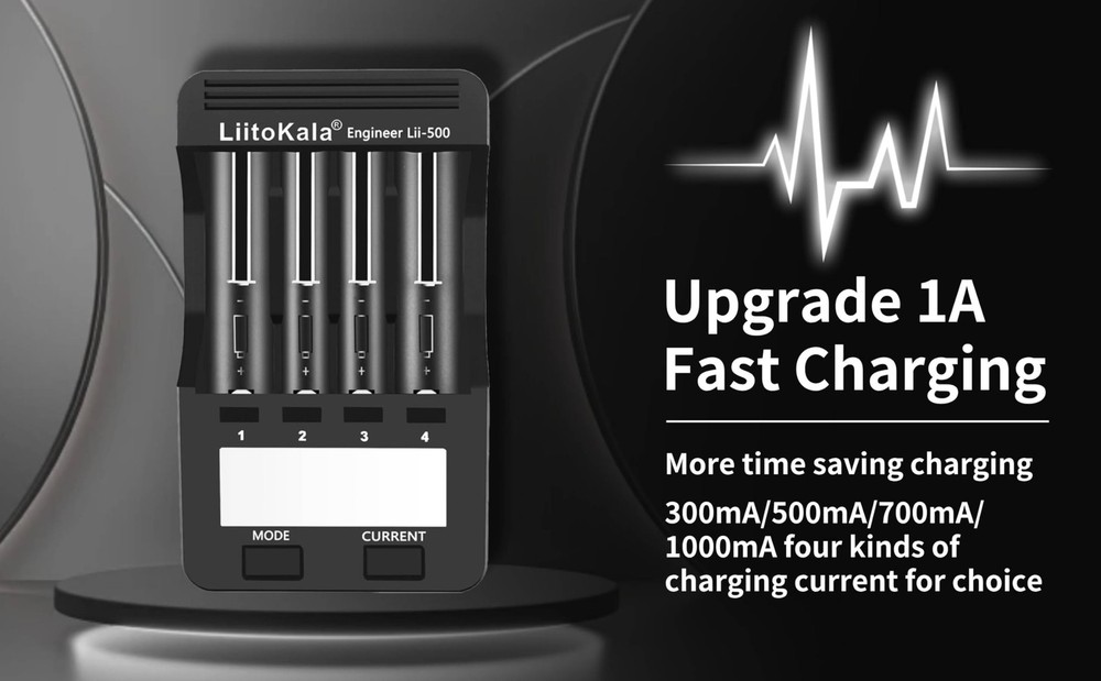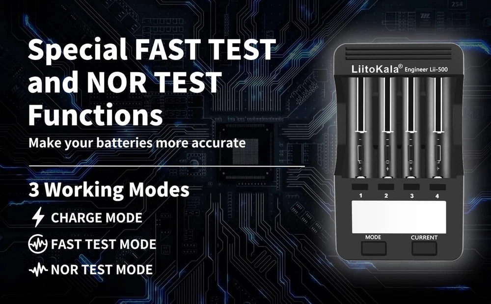 Battery Types and Sizes:Four charging current regulator(300mA/500mA/700mA/1000mA),Batteries of different specifications can be charged simultaneously our good ( Li-ion IMR INR ICR 25500 22650 18650 18490 18500 18350 16340 RCR123A 14500 10440 Batteries, Ni-MH Ni-Cd AA AAA ). Indegenhhat LED Screen:the volt, current, time, capacity and Internal rebakooe apparently, the Clisas arh, sak tesnel works independently.Can choose different current and baltery is charge, such as Lithium-ion and NI-MH battery.It is very easy to use. Test The Battery Capacity:In the FAST TEST mode, four channels can quickly detect the battery capacity.Lithium-ion battery and NI-MH battery can work independently. There are two processes for the rapid detection of battery capacity, one is discharging, another is full capacity.In the NOR TEST mode, there are three steps in the process of detecting the battery capacity(charging fully, discharging and then charging fully) CHARGE mode, FAST TEST mode and NOR TEST mode can work iron simultaneously(set charging dependently/quickly detecting the battery capacity/Normally detecting capacity) Fast And Efficient Charger: The charger has 300mA/500mA/700mA and 1000mA charge current. 1500mA battery, using 1A charging current, about 1.5 hours full. Other battery charging times are calculated like this. Series of protection functions: over-charging and over-discharging/short ,circuit/activation without any volt/charging between 1.65V-2.2V/Intelligently recognize.
