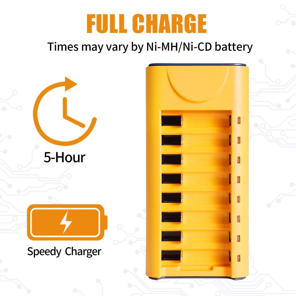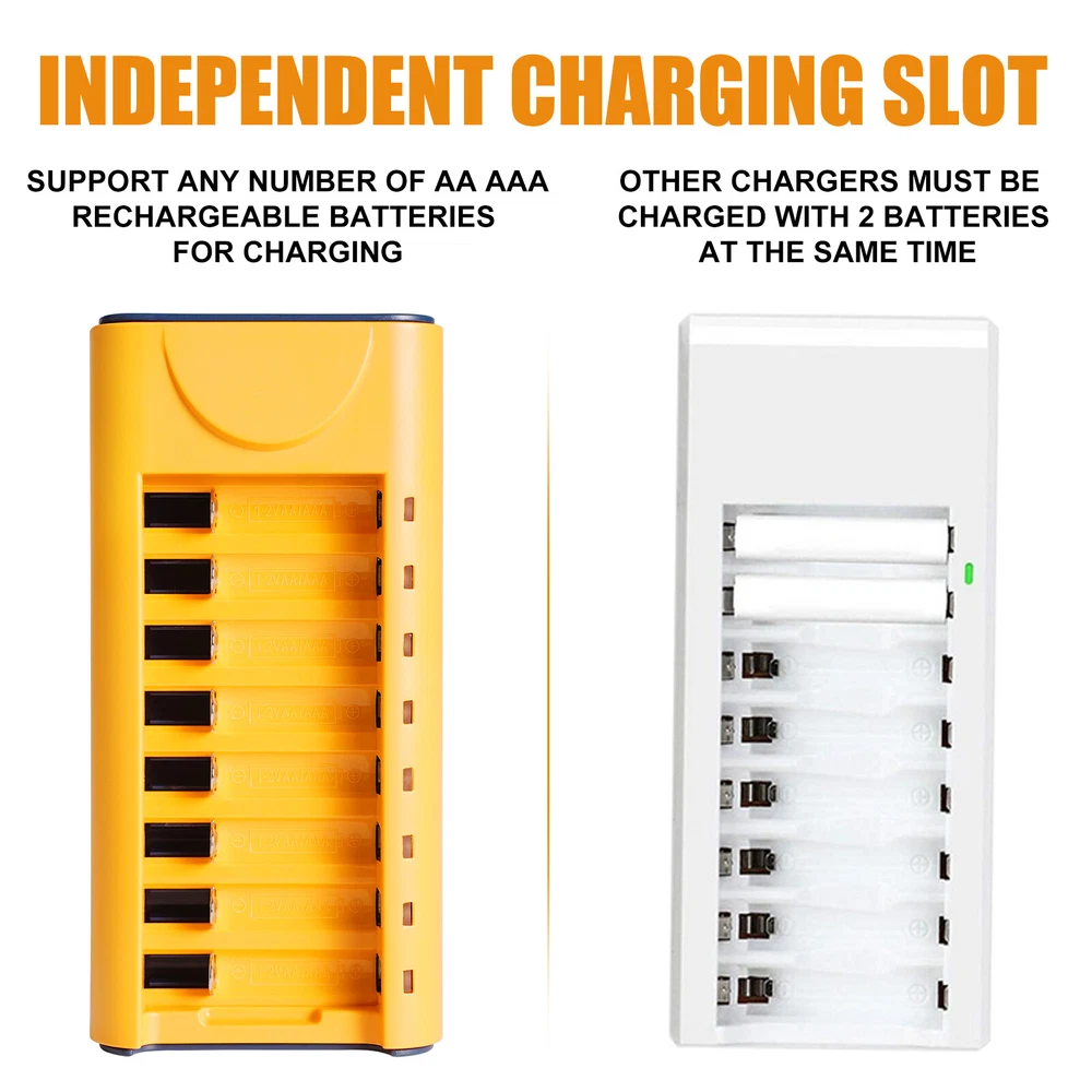 Smart AA/AAA Rechargeable Battery Charger 8 Slot for Ni-MH/Ni-CD 1.2V Batteries Features: 1. 【Smart Rechargeable AA Battery Charger】 AA AAA battery charger 8 bay for Ni-MH Ni-CD rechargeable batteries can charge any quantity in any slot. Single, double or triple ones can be charged, and not necessary to put them in neighboring slots. Besides, you can also mix charge AA and AAA batteries, as long as they are Ni-MH or Ni-CD batteries. 2.【Safety Protection】 Comes with special charge and discharge management circuit. With multiple security protection settings, battery charger aa can effectively prevent reverse, short circuit, overcharge, over discharge, over-current damage to the battery, which makes users using the product without any safety concern. 3.【LED Indicators Charging Display】 This aa aaa battery charger with Red/Green led light display, And the aa rechargeable battery charger will display the status of each rechargeable battery when you insert a battery to charge, the light will turn solid red, only on the port(s) containing the battery, to indicate the battery is charging. The light turns solid green when charging is complete. 4.【USB AA Battery Charger】 USB Powered Universal Intelligent Battery Charger, allows for on the go worldwide portability.the USB charging line can be connected to USB socket, car charger, computer, phone adapter, other USB output equipment to charge. 5. Note: Products with electrical plugs are designed for use in the US. Outlets and voltage differ internationally and this product may require an adapter or converter for use in your destination. Please check compatibility before purchasing. Specification: 1. LED state the charging statues: Power connection, no battery, Green light is always on. Charging - Red light Full charged- Green light 2. Compatible: Can both charge AA and AAA Ni-MH Ni-Cd rechargeable batteries (Do not charge alkaline or Lithium batteries) 3. Input and Output: Input: DC 5V 1A, Worldwide voltage Output: DC 1.2V 200mA, faster for charging 4. Individual fast-charging,LED indicator light, Easy to use AA/AAA/ Ni-MH Ni-CD rechargeable batteries,Perfect Fit 6. Can charge any number of batteries at the same time, independent charging channels 7. Safety Charging, Offer over-voltage over-current protection, short-circuit protection, over-charge protection, over-heat protection, Good Protection Package Included 1 x AA Battery Charger 8 Slot 1 x USB Cable On Feb 2, 2025 at 23:42:20 PST, seller added the following information: