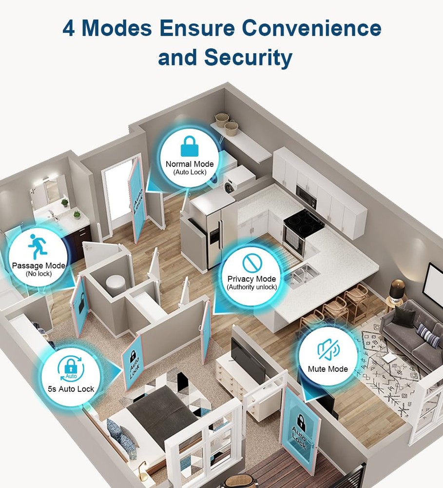 [Secure Your Home with Smart Door Lock] Our fingerprint door lock offers easy unlocking options using your unique fingerprint or APP to your home. This smart door Knob provides the option of using mechanical keys for entry, offering added peace of mind in case of emergencies. [4-In- 1 Keyless Entry Door Lock for Bedroom] The smart lock for bedroom offers various operating modes to suit your needs. Switch the thumbprint door knob’s convenience of Passage Mode, the standard operation of Normal Mode(5s auto lock), the fingerprint door knob’s privacy of Privacy Mode, or the quietness of Silent Mode, you can easily customize the lock settings by rotating the thumb turn to match your smart home lifestyle. [Convenient App Control of finger print door knobs] Easily set fingerprints, check access records and share or add access with family members in the APP. App Control should within Bluetooth Range. If you want remote control of the smart door lock, you need to purchase a gateway separately. [Worry-Free Smart Door knob] The smart lock for bedroom doors adds an extra layer of to your home. Whether you're looking for a door knob with lock for your apartment or a smart home device to keep your home secure, our fingerprint door lock has what you need. The fingerprint door lock bulit in a rechargeable battery with a 1-year battery life that can be charged by USB Type-C power supply. [Easy to Install & Last to use] Featuring easy installation, this smart door lock is also a reliable choice not only for homes but also for AirBnB, or apartments. The fingerprint lock installs easily with a screwdriver, and the biometric door lock is ideal for anyone who desires privacy. Tips: When install interior knob, both Exterior and Interior Knobs have to be inserted according to the 'UP' sign on the top so that they can stay in place. And the spindle bar is in the vertical position. The thumb turn adjustment arrow points to the center dot and the 'UP' sign, then the arrow is inserted upward on the mounting, you can use a little force to get the rear lock completely in.