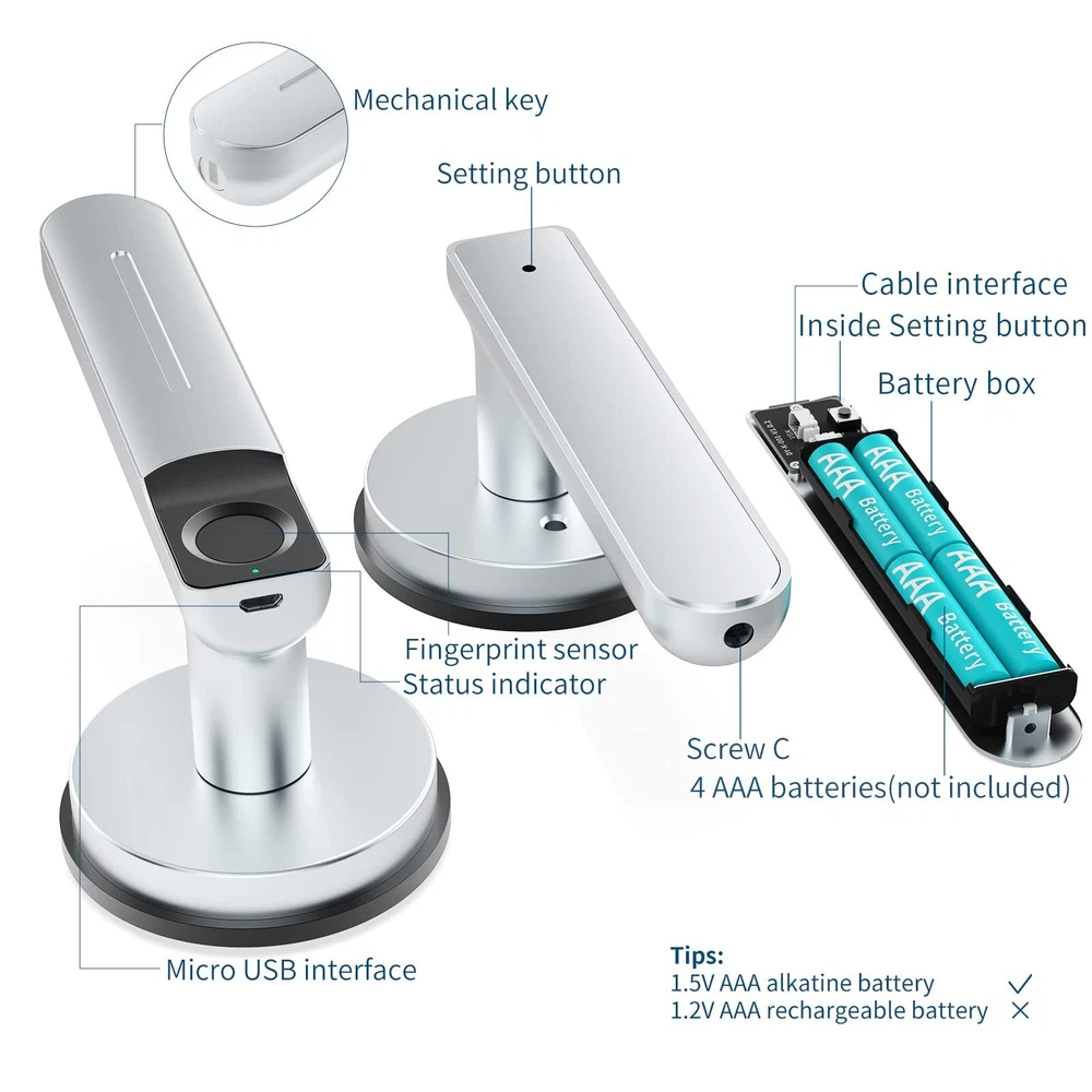 【Fingerprint Identification】:Smart fingerprint door lock recognizes your fingerprint in just 0.3 second ,keyless entry door with touch 【2 ways to unlock】:Fingerprint unlock leads to a convenient life and Mechanical key as back up or use in when batteries run out 【Humanized design】:Max 100 group fingerprints, Low battery alert with red LED 5times flash, USB power port(USB cable included),adjustable door handle for left or right door, auto-lock and normal-open modes , just feel at ease to use smart door handle 【DIY installation】:Fits most standard single-cylinder US doors. The simple installation takes minutes with a screwdriver(included). No extra drilling. Door thickness: between1-3/8"(35mm) to2-3/16"(55mm), adjustable latch2-3/8"(60mm)or 2-3/4"(70mm).Check your door size before purchase 【Buy with Confidence 】: Your satisfaction is our greatest joy. We not only provide detailed installation guide and clear user instruction but also 12 months and free life-time technical support. If you have any questions , please feel free to