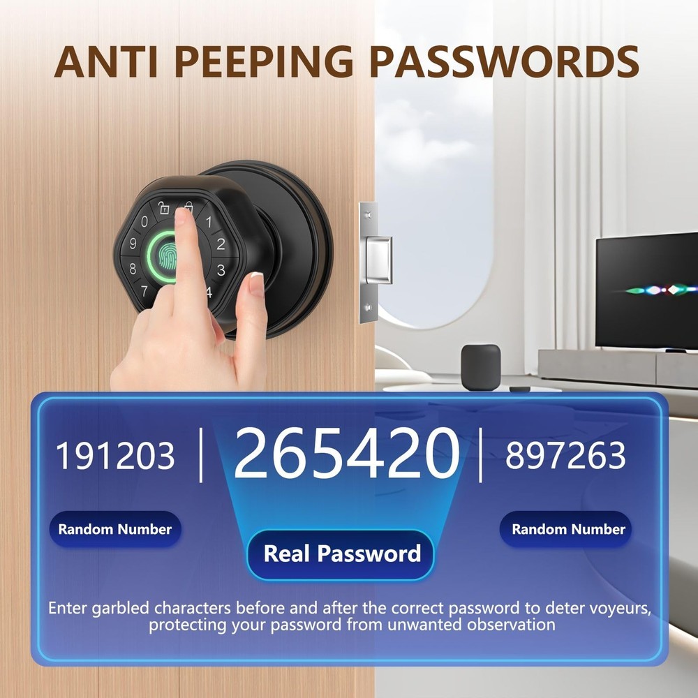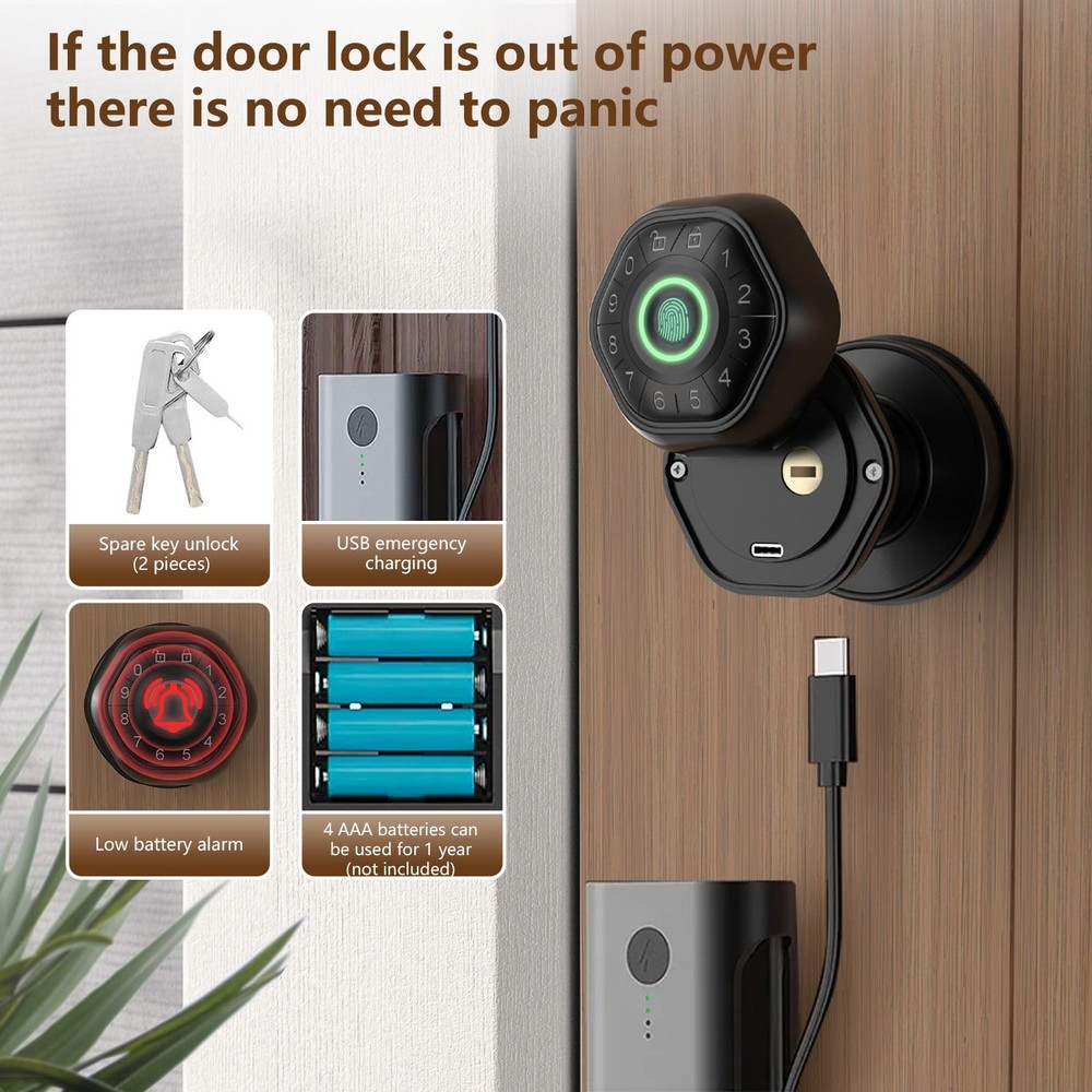 1111 【Four-in-one】Fingerprint bedroom door lock: anti-peeping password + fingerprint unlocking + 2 mechanical keys + APP control, 0.2 seconds recognition, door opening within 1 second, 100 fingerprints and 100 passwords can be added 【Easy to Install】Suitable for both left and right doors. Bedroom Smart Door Lock is designed to fit U.S. standard doors with back panel sizes of 2-3/8" (60mm) and 2-1/8" (70mm), and door thicknesses from 1-1/8" to 2"- 1/8" (30mm-55mm) 【Upgraded Large Fingerprint Sensor】The new 140*140DIP sensor has a 35% larger recognition area than the old 120*120 sensor, making the recognition more accurate and stable. 【USB charging】Smart door locks have a low volume alarm and are equipped with USB ports for emergency charging. It requires 4 AAA batteries (not included) 【After-sales Support】. Responsive customer service within 24 hours, if you have any questions about our door locks, please contact us for a 30-day money back guarantee, 12-month warranty, and lifetime technical support.