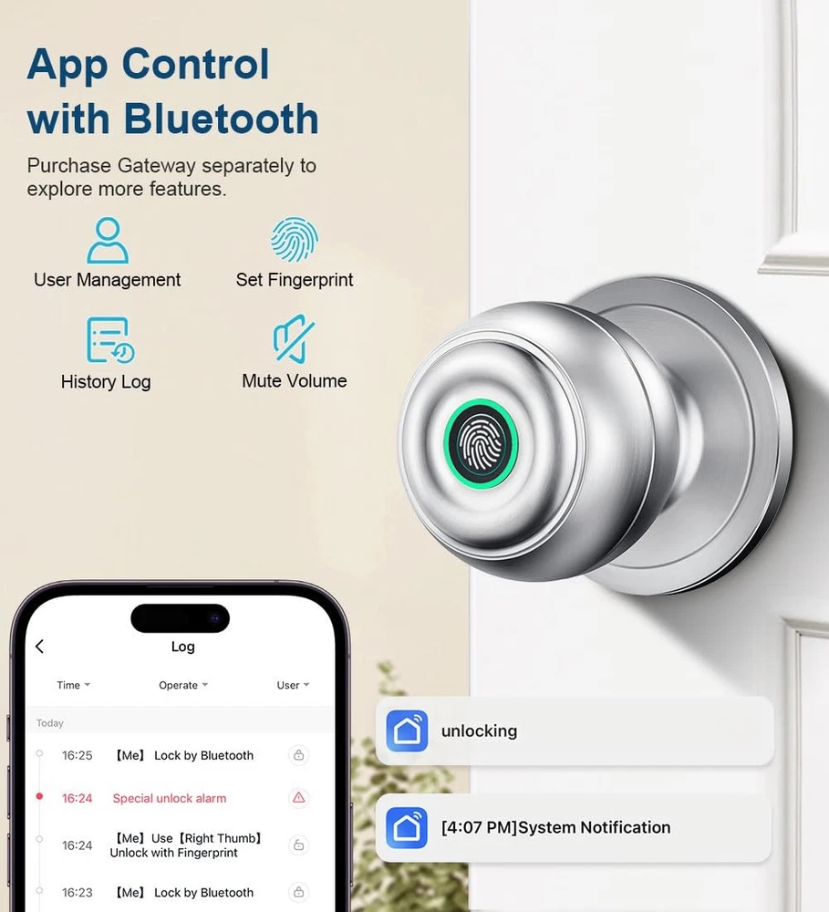 Fingerprint Door Lock, Smart Fingerprint Door Knob with Lock, Biometric Door Lock with App Control & Key, Keyless Thumbprint Entry Door Lock for Bedroom, Front Door, Home, Apartment Office-Silver 3-IN-1 BIOMETRIC DOOR KNOB: The ultimate security solution for your smart home or office. Whether you prefer the convenience of a thumbprint door knob, the security of App control, or the reliability of traditional keys, the smart door knob meets your need. Great fingerprint door lock for bedroom, living room, apartment etc. THREE MODES FINGERPRINT DOOR KNOB: Designed to provide convenience and enhanced privacy to homeowners. Easily switch modes by rotating your thumbprint around the smart door knob. The modes are passage mode, entrance mode, and privacy mode. Perfect bedroom door knobs with lock to keep unwanted guests like roommates or kids from entering your peaceful space. SMART AND CONVENIENT: finger print door Knobs come with an app (Detailed in the manual) to manage fingerprints, view unlocking records, lock/unlock and privacy mode to help create smarter door locks for bedrooms. Note: App Control within Bluetooth Range. If you want Wi-Fi control, need a separately purchased gateway. Whether you own a hotel or Airbnb, you can grant temporary access to guests and revoke it easily, all from your smartphone. SECURITY DESIGN DOOR LOCKS: The biometric door knob with lock blends style and functionality. It can recognize your fingerprints, store 20 fingerprints, and 5s Auto locking feature to ensure your home is safe. Fingerprints are stored locally and not uploaded to the cloud to ensure your family's privacy. This keyless entry door lock also features a visual power display and a low-battery alarm function. Note that the battery is not removable and life may vary depending on how often the biometric door lock is used. Please check the dimensions before purchasing the smart lock. RECHARGEABLE & EASY INSTALLATION: The fingerprint door lock has a built-in 400mAh rechargeable battery that takes 3 to 4 hours to charge fully(Need to use USBA-TypeC cable). The door lock is easy to install with a screwdriver and fits most US doors. Tips: When install interior knob, both Exterior and Interior Knobs have to be inserted according to the 'UP' sign on the top so that they can stay in place. And the spindle bar is in the vertical position. The thumb turn adjustment arrow points to the center dot and the 'UP' sign, then the arrow is inserted upward on the mounting, you can use a little force to get the rear lock completely in.