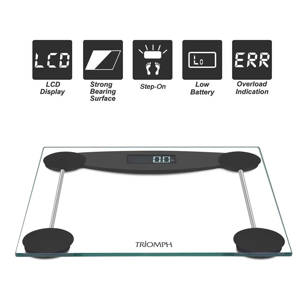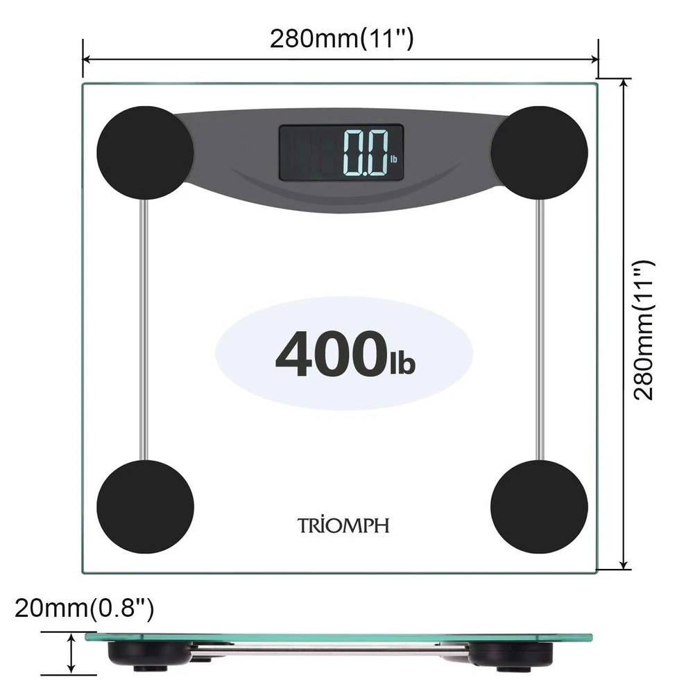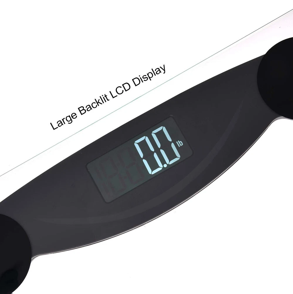 Key features - high-gauge precision sensors- color: Black, silver- product dimensions: 31328323.5mm , 3.7 pounds - shipping weigh: 4.6 pounds - weight capacity: 11lbs-400lbs - LCD display : 73mm with blue round backlight- auto on/off, slip-guards keep the scale firmly in place- power: 4 1.5v AAA lithium batteries required (included) - weight capacity: 5-180kg/11lb-400lb (easy to switch between kg lb. st)details: Staying fit and healthy is a step away, the digital bathroom scale is an essential part of any sustained fitness program to help you keep your fitness program on track and motivated. Announce your commitment to fitness with this precise, sleek-looking bathroom scale. Step-on function: "step on" technology allows you to simply step onto the scale and in seconds you will have an accurate readout to the 2lbs on the LCD display with cool-blue backlight. Automatically turn on and turn off after 10 seconds of inactivity to conserve battery power. Measurement function: Larger font and round screen provides you readability of you and your family members' weight. Three weight unit settings allows you to change the measurement unit readability from pounds to kilograms to ibs-stone. Safety : 6mm high-strength tempered glass platform offers a stable place to stand and is durable to withstand frequent use. And slip-guards keep the scale firmly in place. Note: 1. Body weight naturally fluctuates throughout the day. People are lighter when they wake up, heavier in the middle of the dayand lighten again toward the end of the day. 2. This scale is designed for use on flat, hard surfaces. Measurements will be compromised on not ideal surfaces.3. After changing batteries or moving the scale, take a moment to let it calibrate itself before measuring. SMART STEP-ON TECHNOLOGY : Instant accurate readout as soon as you step on the scale. Non-slip feet will not scratch floors, 6mm tempered glass platform provides exceptional sturdiness,safety and comfort. HIGH-END FUCTIONS: Made of high quality impact-resistant tempered glass that is 4 times stronger than common glass, and 4 high precision sensors for accurate weight measurements up to 400lbs/180kg, 3-unit modes (kg, lb, st:lb). RELIABLE READINGS : Sleek and Stylish design, smooth edge, features a large round LCD screen that is illuminated by a cool blue backlight, easy to read even in the most dimly lit areas. EASY TO USE : Auto-zero, Auto-on and Auto-off. Includes low battery and overload indication to maximize battery life and extend product lifespan, runs on 2 AAA batteries (included). OUR GUARANTEE: is a Canada brand with 10+ years of history, we stand by our products 100% with 1-year guarantee, 30-days money-back service and lifetime support. Local U.S. Customer Service based office.