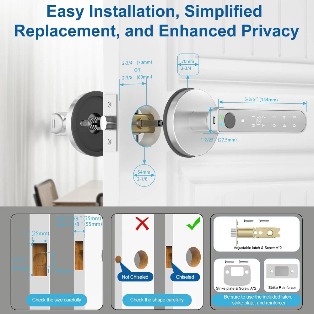 finger print door knob, fingerprint door knob for bedroom, Biometric Door Knob with App Control, door lock fingerprint with Keypad, keyless entry door lock with handle Features: **Material:** Crafted from durable aluminum alloy for long-lasting performance. **Power Supply:** Powered by 4 AAA alkaline batteries (not included). Includes a Type-C port for emergency power supply. **Storage Capacity:** Accommodates up to 100 fingerprints, 100 cards, and 100 codes, providing versatile and secure access options. 1. **Versatile 5-in-1 Access:** Enjoy multiple unlocking options with the fingerprint door lock front door, including app unlock, fingerprint recognition, fob card entry, code entry, and traditional key access. Choose the method that suits you best for enhanced convenience and security. 2. **Advanced Security Features: ** anti-peep code and auto-lock functionality, and app show battery level. The fingerprint bedroom door knob also includes a silent mode. 3. **Effortless Installation:** Upgrade your bedroom door lock easily with our biometric door knob’s straightforward installation process. Designed to fit standard door preparations with included tools and instructions. 4. ** Voice Control:** Pair the thumbprint bedroom door knob with the gateway for intuitive remote and voice control via your smartphone. Manage access, check lock status, and control settings from anywhere. 5. **Flexible Operational Modes:** Adapt the fingerprint door lock app to your needs with passage mode for uninterrupted access and silent mode for quiet entry. Fingerprint Door Lock with Key FOB