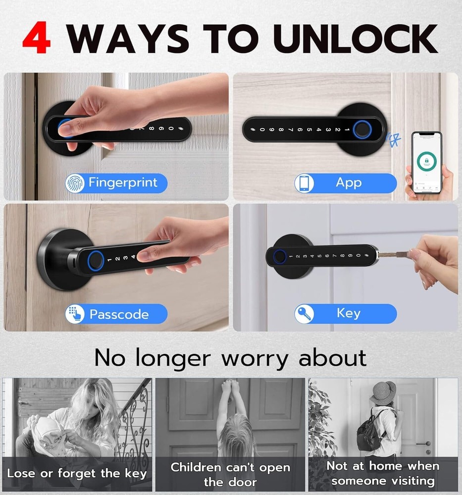 Smart Fingerprint Door Lock - Keyless Entry with App Control & 4 Unlock Methods ‹ › ‹ › ‹ › ‹ › ‹ › ‹ › ‹ › ‹ › Smart Fingerprint Door Lock - Keyless Entry with App Control & 4 Unlock Methods Unlock Your World Effortlessly: 4 Unlocking Methods: Seamlessly access your home with fingerprint unlock, passcode unlock, App control via Bluetooth, or a backup mechanical key. Experience the pinnacle of convenience and security. Impeccable Security Features: High Security & Durability: Crafted from robust Alloy Steel and Zinc, this door lock provides an added layer of safety, perfect for bedrooms, hotels, apartments, and private spaces. Simple Installation: DIY Friendly: Replace your original lock effortlessly with just a screwdriver (included). No additional drilling or locksmith needed. The reversible door handle caters to both left and right-handed doors. Extended Battery Life: Long-lasting Performance: This electronic lock offers low power consumption, assuring over a year of battery life. Receive timely reminders for low battery, and when in need, simply utilize a power bank for emergency access. Unmatched Customer Support: Peace of Mind: Enjoy a 12-month Free Trial and free lifetime technical support. Should you require assistance or wish to replace or refund, our hassle-free customer service stands by your side. Why Choose Our Smart Fingerprint Door Lock? Elevate your home's security with our Smart Fingerprint Door Lock, where cutting-edge technology meets exceptional convenience. With its versatile unlocking methods and robust construction, this lock is designed for modern living. Say goodbye to fumbling for keys and welcome a new era of intelligent home security. Transform your entryway today with our state-of-the-art Smart Fingerprint Door Lock. Shipping Free & Fast Shipping - We offer free shipping to most of the USA with a normal delivery time of 3-7 days. However, due to the current situation, additional delivery time (up to 3 weeks) may be required for some items. Alternative Carriers - We may use alternative carriers (e.g. USPS, FedEx, UPS, etc.) to ensure your package arrives safely and on time. Due to the use of multiple carriers, we are unable to provide a tracking number automatically. Handling Time - Orders are processed and shipped within 1-2 business days of receiving cleared payment. Shipping Restrictions - Shipping to Alaska, Hawaii, Puerto Rico, Guam, and other US territories may incur shipping charges or delivery restrictions. Please contact us before ordering, or your order can be refunded/cancelled. State Restrictions - There may be restrictions based on your state of purchase. For example, certain items may not be shipped to California due to state regulations. Contact for Tracking Updates - If you require tracking updates or have any concerns about the delivery of your order, please feel free to contact us, and we will be happy to assist you. Return 30-Day Hassle-Free Returns - We want you to be completely satisfied with your purchase. If you are not, you can return the item within 30 days of receiving it for a full refund or exchange. Easy Return Process - To start a return, simply contact us and we will provide you with a prepaid return shipping label and detailed instructions. Restocking Fee - There are no restocking fees for returns. However, the buyer is responsible for return shipping costs if the return is not due to a seller's error. Refund Processing Time - Refunds will be processed within 5 business days of receiving the returned item in its original condition. Payment We accept all major credit cards, PayPal, and Apple Pay for your convenience. Your payment information is secure and encrypted to ensure a safe and seamless transaction. Please complete your payment within 3 days of purchase to avoid any delays in shipping. Feedback Your feedback is extremely important to us. We strive to provide the best products and customer service possible. If you are satisfied with your purchase, please take a moment to leave us a positive review. If you have any concerns or issues with your order, please contact us before leaving negative feedback. We are committed to resolving any problems and ensuring your satisfaction. Contact Us If you have any questions or concerns, please feel free to reach out to our customer support team. You can contact us through the eBay messaging system. We are available Monday to Friday, 9:00 am to 5:00 pm EST, and we will do our best to respond to your inquiry within 24 hours. Buy it now and enjoy a pleasant shopping experience! UPC: Not Set Model: Not Set Unit Quantity: 2 Material: Alloy Steel,Zinc Suitable For: Front Door,Bedroom,Interior,Room,Home,Hotel,Garage,Apartment,Cloakroom,Pantry,Closet,Office,School Mounting: Universal Features: Keyless,Fingerprint Unlock,Passcode Unlock,App Controlled,Bluetooth Connectivity,Backup Mechanical Key Unlock,Auto Lock,Passage Mode,Anti-Peeping Passcode,Long Battery Life,Low Power Consumption Items Included: Key,Mechanical Keys,User Manual,Lock Latch,Spindle,Connecting Pipe,Screwdriver,All Screws,Front Handle,Rear Handle,Strike Plate,Strike Hole Cover Brand: Unbranded Type: Smart Lock Color: Black Finish: Oil Rubbed Throw Length: Not Set Item Height: Not Set Item Width: Not Set Cross Bore Diameter: Standard MPN: Not Set Number in Pack: 1 Style: Modern Item Depth: 2.6 in Country/Region of Manufacture: Not Set ANSI Grade: Not Specified Item Weight: 2 lb Door Handing: Universal/Reversible Manufacturer Warranty: Not Set Unit Type: lb Fixings Supplied: Not Set