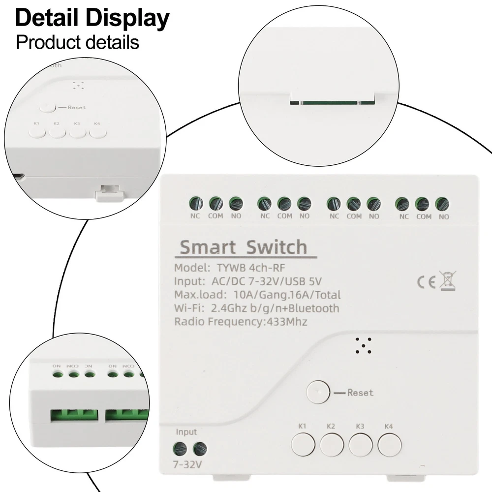 Smart For Tuya WIFI RF Control Module Switch 4CH Relay Module Switch DESCRIPTION Features: *Made of high-quality materials, sturdy and *Your smartphone or tablet is connected to 2.4G WiFi with Internet access (5G WiFi is not supported yet) *If your wireless router is set up with FOR MAC address filtering, please enter the router's background to turn off the FOR MAC filtering function. *Must be used with FOR FOR . *Supports FOR for Alexa voice control, FOR Home voice assistant control, mobile APP control and multi-language control Specification: *Input voltage: DC/AC 5-32V or AC 85-250V * USB: 5V *Maximum current: 2200W/10A *Wireless standard: FOR *RF: 433MHz *Working temperature: -20℃~70℃ *Model: 4CH DC5-32V without casing, 4CH DC5-32V with casing, 4CH AC85-250V with casing (optional) Package Included: 1X Wifi remote control module 1X User Manual Notes: 1. Due to factors such as display brightness and light brightness, the actual color of the product may be slightly different from the website picture. 2. Please allow a slight deviation between the data and the manual measurement. POLICES Shipping Payment WARRANTY We only ship to confirmed ebay Order addresses. Please comfirm that your Order address is in line with your shipping address. Please kindly note that the c ombined shipping is not provided because the shipping fee is calculated by weight. Also, the each additional item means exactly the the same color and size. It takes about 7 -15 working days to US; about 10-30 working days to other countries. Transit time may be a little delayed because of the bad weather and customs inspection . If you do not receive your item within 30 working days since payment finished, please contact us immediately for further assistance. Payment must be completed within 5 days. If you have any problems about payment, please contact us via ebay message. We strive for 100% customer satisfaction! Positive Feedback is very important to us. If you have any questions, p lease feel free to contact us via "Ask seller a question" . We will reply your email within 24 working hours. On Nov 12, 2024 at 07:12:31 PST, seller added the following information: