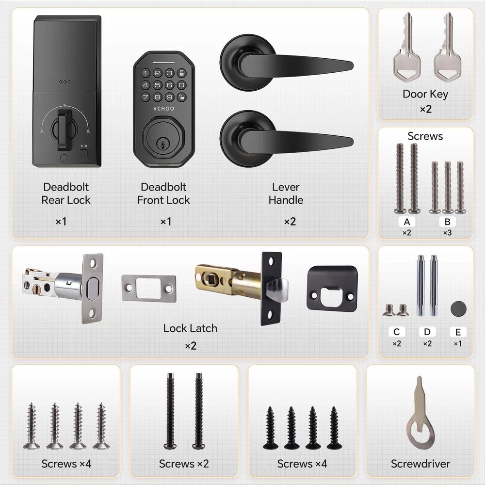 keyless entry door lock deadbolt with handle set keyless entry door lock with handle front door lock set keyless entry Multiple Ways To Access Keyless Entry Door Lock: keyless entry door lock deadbolt with handle set supports multiple ways to unlock, 100 user codes, one-time code, 2 physics keys. Door locks for front door was widely used in self-housing, hosts,offices,rental property management, school, hotels. Effortless Door Locks for Front Door: Smart keyless entry door lock has an automatic door lock function that can be set to auto-lock in 10-30 seconds and one-touch auto-lock by pressing, there's also a one-click button on the back of the lock, making life easier. Durable Front Door Lock Set, Secure Living Assistant: The smart locks for front door not only meets ANSI level 3 smart door lock core, lock body made of zinc alloy, IP54 waterproof (protect your home, rain or wind), but also specially set anti-snooping user password protection, all-round protection of your security. Convenience Door Locks: We have designed low battery alert function, once the smart door lock appears green light, please replace the low 4 AA batteries in time, in special cases, you can borrow the emergency TYPE-C charging port of the door lock to unlock. (Notice: 4 AA batteries are not included in the package). Easy to Install: The keypad door lock with handle has 2 matching Lever handles. No locksmith is needed. Replace existing locks in minutes with a screwdriver, compatible with left and right-hand doors. (Door thickness range 1.31 "-2.16"). door locks equally at home in both time-honored and cutting-edge residential designs. Profession Sales Team: is committed to providing quality products and customer service. We strictly check and control every link of the product. If you have any questions about our front door lock, please get in touch with us, we are at your service.