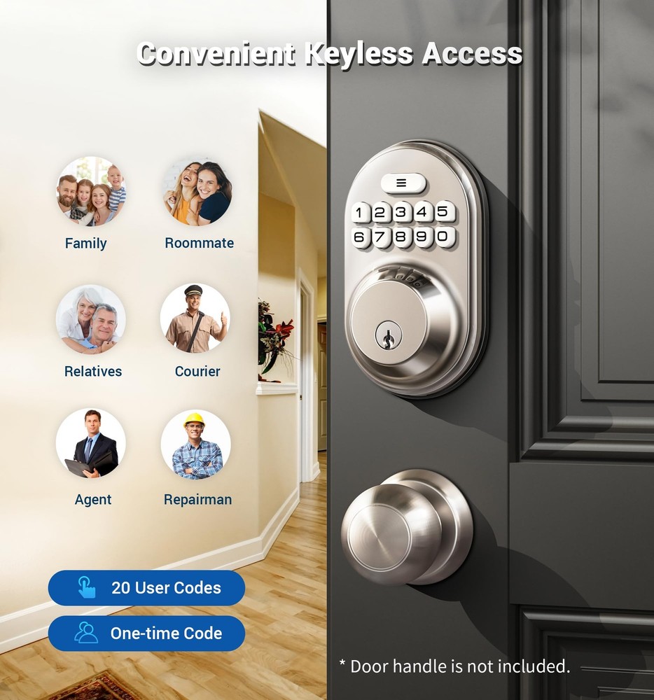 The Deadbolts are coming with user-friendly accessibility, easy installation, powerful security and convenience. Upgrade your deadbolt in hand, makes you feel more effortless to enter your house. User-friendly Keyless Entry With a secure 4 to 10 digit codes, it is easy for the elderly and kids to remember. You can also assign a one time code to a temporary visitor when you are away from home, save a lot of hassle. Auto Lock Enable the auto lock function, you can set your auto lock time to 10 ~ 99 seconds as per your needs. No need to wonder if the door is locked when you go out. Anti Peeping Password Prevent your codes from being spied by others, with this secure and reliable smart anti-peeping keypad, you can enter random digits before or after the correct access codes. Don't worry about leaking your personal information to a third party, the access codes are stored in local only. Vacation Mode When you are on a business trip or on vacation, you can turn on the vacation mode feature, which can limit all access grants, including the physical key, the only way to access your electronic deadbolt is your master codes. Specifications Door Lock Thickness: 1-3/8" to 2" (35 mm - 50 mm) Backseat: 2-3/8"or 2-3/4" (60 mm or 70 mm) Door Hole Diameter: 2-1/8" (54 mm) Latch Hole Diameter: 1" (25 mm) Weather Resistant: -22°F to 158°F/ -30°C to 70°C Keyless Entry: With 20 password code + 2 spare keys + one-time password for temporary visitors, the one-time code will automatically deleted after use Smart and Convenient: With anti peeping function when entering passwords, and the front door lock set can 'auto lock' in 10-99 seconds, or press a key for 2 seconds to lock the door manually Security Keypad Deadbolt: The ANSI Grade 3 smart door lock was made with sturdy lock cylinder and alloy, powered by 4 AA batteries, work last for more than 1 year Electronic Door Lock: Has backlit keypad and low battery alert, mute mode and vacation mode, water resistant, go perfectly with both traditional and modern house Easy to Install: Just with a screwdriver, the door lock will be easily installed and program all by yourself in several minutes, compatible with all American standard left and right handed doors offers at least 1 year product customer support from the date of purchase, 24/7 email support for you