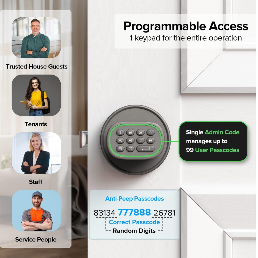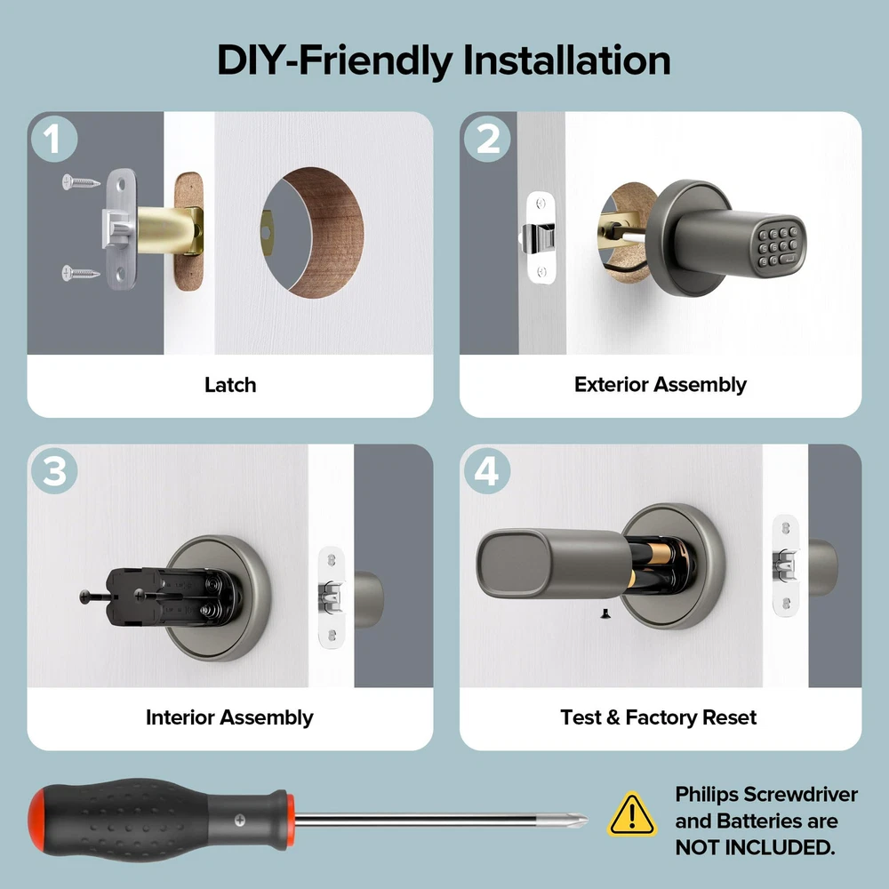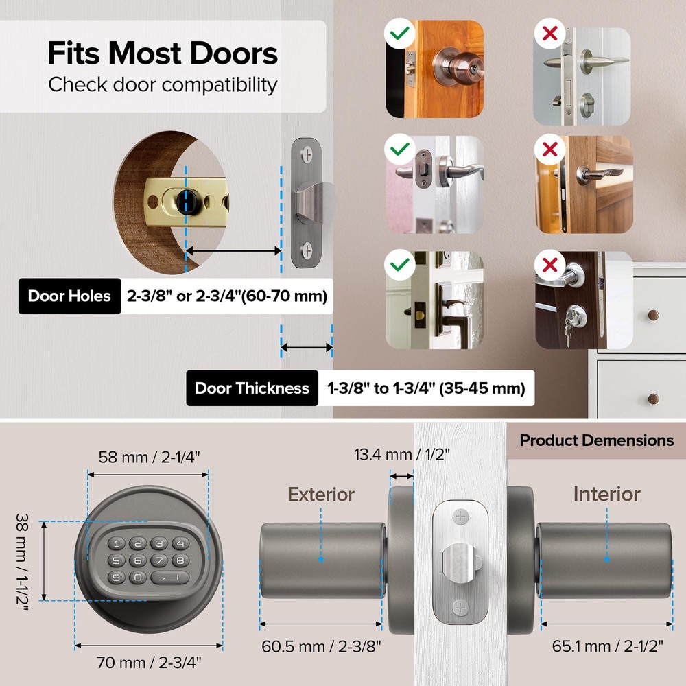2-in-1 Convenience, Peace of Mind . Unlock your way with Passcodes or key. For added , the door automatically locks after 5 seconds of inactivity. You can also lock it instantly with a press of the enter key. Built-in Anti-Peep technology lets you scramble your passcode with random numbers, keeping your entry code private DIY Friendly & Effortless Setup. Upgrade your in minutes following the 4-step installation using a Philips screwdriver. This keyless door lock fits most US doors. Using 4 x AA Alkaline batteries (NOT included) from a well-known brand could provide up to 2 years of battery life. If the battery runs out, you can connect your power bank to the Type-C port located on the bottom to power it on, or use backup keys to unlock Easy Programming with Innovative Keypad. Manage up to 100 passcodes for access, alongside settings like Passage Mode and Silent Mode using a single admin code Ultimate Grip Comfort for Everyone. Upgrade your home's style with a sleek and unique keypad door knob that enhances the look of your door. For added comfort, the rectangular door handles feature a rounded design that's easy and comfortable to grip, even with wet hands Built to Last. Our top-quality alloy construction and water-resistant design ensure long-lasting durability and unmatched for years to come. Perfect for room rentals, house-keeping, offices, and dormitories, this keypad door lock provides added and convenience for any interior room, from bedrooms and storage rooms to home offices, garages, and game rooms, etc