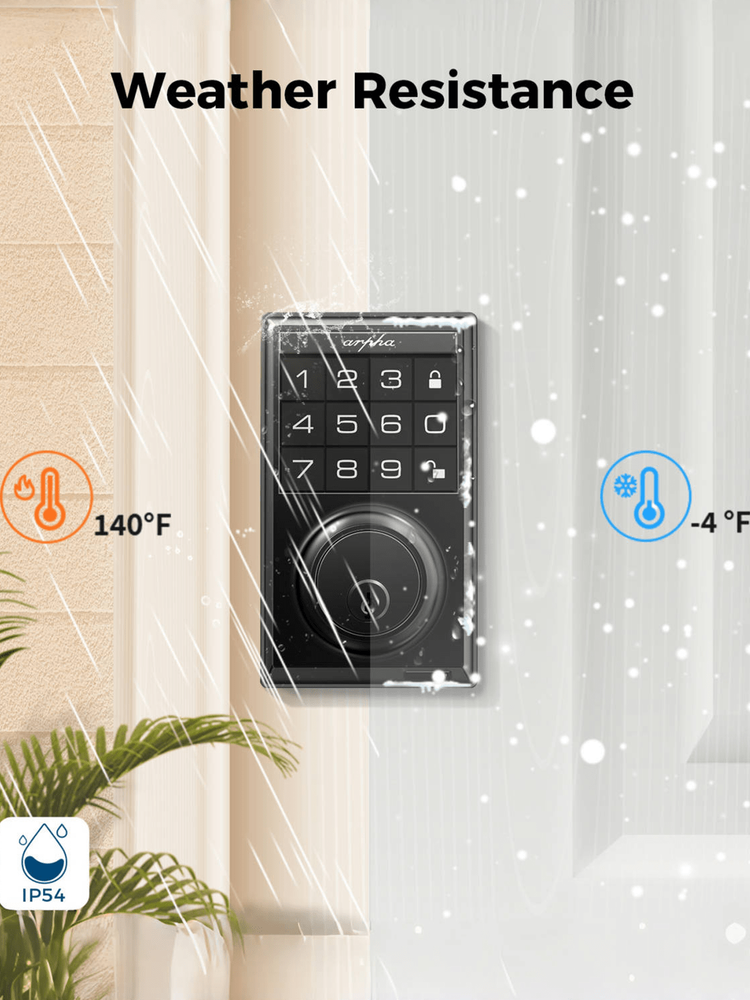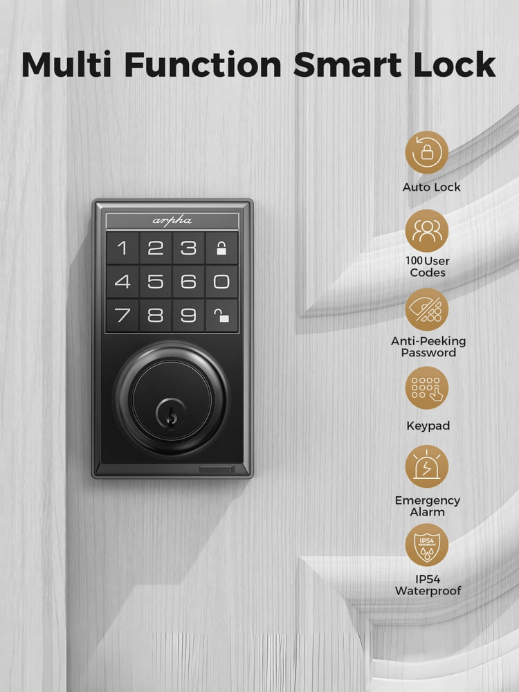 Up to 100 User Passwords: With our keypad deadbolt, you can effortlessly create and manage up to 100 user passwords, comprising 3 administrators and 97 users. This expansive feature allows you to securely manage access for family, friends, employees, and more. Whether for residential or commercial use, our digital door lock provides the flexibility and convenience you need to control who enters your space! Anti-Peeping Password: Boost your door locks for the front door with added protection! Our enhanced password setup allows users to add extra digits before and after entering the 6-10 digit real password to unlock the door, with a maximum of 16 digits. Smart locks for front doors are suitable for various settings including hotels, apartments, homes, offices, and shops. Auto Lock & One Touch Lock/Unlock: Experience the ultimate convenience with our electronic door lock customizable auto-lock feature - set to lock after 10 seconds by default, with an optional 20 or 30 seconds delay. Plus, enjoy seamless control with one-touch locking/unlocking, and whether you're coming home or leaving, our smart deadbolt lock combines convenience and security that's always at your fingertips. Suitable for Indoor/Outdoor: The electronic door lock is made of zinc alloy; IP54 waterproof (lightly sprinkled, can not be placed in heavy rain), fully operating temperature between -13℉and 140℉ (Please note, do not exceed this temperature use). In addition, the bedroom door lock can be adjusted to unlock in silent mode. Effortless Installation: Arpha keyless deadbolt can be easily installed in minutes with a screwdriver. Universally compatible, this door keypad locks seamlessly fits both left and right door orientations. The deadbolt lock accommodates door thicknesses ranging from 1-3/8" to 2-1/8" (35mm - 55mm), with lock edge distances of 2-3/8 inches (60mm) and 2-3/4 inches (70mm). Color: Black Power Supply: Battery Powered(Others Battery) Batteries Included: No