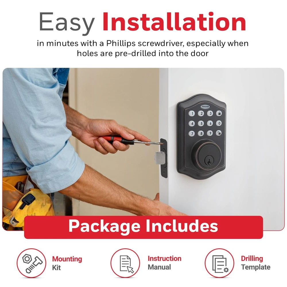 DIGITAL DOOR LOCKS - install in minutes with pre-drilled holes in the door, all you need is a Philips screwdriver!.Note: Measure your door's backset, cross bore and thickness to ensure you find the right fit. FEATURES - oil rubbed bronze brass electronic deadbolt suits a range of doors and home decor styles. Requires 4 "aa" alkaline batteries VACATION MODE - system into a low power state, disabling all buttons and functions until reactivated SECURE - a convenient -touch locking system, 50 programmable user codes, and an alarm that sounds after four incorrectly entered codes. TRUSTED COMPANY - Honeywell digital door locks provide for your home with a convenient keyless entry function.