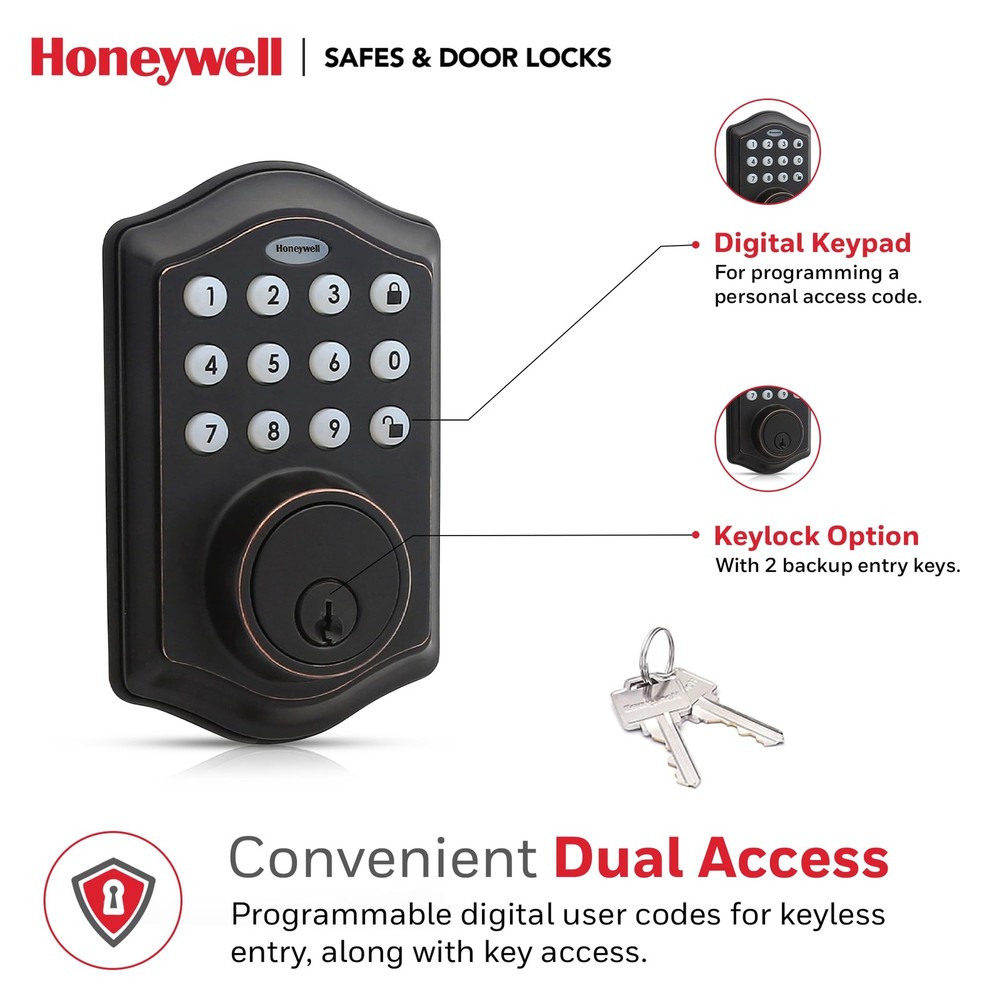Honeywell electronic digital deadbolts feature traditional key access as well as the ability to unlock with a Programmable 4 to 8 digit user code (keyless entry). These Honeywell locks allow the owner to program up to 50 different user codes and delete them as desired. The Honeywell oil rubbed bronze electronic digital deadbolt allows you to set an automatic lock function that will return the deadbolt to the locked position at a programmed amount of time after the lock is opened. There is also a vacation mode that puts the system into a low power consumption state and disables all buttons and functions until the programmer chooses to reactivate the lock. The lock features bump protection, an installation hardware kit and 2 keys, a single cylinder deadbolt, and is easy to install with PHILLIPS head screwdriver. The battery requires 4 'aa’ alkaline batteries (not included). LH Licensed Products, Inc. leverages premium consumer brand power to deliver innovative solutions for unmet and emerging consumer needs around the world. Our products are currently available in over 70 countries across the globe. LH Licensed Products, Inc. is the exclusive licensee and manufacturer of Honeywell Safes, Paper Shredders and Door Locks. Our partner company, Lewis Hyman Inc. began in 1930 as a family window treatment business in New York City. Widely recognized for lifestyle product innovation, Lewis Hyman Inc. has established a tradition of quality and service, spanning three generations and over eighty years of expertise. DIGITAL DOOR LOCKS - install in minutes with pre-drilled holes in the door, all you need is a Philips screwdriver!.Note: Measure your door's backset, cross bore and thickness to ensure you find the right fit. FEATURES - oil rubbed bronze brass electronic deadbolt suits a range of doors and home decor styles. Requires 4 "aa" alkaline batteries VACATION MODE - system into a low power state, disabling all buttons and functions until reactivated SECURE - a convenient -touch locking system, 50 programmable user codes, and an alarm that sounds after four incorrectly entered codes. TRUSTED COMPANY - Honeywell digital door locks provide for your home with a convenient keyless entry function.