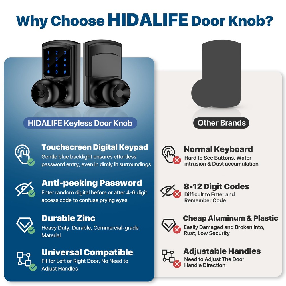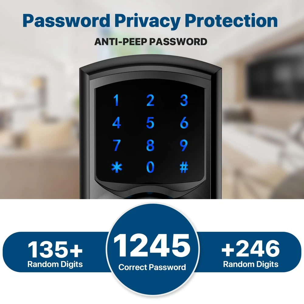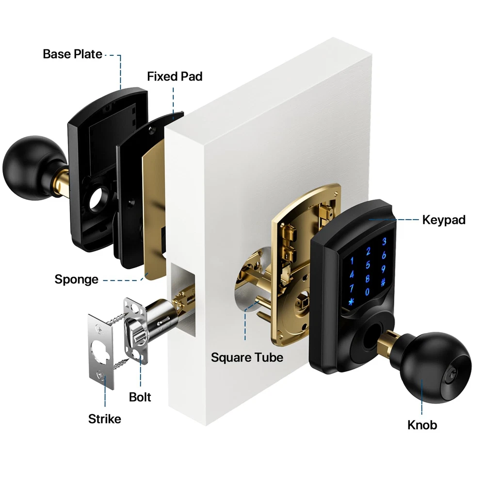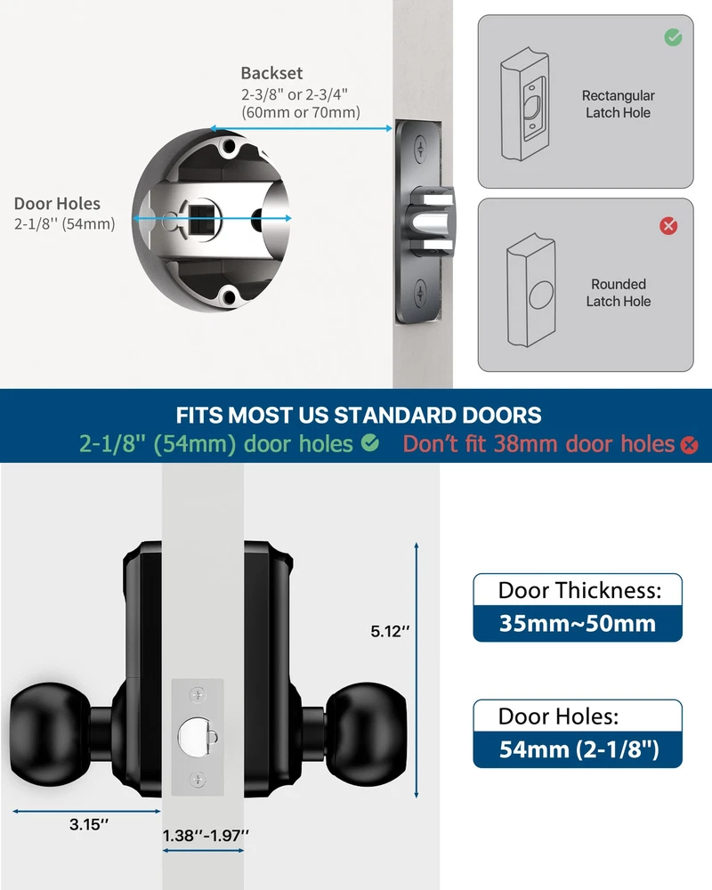 Multi-function: This smart door lock with keypad is also featured with low battery alarm / mute mode / passage mode / 5s Auto-lock(Note: there is NO “one-touch lock” function in interior door knobs). Efficient Touchscreen Keypad: Keypad door lock's touchscreen design ensures optimal performance, eliminating issues associated with stuck physical buttons. Blue Backlight adds to the convenience of password entry even in low-light conditions, making keyless entry easier. Enhanced Security: Keypad door knob automatically secures your home in 5 seconds for peace of mind. Smart door knob with keypad automatically locks 5 seconds after unlocking. No more forget to lock the door. Anti-Peep Password: Prioritizing your safety, keyless entry door lock with handle features an anti-peep password function. Add any random digits before and after correct password with confidence. Password pravicy function protects your password from being leaked. Heavy Duty: Made of Zinc Alloy, heavy-duty door knob with lock meets the same safety standards as ASIN Grade 3. Its locking mechanism is carefully designed to prevent unauthorized access. Effortless Installation: Code door lock includes all necessary hardware and an adjustable latch to fit 2-3/8" or 2-3/4" backsets. Suitable for 2-1/8" (54mm) door holes (don't fit 38mm door holes). Installing on any left or right-handed door is a breeze, taking about 15 minutes with just a screwdriver. No adjustment is required to install door knob on left or right handed door.