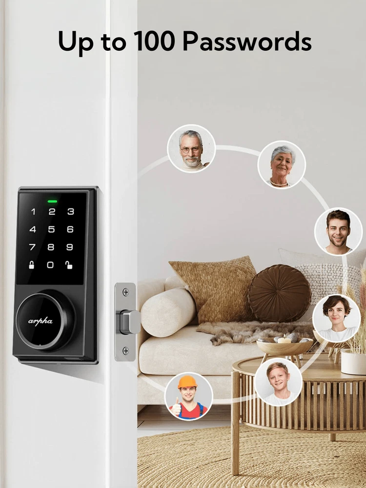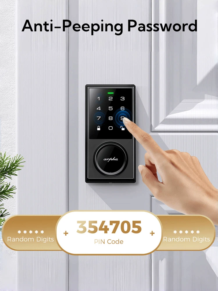 Up to 100 Entry Codes: Arpha smart door lock stores up to 100 different entry codes so everyone in the household can use it, as well as anyone you trust enough to give open access to. For temporary guest access, it can assign a unique code that works only for specific dates. 100 Passcode: Door lock with code supports 100 groups of access codes for the front door, including 97 users and 3 admin passcodes. Anti-Peeping Password: The door lock provides virtual password unlocking function. For example, the user sets the password to "123456". When user opens the front door, the keyless entry door lock allows the user to enter 5 random numbers at the beginning or ending to avoid surveillance by strangers. "XX123456XX" allows the user to enter. Long Battery Life Battery Alert: If you buy this lock, though, don't forget to snag some batteries. The keyless door lock supports 4 AA batteries (batteries not included) and can be used for about 180 days without frequent battery replacement. It does warn you when the battery is running low, so there's a fail-safe method in case you do find yourself locked out because of a dead battery. There's a USB-C port hidden on the bottom of the exterior you can use to quickly charge it up enough to unlock the door. Auto Lock: The door lock also comes with a 'Smart door locking' feature that automatically locks the door after 10 seconds to 30 minutes. Extremely convenient for those with busy lives-simply close your door and it will auto-lock behind you. Durability & IP54 Waterproof: Arpha AL301 door lock set is made of zinc alloy, which is stronger and more durable than aluminum alloy. The IP54 waterproof design makes it rainproof and can withstand temperatures from -31 °F to 158 °F.
