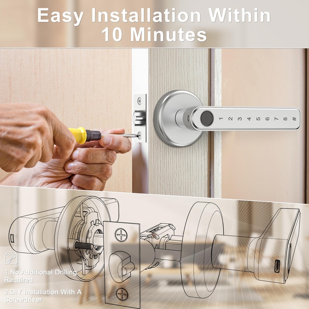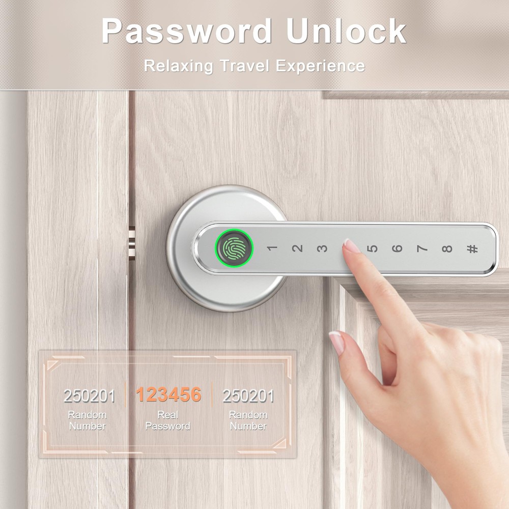 This smart door lock is a game-changer! Super easy to install with no wiring needed, and it works perfectly on standard US doors. Love the fast fingerprint recognition—unlocks in just a second! No more fumbling for keys, and the anti-peep password adds extra security. Super convenient with multiple unlock options, and it stores up to 50 fingerprints. Highly recommend for hassle-free, keyless entry!