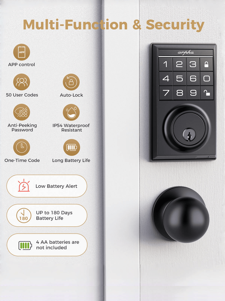 Keyless Entry Door Lock: Arpha smart door lock could be unlocked via App + Password + Mechanical key. Smart deadbolt supports 100 groups of access codes for the front door, including 97 users and 3 admin passcodes. Door lock with code are suitable for a variety of environments, including hotels, apartments, homes, offices, and stores. Auto-lock & One-touch Lock/Unlock: Experience the ultimate convenience with our digital door lock customizable auto lock feature - set to lock after 10 seconds by default, with an optional 10 seconds to 30 minutes delay. Plus, enjoy seamless control with one touch locking/unlocking, and whether you're coming home or leaving, our electronic door lock combines convenience and security that's always at your fingertips. Battery Powered & Type-C Emergency Port: Our deadbolt smart lock is powered by 4 AA batteries (not included), providing 3-4 months of continuous operation. It alerts with a low battery sound prompt when power is running low. Additionally, featuring a Type-C emergency power port, you can effortlessly recharge the smart deadbolt lock whenever needed, ensuring peace of mind even during power outages. Effortless Installation: Arpha smart door lock with handle can be easily installed in minutes with a screwdriver. Universally compatible, this door keypad locks seamlessly fits both left and right door orientations. The deadbolt lock accommodates door thicknesses ranging from 1-3/8" to 2-1/8" (35mm - 55mm). Color: Black Power Supply: Battery Powered(Others Battery) Batteries Included: No