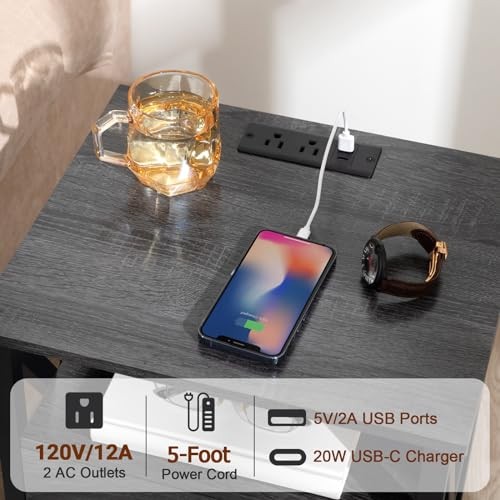 $ 49.61Gray Wood Nightstand Set of 2 with Charging Station, LED Light, Drawers & Shelf