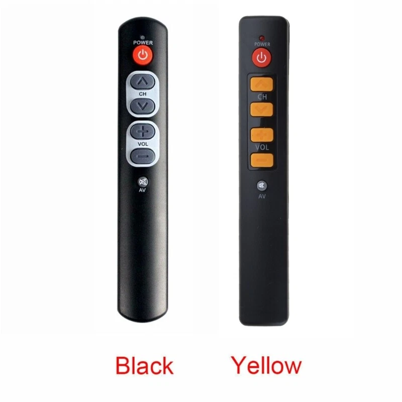 Description: and high Features: 1.This remote replaces all necessary functions of and video remote controls. 2.This remote control learns all functions directly from remote control and fits for all brands non restrictively. 3.This remote aims to everyone, only the buttons like power, volume and channel are important. 4.By avoiding less often needed button, like this remote is for elderly people. 5.Compact and clear remote control, suitable for home and any other occasion use. Specifications: Product name:Remote Controller ABS Silicone Color:Black,Yellow Number of Buttons:6 Keys Type:Learning Type Size:About 17x3x1.5cm/6.69x1.18x0.59in Note: 1cm=10mm=0.39inch Please allow 1-3cm error due to manual measurement. pls make sure you do not mind before you bid. Due to the difference between different monitors, the picture may not reflect the actual color of the item. Thank you!. Package Included: 1 Pc x Remote Controller