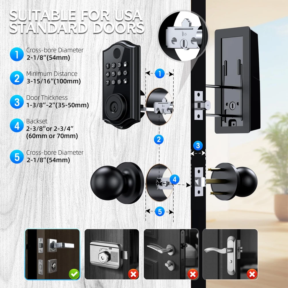 Advanced Fingerprint Recognition: Our state of the art fingerprint door lock can store up to 50 unique fingerprint codes and 50 digital codes, including three manager codes for heightened security. Unlock your door in just 1 second with seamless fingerprint identification. Plus, generate and share permanent, temporary, or one-time passwords remotely via the app for guests and babysitters Smart Security Features: Enhance your home security with an adjustable auto-lock feature that activates in 1 second to 30 minutes. Effortlessly lock the door using the exterior keypad with a simple “one-touch lock.”interior, easily lock and unlock with the knob in a split second—perfect for quick entries and exits Versatile Access Options: Experience the ultimate convenience with multiple access methods—fingerprint recognition, smartphone app, customizable codes, e-key sharing, or a traditional mechanical key. This smart lock is perfect for various settings, including homes, commercial,properties, apartments, offices, and hotels Hassle-Free Installation: Our smart lock installs quickly with just a screwdriver. Compatible with 1-3/8" to 2 (35mm to 50mm) thick doors, it's suitable for all standard American left and right-handed doors. The lock runs on 4 AA batteries for up to 12 months, features a low battery alert, and includes an external Type-C emergency power supply. Even when the batteries are depleted, your access codes remain stored securely, ensuring hassle-free entry. Durable Keypad Door Lock:Our smart lock for front doors comes complete with 2 knob handles and a user friendly keypad deadbolt featuring backlighting, adjustable volume, and a convenient vacation mode. Built to last, it boasts an IP65 weatherproof rating, effortlessly withstanding temperatures from -4°F to 122°F Touch & Go Fingerprint Lock:lock's fingerprint scanner boasts high security against spoofing, leveraging advanced biometric technology and a multi-layer security approach. It employs live data detection to effectively reject counterfeit prints made from materials like silicone or clay, ensuring robust protection against unauthorized access.Experience seamless usability with our lock's 360-degree fingerprint recognition capability, allowing for quick and effortless access from any angle. Security Anti-Peep Electronic Keypad:For added security and to prevent snooping, our system utilizes an anti-snooping password feature. This feature allows the user to add random numbers (up to 20 digits) before and after the password when entering the correct password.
