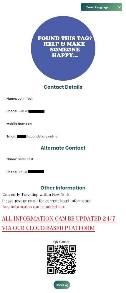 In the unfortunate event of your item getting lost, the Smart NFC Luggage Tag ensures a quick and easy way for anyone to get in touch with you & assist in recovering a lost item and returning it to its rightful owner. EASY & QUICK SETUP - Just tap the included card and follow the instruction, it will take you less than 60 sec! REGAIN CONTROL OF YOUR POSSESSIONS – If you lose your bag, the Finder simply Taps or Scans the Smart tag, to reveal your information. You will also receive an with the last scan location, and a Google Map link to the location. UPDATE ANY TIME 24/7 FROM ANYWHERE - Our cloud base system allow you to quickly login and update your details , so they are always up to date, wherever you go! YOURS FOR LIFE! Once purchased, there are no activation fees or subscription fees EVER NO MAINTENANCE OR BATTERY REQUIRED: The smart NFC tag operates without the need for batteries. The NFC chip functions reliably without frequent replacements or recharging, enhancing convenience and dependability. You can attach it to your Keys, school bag, travel bag, luggage, laptop bag, school backpack, gym or sports bag, suitcase, or handbag to ensure a quick and easy way to get it back (just in case...)
