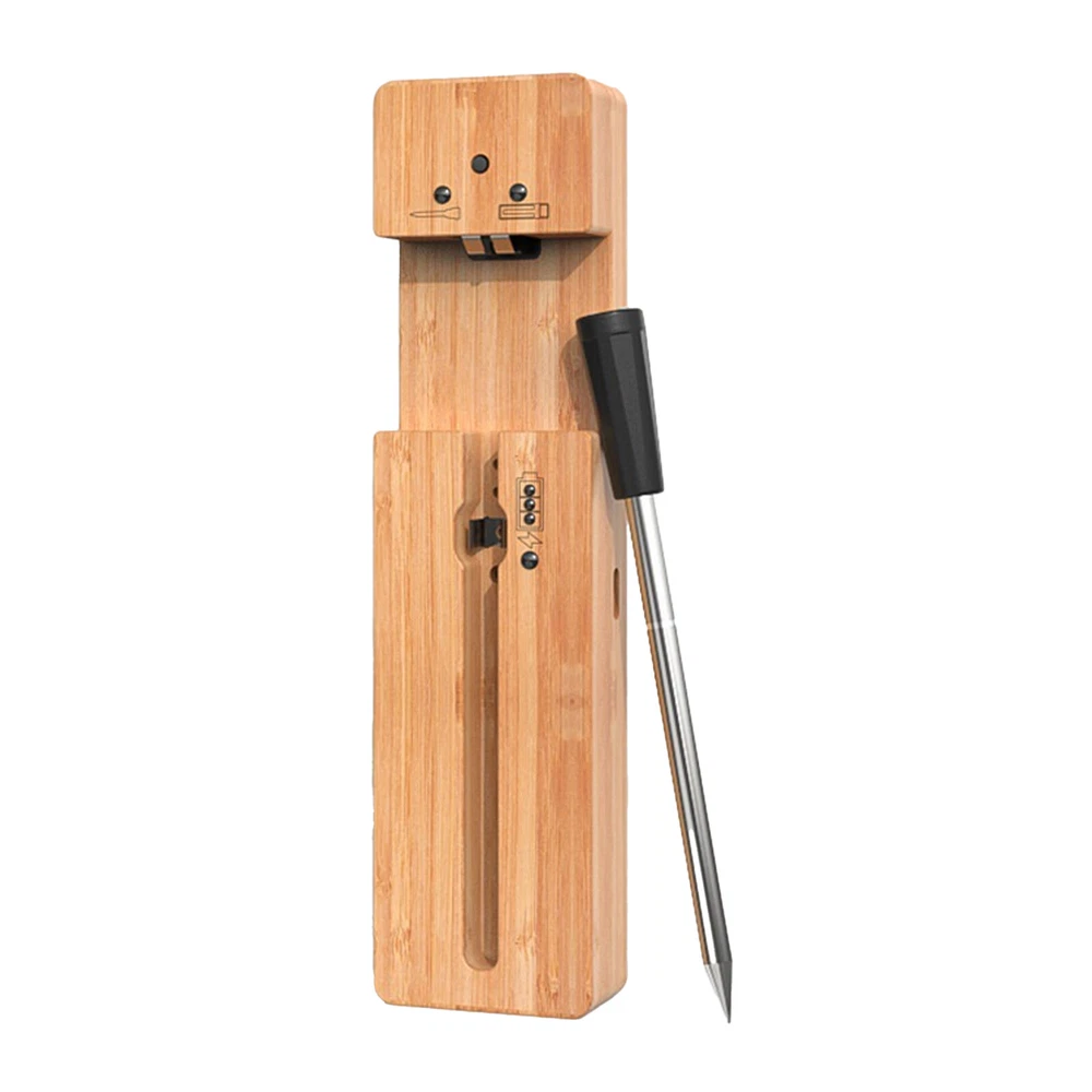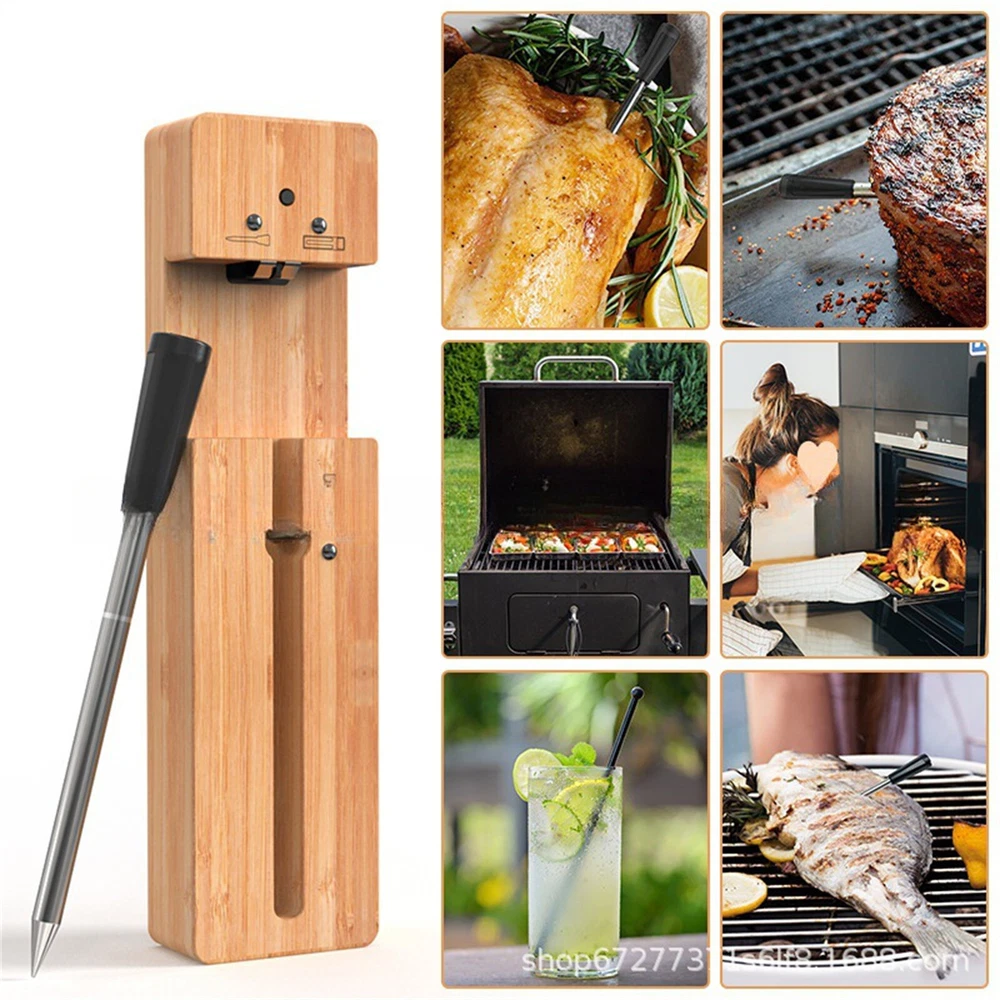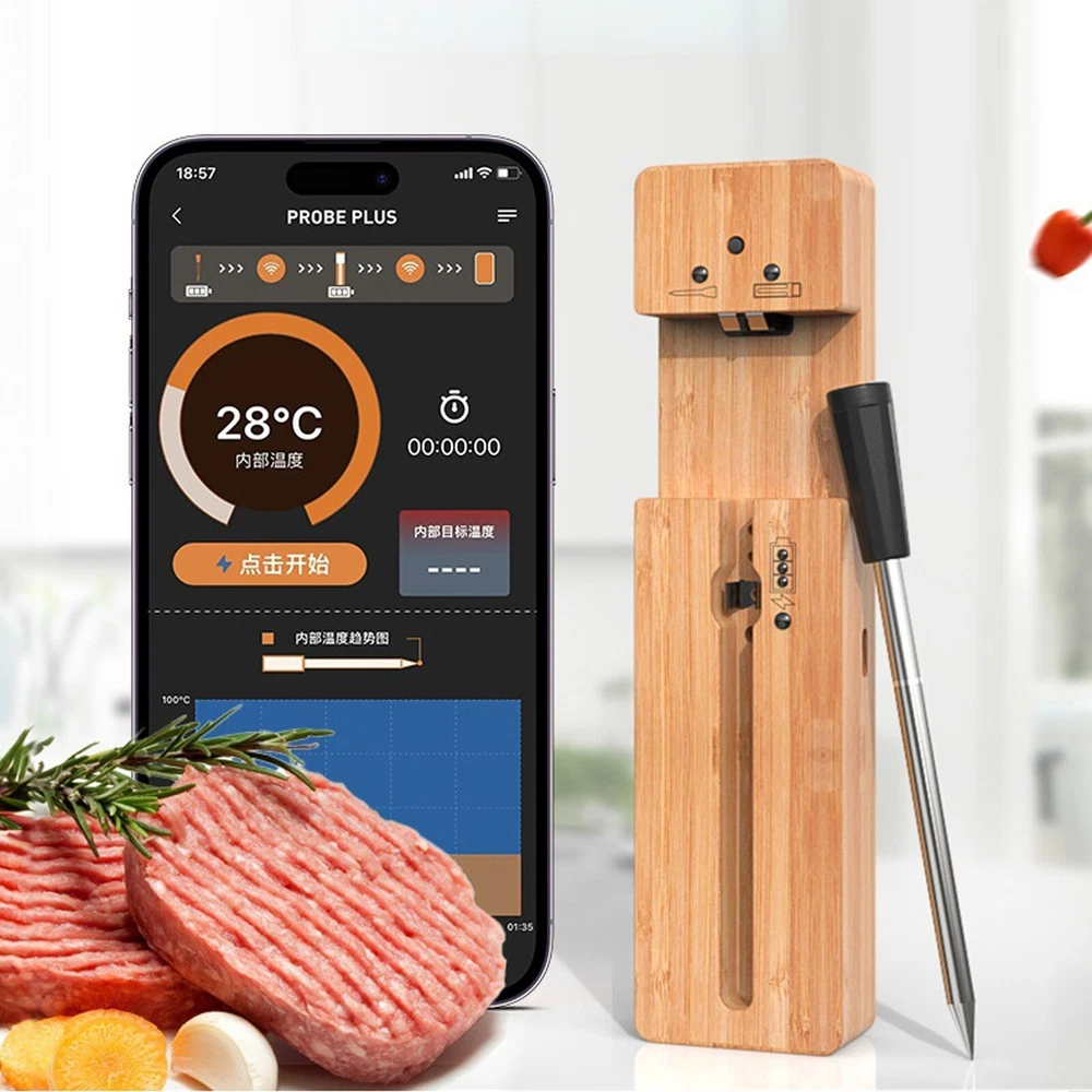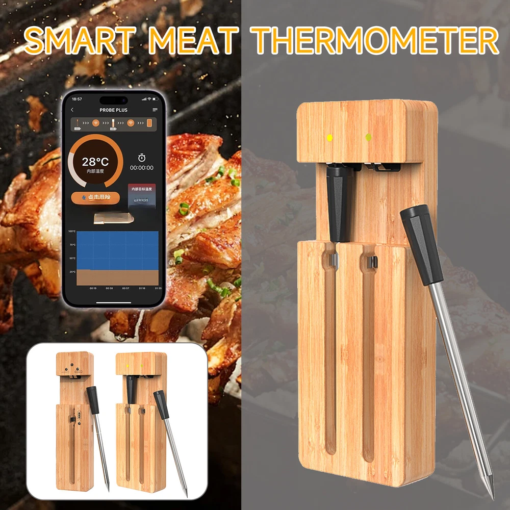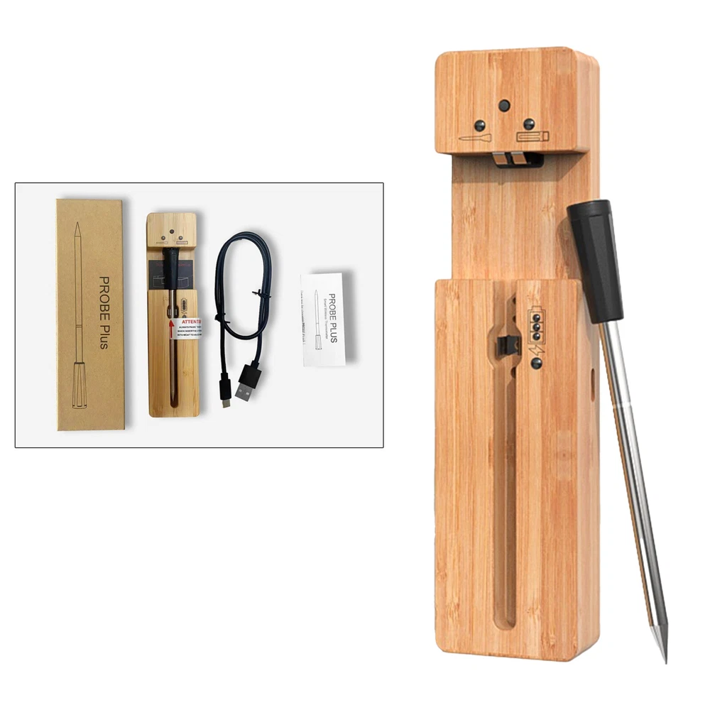 Description: Model-A Supported devices: Android and iPhone phones or ipads. Heat resistance: internal (notch)<100℃(212℉) ambient temperature <300C(572℉) Charging time: Probe :30-40 minutes, repeater (docking):3-4 hours Connection type: Bluetooth 4.2 and higher Full power usage time: detection time >16 hours, repeater (docking)>300 hours Transmission range: Probe to repeater >30 m (100 ft)(open space) Repeater to mobile device :>70 m (230 ft)(open space) Carbonized :USB to Type-C 1000 mah lithium battery Material :304 stainless steel/high quality high temperature plastic/bamboo Probe size: Probe length :125*12mm, probe diameter: 5.5mm Charging seat size :(165X41X23.2)mm Waterproof class :IPX7 Refresh frequency :1 second Product weight: 115g Read time :2-4 seconds Temperature range :0-100℃(32-212F) Display accuracy :1 ° C /F Temperature accuracy :+/-1C(+/-1.8F) Model-B Supported device: Apple iPhone or Android phone App Application name :PROBE TEMP Connection mode: Bluetooth Wireless connection distance :>50M Material: Stainless steel/high temperature resistant plastic Probe waterproof rating :IPX7 Temperature measurement accuracy :+/-1° C (+/-1.8° F) Temperature reading frequency :1 second/time Temperature measurement range :0~100 degrees Usage time of full charge :4 hours Charging mode: Special charging base, USB Type-C interface power supply Feature: This Smart Meat Thermometer with Bluetooth allows you to monitor the temperature of your food remotely. The thermometer is designed to provide accurate temperature readings for different types of food, including fish and meat. It comes with a range of features such as remote read, digital display, and easy-to-clean design. Made from high-quality materials such as stainless steel and ceramic, this thermometer is built to last and withstand regular use. Whether you're a professional chef or a home cook, this Smart Meat Thermometer is the perfect tool for achieving perfectly cooked meals every time. [The ideal choice for indoor and outdoor cooking enthusiasts] This is 100% wire-free, allowing you to cook with complete freedom and flexibility. You can easily monitor your cooking progress using the free app . Please note that the smart phone is not included in the package. [The perfect gift for the chef in your life] Whether it's for your husband, dad, brother, wife, mother, sister, or a food-loving friend, this versatile kitchen gadget is a must-have for anyone who likes to BBQ or is a home chef in the kitchen. Achieve perfect results every time with this high-precision thermometer that takes the guesswork out of cooking. With the holiday season approaching, it also makes a great gift for Christmas, stocking stuffers, or white elephant gift exchanges. Make this year's festivities sizzle with this essential kitchen tool. [Say goodbye to guesswork with our Guided Cook System] This innovative feature walks you through each stage of the cooking process, ensuring perfect and consistent results every time. You can even set up custom alerts and notifications based on temperature and/or time to keep you on track. The algorithm can estimate the ideal cooking and resting times for your food, taking the stress out of meal planning and allowing you to sit back and relax while your meal cooks to perfection.
