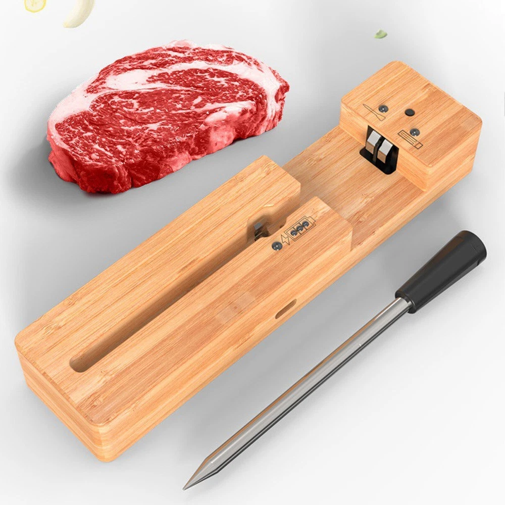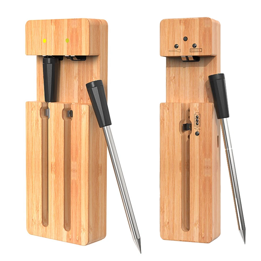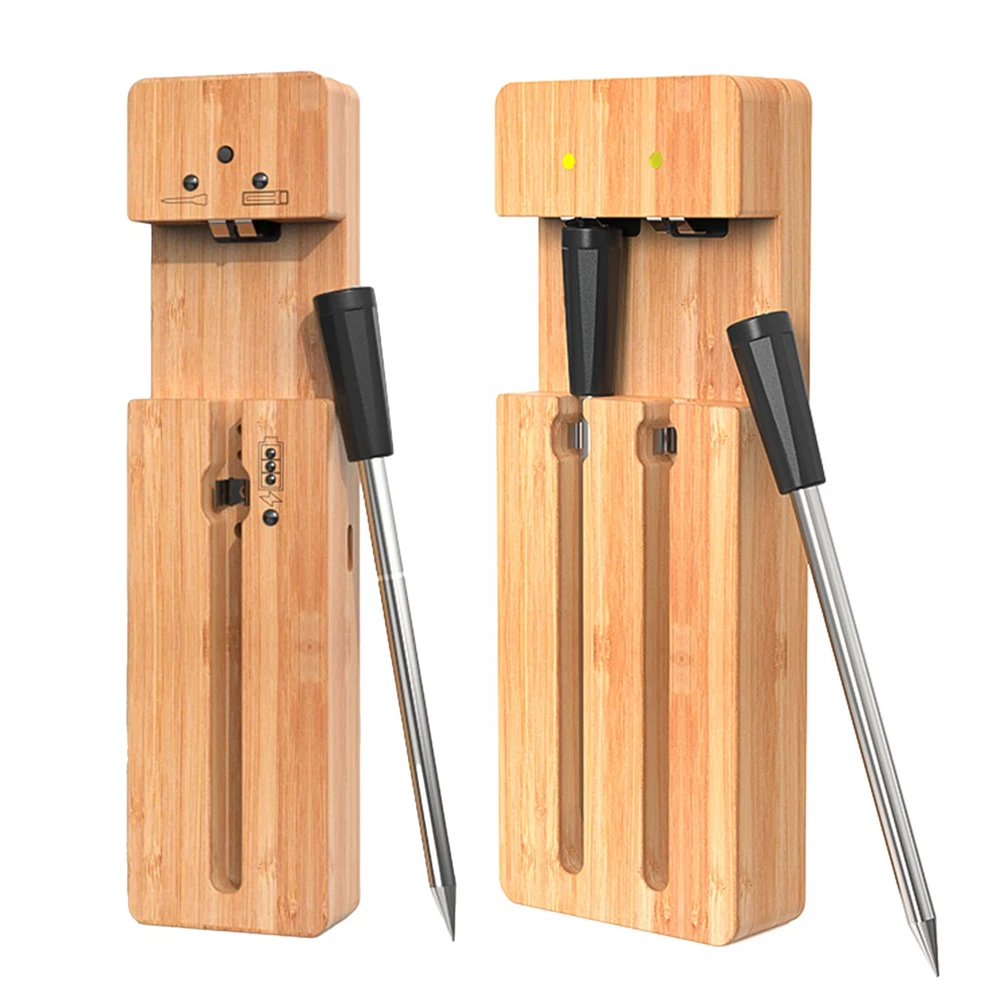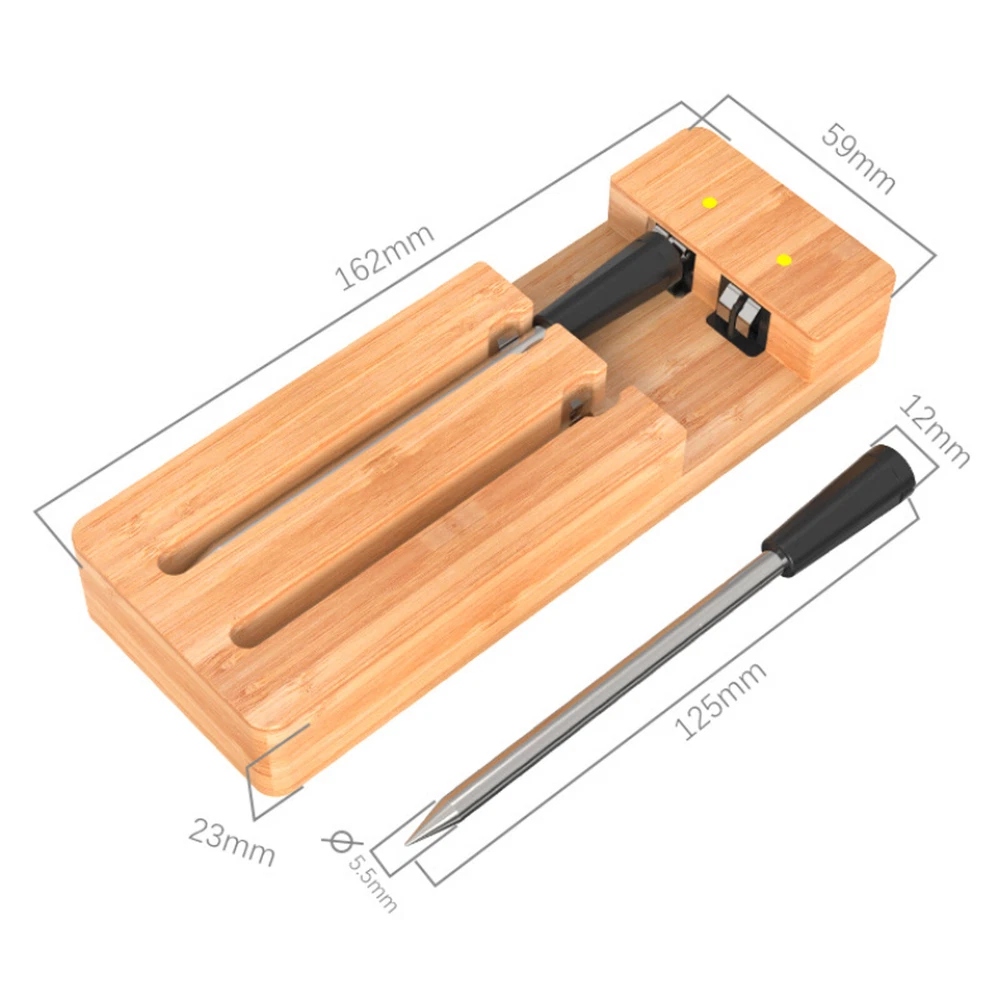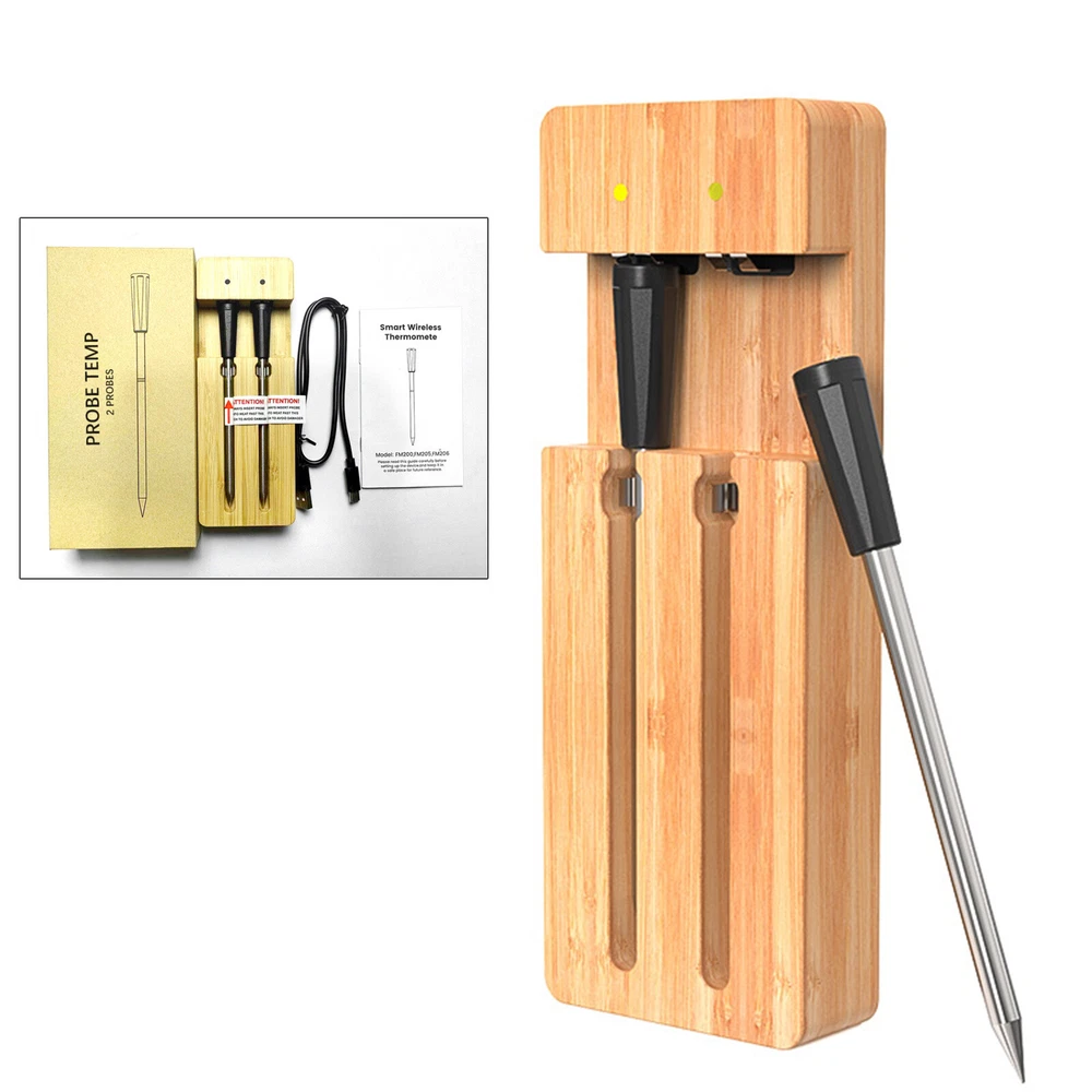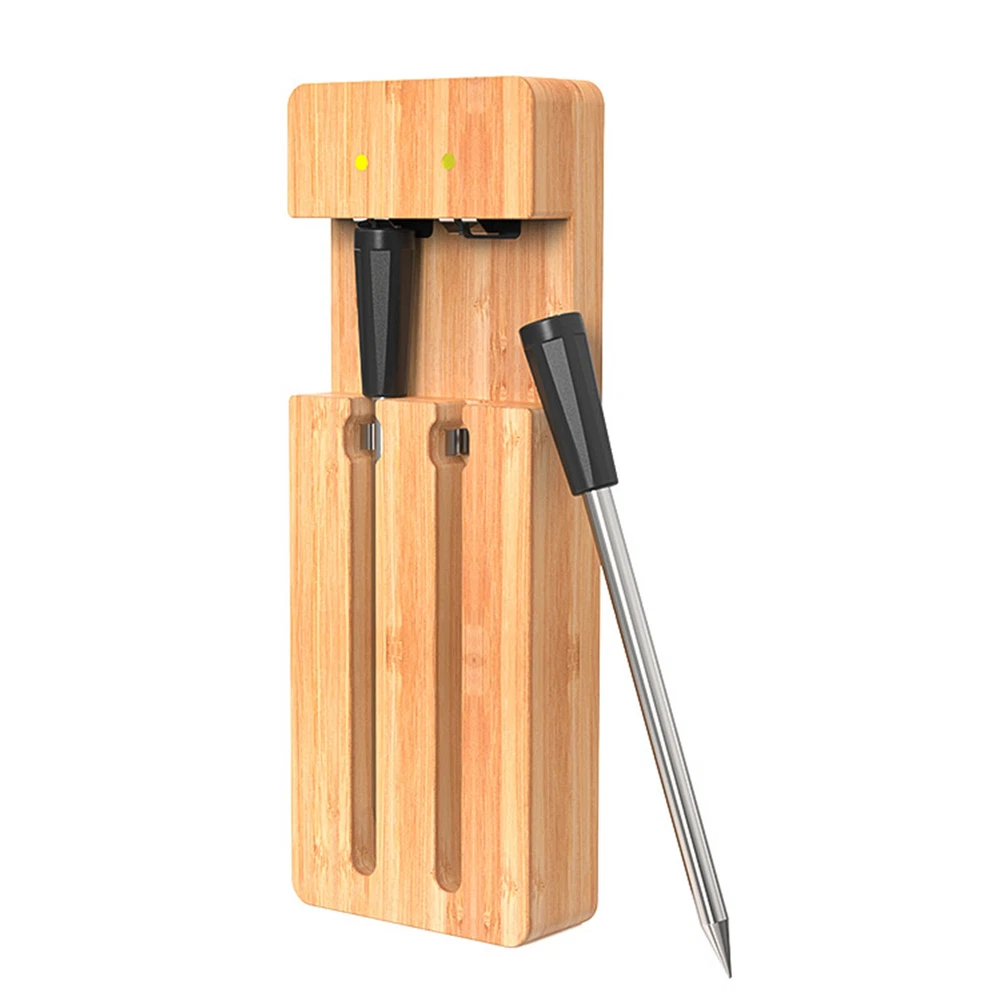 Description: Model-A Supported devices: Android and iPhone phones or ipads. Heat resistance: internal (notch)<100℃(212℉) ambient temperature <300C(572℉) Charging time: Probe :30-40 minutes, repeater (docking):3-4 hours Connection type: Bluetooth 4.2 and higher Full power usage time: detection time >16 hours, repeater (docking)>300 hours Transmission range: Probe to repeater >30 m (100 ft)(open space) Repeater to mobile device :>70 m (230 ft)(open space) Carbonized :USB to Type-C 1000 mah lithium battery Material :304 stainless steel/high quality high temperature plastic/bamboo Probe size: Probe length :125*12mm, probe diameter: 5.5mm Charging seat size :(165X41X23.2)mm Waterproof class :IPX7 Refresh frequency :1 second Product weight: 115g Read time :2-4 seconds Temperature range :0-100℃(32-212F) Display accuracy :1 ° C /F Temperature accuracy :+/-1C(+/-1.8F) Model-B Supported device: Apple iPhone or Android phone App Application name :PROBE TEMP Connection mode: Bluetooth Wireless connection distance :>50M Material: Stainless steel/high temperature resistant plastic Probe waterproof rating :IPX7 Temperature measurement accuracy :+/-1° C (+/-1.8° F) Temperature reading frequency :1 second/time Temperature measurement range :0~100 degrees Usage time of full charge :4 hours Charging mode: Special charging base, USB Type-C interface power supply Feature: This Smart Meat Thermometer with Bluetooth allows you to monitor the temperature of your food remotely. The thermometer is designed to provide accurate temperature readings for different types of food, including fish and meat. It comes with a range of features such as remote read, digital display, and easy-to-clean design. Made from high-quality materials such as stainless steel and ceramic, this thermometer is built to last and withstand regular use. Whether you're a professional chef or a home cook, this Smart Meat Thermometer is the perfect tool for achieving perfectly cooked meals every time. [The ideal choice for indoor and outdoor cooking enthusiasts] This is 100% wire-free, allowing you to cook with complete freedom and flexibility. You can easily monitor your cooking progress using the free app . Please note that the smart phone is not included in the package. [The perfect gift for the chef in your life] Whether it's for your husband, dad, brother, wife, mother, sister, or a food-loving friend, this versatile kitchen gadget is a must-have for anyone who likes to BBQ or is a home chef in the kitchen. Achieve perfect results every time with this high-precision thermometer that takes the guesswork out of cooking. With the holiday season approaching, it also makes a great gift for Christmas, stocking stuffers, or white elephant gift exchanges. Make this year's festivities sizzle with this essential kitchen tool. [Say goodbye to guesswork with our Guided Cook System] This innovative feature walks you through each stage of the cooking process, ensuring perfect and consistent results every time. You can even set up custom alerts and notifications based on temperature and/or time to keep you on track. The algorithm can estimate the ideal cooking and resting times for your food, taking the stress out of meal planning and allowing you to sit back and relax while your meal cooks to perfection.