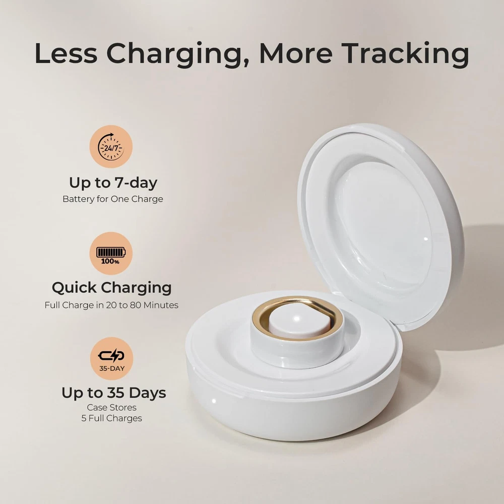 Transform Your Health Journey with Ring Gen2 The world's thinnest health ring delivers comprehensive women's health insights with unmatched comfort and style. Why Choose Ring 2? - Advanced BBT Technology: 1,400+ nightly temperature measurements - Ultra-Thin Design: Just 2.7mm thick with premium ceramic exterior - Complete Health Tracking: Cycle, sleep, heart, stress, and activity monitoring - Long Battery Life: Up to 7 days with convenient charging case - Global Community: Join 15M+ women using 24/7 HEALTH COMPANION: Continuous heart rate monitoring and HRV tracking provide stress insights and health trends. Track daily activity, steps, and calorie burn. All health data syncs seamlessly with the lifetime free app. PROFESSIONAL SLEEP INSIGHTS: Track sleep stages (Deep, Light, REM), blood oxygen levels while you rest. Get detailed sleep scores and personalized recommendations. ADVANCED CYCLE TRACKING: Revolutionary BBT technology with 1,400+ nightly temperature measurements provides accurate cycle predictions and ovulation detection. Part of trusted ecosystem with 15M+ women worldwide. COMFORT MEETS ELEGANCE: Just 2.7mm. Premium ceramic exterior with aluminum core ensures durability while weighing only 3.3g. Scratch-resistant, water-resistant to 100m, and designed for 24/7 wear. Size First with Sizing Kit. SIMPLE & RELIABLE: Up to 35-day battery life with quick charging case (stores 5 full charges). Pair with app to get lifetime subscription. Compatible with iOS and Android. Includes 1-year warranty and dedicated customer support. Regular firmware updates ensure continuous improvement.
