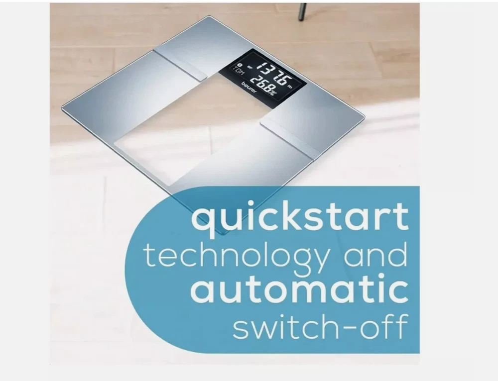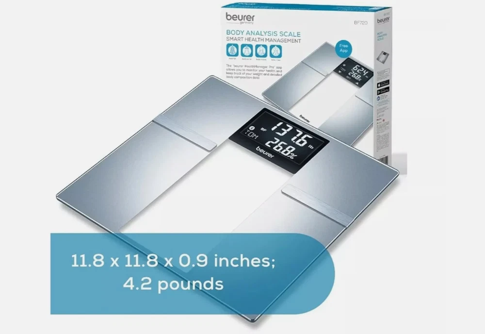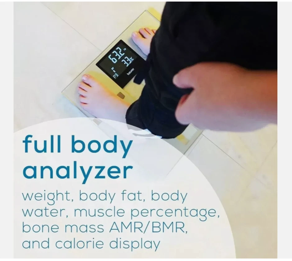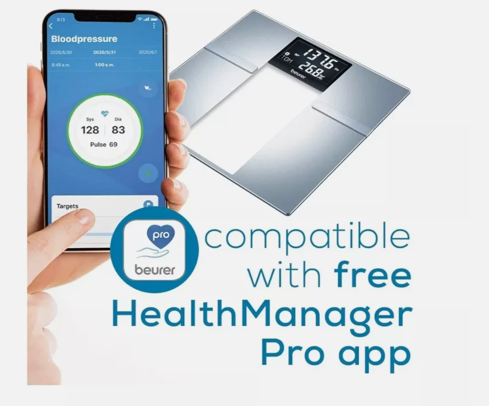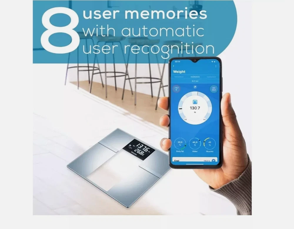 The Beurer BF720 Bluetooth Digital Body Weight Scale is a smart scale that provides you with more than just body weight data and connects to your smartphone via Bluetooth. It can generate body weight, body fat, body water, muscle percentage, bone mass, basal and active metabolic rate, and BMI. With a 400lb capacity, 8 user storage spaces on the device, and auto-user recognition it can be used by all adults in your household. The free Beurer HealthManager Pro app will auto-sync and upload your data to your smartphone via Bluetooth whenever it is open and in range. Choose from 1 of 5 activity levels that best matches your physical activity levels to help the scale estimate your daily calorie needs.