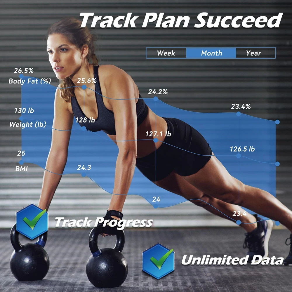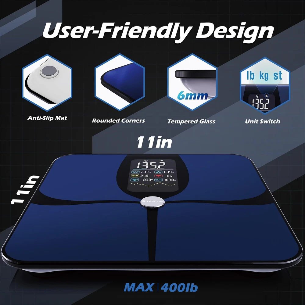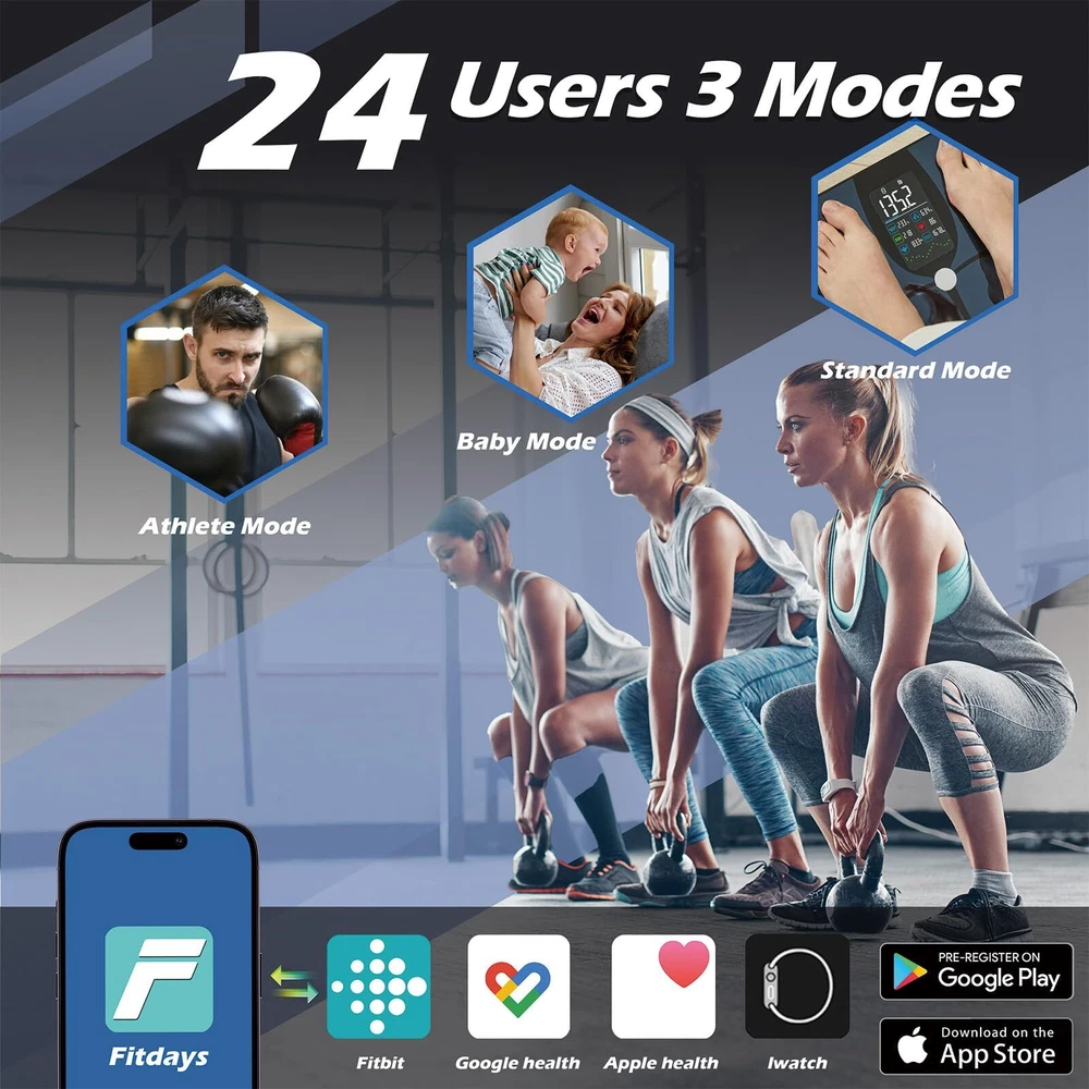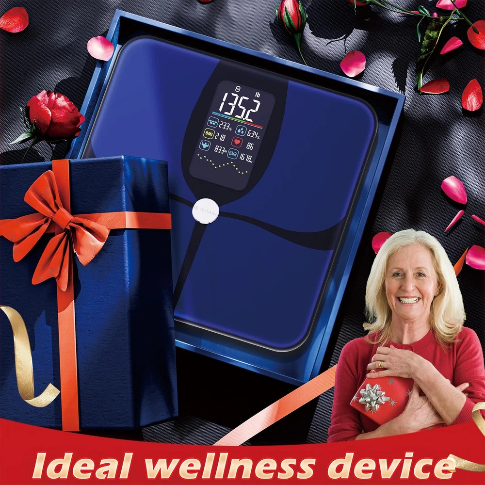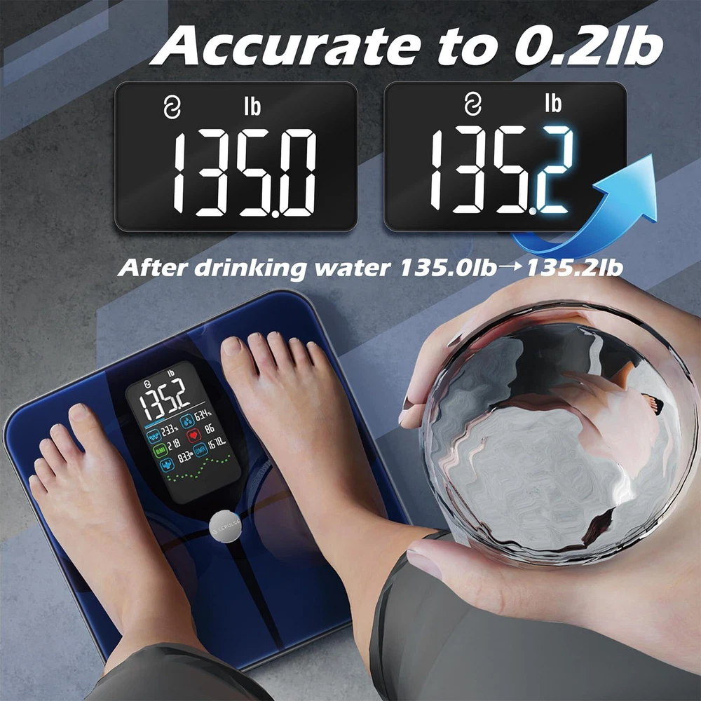4.68'' COLOR LCD DISPLAY: The smart scale for body weight features a large 4.68 inch VA LCD display that shows 8 essential metrics, including Weight, BMI, Body Fat, and Heart Rate. The weight scale with body fat and muscle also displays trend charts for key metrics, helping you track your progress. With advanced offline functionality, the digital weight scale stores up to 24 measurements and syncs with the app once you're back online. Easy display and offline use make health monitoring simple 22 BODY METRICS: The F4Pro smart body fat scale goes above & beyond with detailed 22 body metrics—far surpassing the 12 metrics typically found on other scales for body weight. Track your Weight, BMI, Body Fat, Muscle Mass, Visceral Fat, Body Water, Bone Mass, BMR, Protein, Fat-free Body Weight, Subcutaneous Fat, Skeletal Muscle, Heart Rate, Heart Index, Body Age, Muscle Rate, Water Weight, Fat Mass, Protein Mass, Ideal Body Weight, Obesity Level, and Body Type with exceptional precision PRECISION PLUS BODY SCALE: Experience high precision with this most accurate body fat scale, featuring 4 high-precision gravity sensors and a full-surface ITO sensor. This digital scales for body weight provides measurements accurate to 0.1 lb. Unlike other weight scales with small sensors, our full-surface ITO sensor ensures complete contact with any foot shape, delivering consistent & reliable results. Whether used as a smart weight scale or a bmi scale, the F4Pro supports your health goals TRACK PROGRESS: The Fitdays smart scale is your essential wellness companion. With the app, you can view detailed information for 22 key metrics & trend charts for many of them. It supports up to 24 USER PROFILES & offers 3 MODES—normal, baby, and athlete—to cater to everyone’s needs. The scale effortlessly syncs your data with Apple Health, Google Fit, Fitbit, and Samsung Health. More than just a digital bathroom scale for body weight, it’s a family-friendly tool, an ideal smart body scale DURABLE & CONVENIENT SCALE: The smart body weight scale includes USB charging for effortless power-ups, ensuring you’re always ready to track your health. Designed with user comfort in mind, this bluetooth scale for body weight features non-slip pads & smooth, rounded corners for added safety. The robust 6mm tempered glass platform supports up to 400 lbs (396 lbs), making it ideal for a wide range of users. Plus, it easily switches between lb, kg, and st, meeting all your measurement needs STOCKING STUFFER GIFT: body fat scale is a thoughtful stocking stuffer for men women mom dad—whether it's for a fitness lover, a family member, or a friend looking to focus on wellness in the new year. Gift it this Christmas and imagine the joy of receiving a tool that offers a personalized, health-focused experience! With its sleek design and advanced tracking features, it helps loved ones stay aware of their body changes, encouraging healthier habits and long-term well-being.