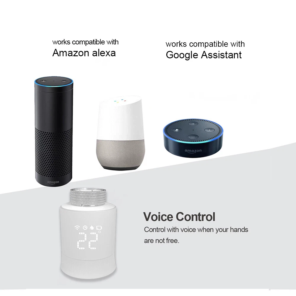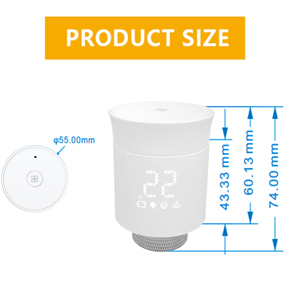 Features: Weekly Programmable Function: The smart thermostat valve comes with 6+1/5+2 weekly programmable function that allows you to set different temperature levels for different times of the day. This feature ensures that your home is always at the perfect temperature, without you having to constantly adjust the thermostat. Voice Control: The smart radiator thermostat valve is compatible with Amazon Alexa and Google Assistant, allowing you to control the temperature of your home with your voice. This feature is especially useful when you're busy or have your hands full. The Zigbee hub is required and not included. Temperature Range: The smart radiator valve has a wide temperature range, allowing you to set the temperature anywhere between 5°C and 35°C. This feature ensures that your home is always at the perfect temperature, no matter what the weather is like outside. Powerful Function: The thermostatic radiator valve comes with a range of powerful features, including windowing, anti-scale, temporary mode, anti-freezing, low voltage warning, and a child lock function. These features make it easy to control the temperature of your home and save energy at the same time. Applicable Scenarios: The radiator valve is suitable for use in multiple scenes, including homes, offices, and hotels. Its compact design and easy installation make it a versatile and convenient choice for any space. Specification: Product material: ABS Power supply mode: 2 x 1.5V AA (alkaline battery) (NOT included) Ambient temperature: 0-50°C Temperature setting: 5-35°C Temperature display accuracy: ±1°C Environmental storage temperature: -10 - 60°C Zigbee standard: IEEE802.15.4 Communication frequency: 2.405-2.48GHz Product size: L: 74mm / 2.91in, D: D: 55mm / 2.16in Product color: White Electrical safety implementation standard: GB14536.1-2008, GB14536.10-2008 Note: The 2*AA batteries are not included. Packing List: 1 x Radiator Valve