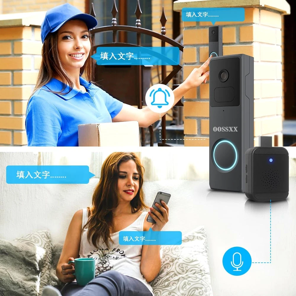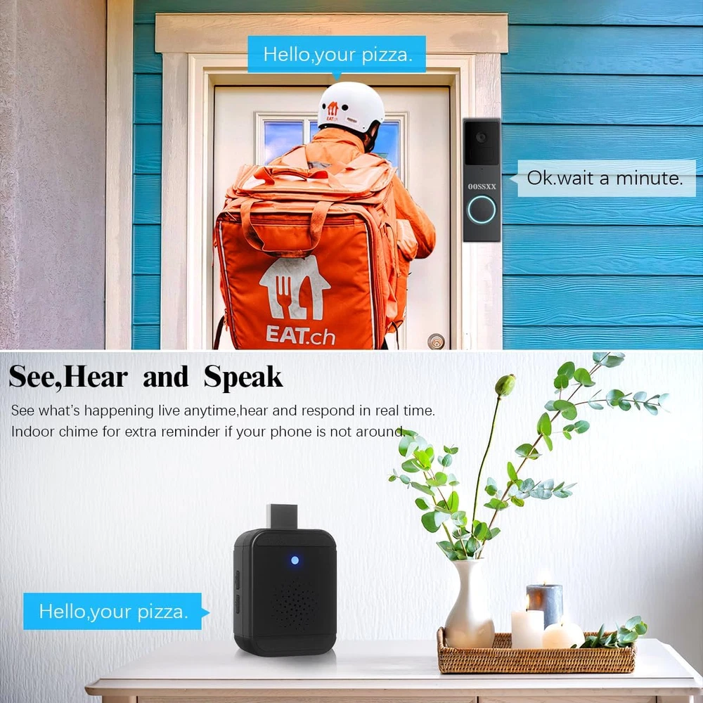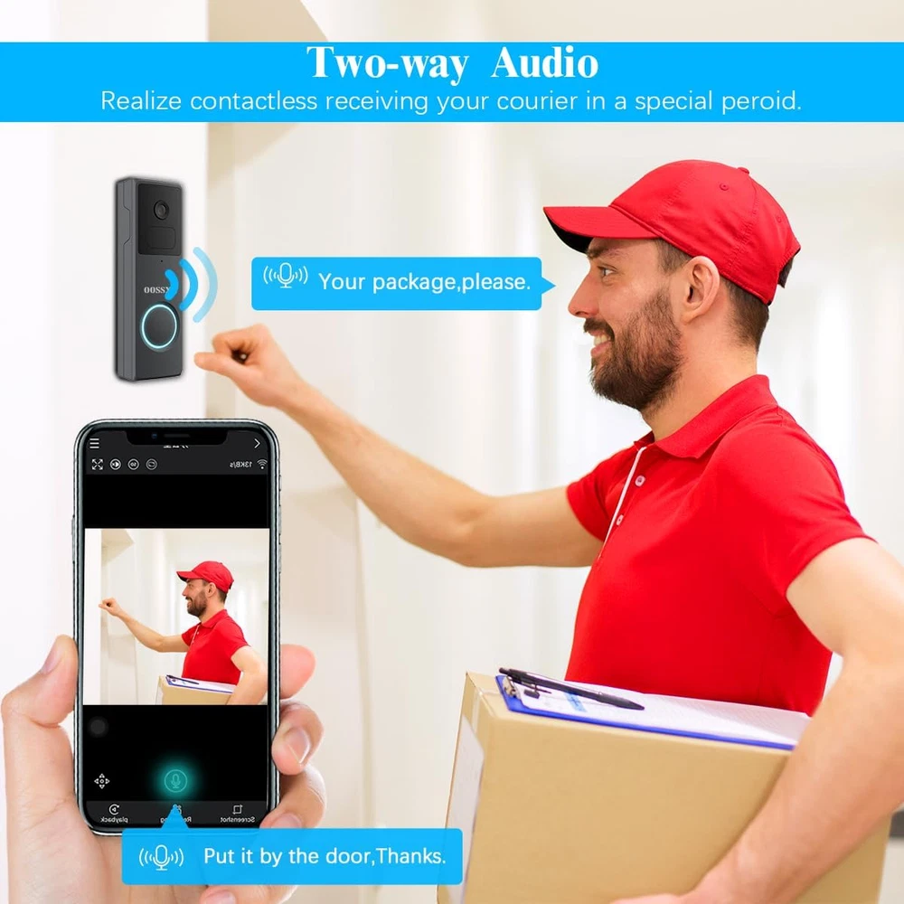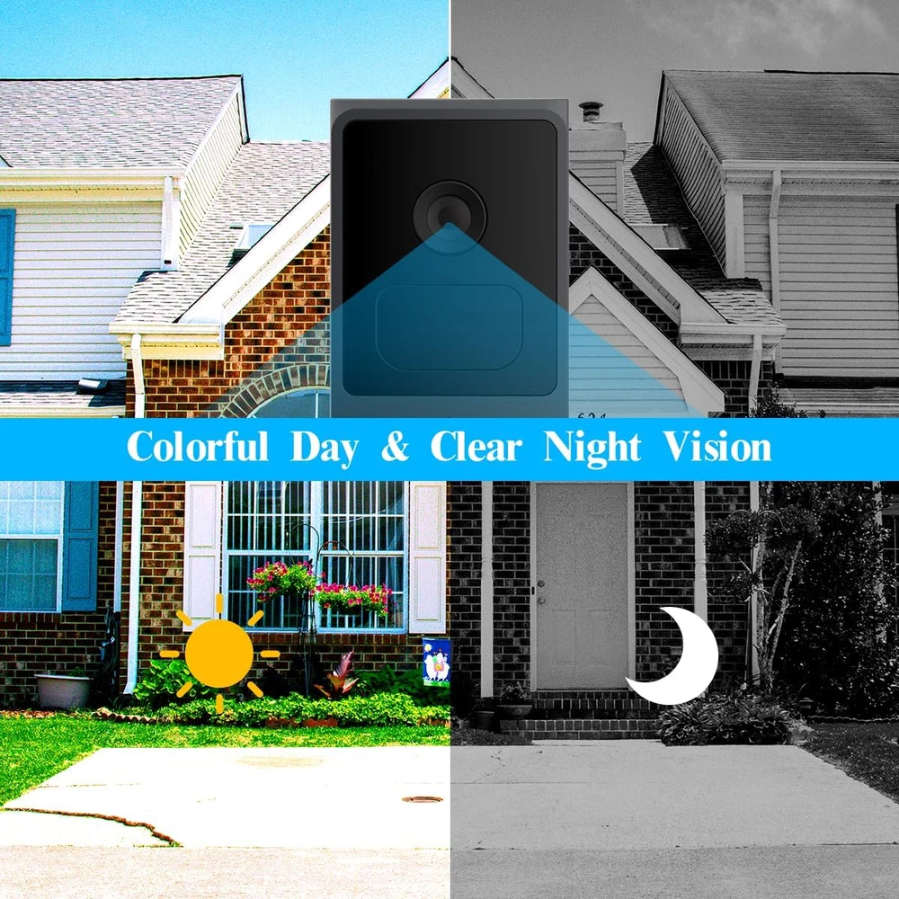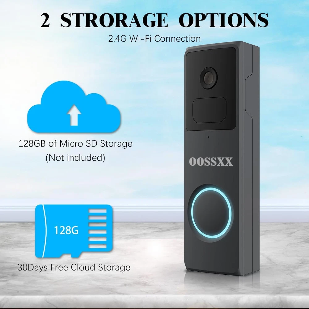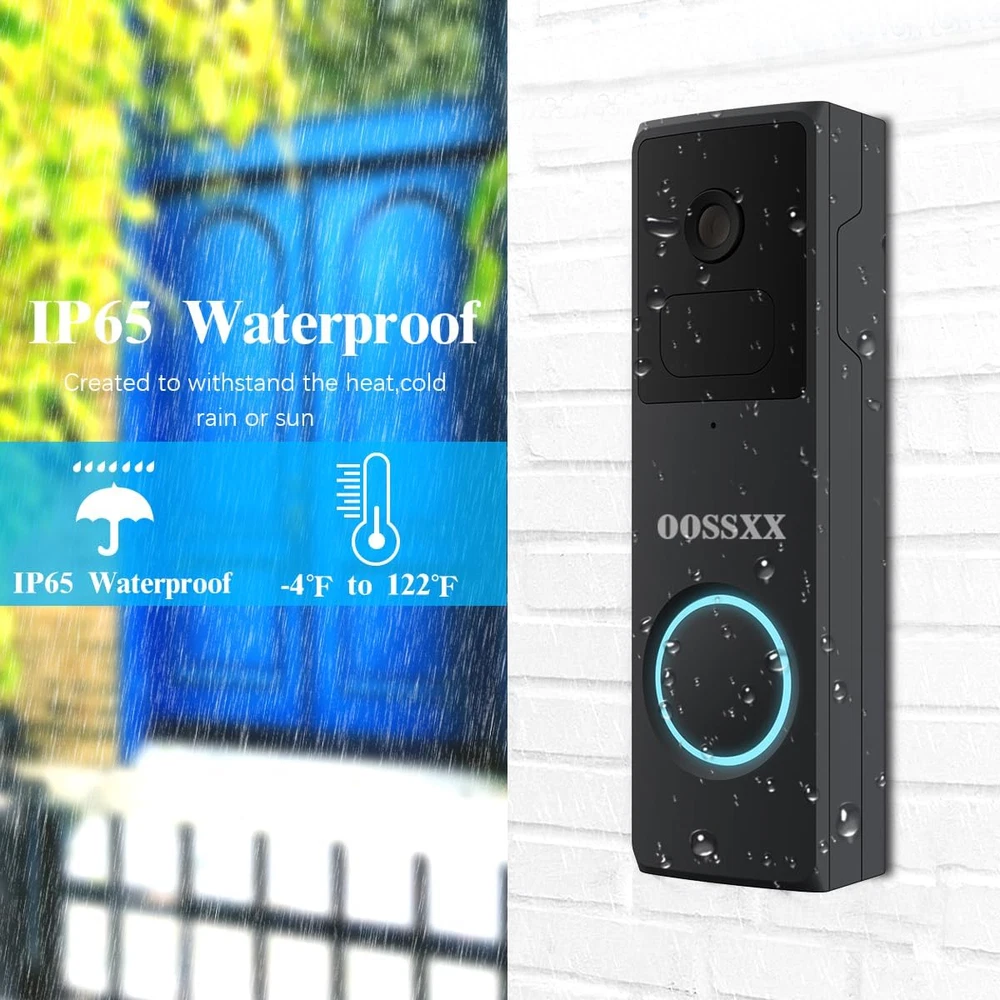 {100% Wire-free and Large-capacity battery} There is a 10000mAh Li-ion battery pack built in the doorbell. Thanks to the low power consumption technology, a full charge lasts for more than 3 months in our lab test environment. (20 event per day, 15 seconds video recording per event). With 2.4GHz Wi-Fi(not support 5GHz Wi-Fi), the installation and the connection of security camera are 100% wireles.It is very convenient and concise. {Full 2K HD video and Night Vision} The doorbell adopt professional optical glass lens so that can provide you a crystal clear picture. With Built-in infrared night-vision light, you can record videos and take photos clearly even in low light environments. Infrared mode will be automatically turn on in low light environments.With the 166°wide viewing, it can bring you an all-round protection. {Two-way Audio and Optional Ringtone} This battery powered ring built-in advanced microphone & speaker, you can talk to your guest directly and be able to respond remotely in real-time. You also can set and select a pre-recorded voice message for quick replies. There is a button with music logo in the chime. You can choose your favorite music to set as ringtone. {PIR Detection and APP Notification} The doorbell kit is equipped with the PIR infrared sensor, it will further undergo a human-shape detection to reduce false alarm rate. There are 5 level of sensitivity status optional in doorbell settings.You can adjust the sensitivity as you need . Once a break in is detected, the notification will be pushed to your smart phone at the same time. {Two storage methods and History Playback} The door entry alarm support local video storage by TF card as well as cloud storage. You can activate the cloud storage service in the free APP CloudEdge. There is a 7-day free cloud free cloud recording trial service. With the APP, You can playback or download video and won’t miss any important moment. Product Description Box contents: 1 x wireless doorbell camera 1 x wireless glockenspiel 1 x wall bracket 1 x USB cable 1 x user manual (English language not guaranteed) Screws and tools Full 2k HD The doorbell uses a professional optical glass lens to give you a crystal clear image. With the built-in infrared night vision light, you can record videos and photos clearly even in low light conditions. Two-way audio With this battery-powered, built-in advanced microphone and speaker, you can talk directly to your guest and respond remotely in real time. IP65 waterproof The outdoor wireless doorbell camera is strong enough to withstand harsh weather. It can withstand storm and snow weather. The outdoor camera can be used at temperatures from -4°F~122°F. can be operated Motion detection and alarm The wireless doorbell camera captures movements. When motion is detected, a real-time notification is immediately sent to your phone. You can monitor your home via the app. (Please note: You can adjust the motion sensitivity to reduce false alarms) PIR detection The doorbell kit is equipped with the PIR infrared sensor and is also subjected to human shape detection to reduce the false alarm rate. There are 5 optional sensitivity levels in the doorbell settings. You can adjust the sensitivity as needed. Two storage methods The door entry alarm supports local video storage via TF card and cloud storage. You can activate the cloud storage service in the free CloudEdge app. 2-Way Audio Built-in advanced microphone and speaker, you can talk directly to your guest and respond remotely in real time Share with your family Our doorbell camera can be shared with your family and friends. Simply download the app "CloudEdge" to your phone or tablet and add the doorbell for easy setup. You don't have to worry about missing important moments. Optional ringtone There are many ringtones in the chime. You can choose your favourite. It also has 4 volume levels and LED indicators, ideal for people with hearing impairments or when a sleeping baby is in your house. Remote transmission In the absence of obstacles, it can send up to 300 metres and become shorter in the event of obstacles.