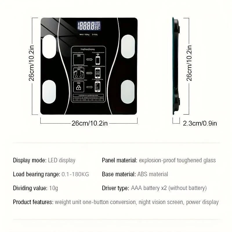 Specification: Weight Cap acity: 180 kg (40 0 lbs) Platform Ma terial: 6 mm T empered Glass Units: Kg / Lbs Dimensions: 10. 2 "x10.2 "x1 " Display: 5 digits LCD/L ED Division: 1D =0.05Kg/0.11Lb Powe r: 2x1.5V A AA battery There is a button located on the back of the scale. By long-pressing this button, you can turn the electronic scale on or off. A short press allows you to switch the displayed weight unit between pounds (lbs) or kilograms (kg). Overload Indication: "oL" scale overload, (Maximum weight capacity is indicated on the scale.) Please step off to avoid damage. Low power indication: "Lo" If power is low. Please install new battery. Error Indication: "Err"If the scale displays "Err" when you step on the scale, there is an error. Please re-test. Best working temperature: 5-35°C Storage temperature: -10-60° Feature : Get 13 body essential measurements – This body fat analyzer instantly measures Body Weight, BMI, Body Fat%, Water %, and more to help you stay motivated along your fitness journey and help you reach your goal faster. Weigh yourself anytime, even without your phone on hand. The data will sync to the app once your phone and scale connect again. Syncs with fitness apps – Designed to record and display body composition and weight changes, sync your body composition to your smart phone and keep track of your health and weight goals with reliable accuracy and convenience. Each fat weight scale can also be connected with your iOS or Android smart phone via Bluetooth 4.0 connectivity. Free ABYON app syncs data with Apple Health, Google Fit & Fitbit. Stay healthy and focused– Once you step on our 400-lb weight scale, you’ll receive a full analysis of your health and fitness which is important for managing diet plans, structuring workouts, gaining or losing weight safely, or chan ging habits. Easily changes weight units through the app in lbs. , kg. , or st Quick, accurate readings – F our highly-sensitive electrodes in the surface of our clear fat percentage weight scale auto-calibrate to each person, allowing you to manage multiple people in your home, office, or gym for solo or team goal setting. Satisfaction service – Every scale we create is backed by unmatched craftsmanship and quality, as well as an excellent customer service at your order to provide fast, efficient and professional support. Top gifts for your family or friend.
