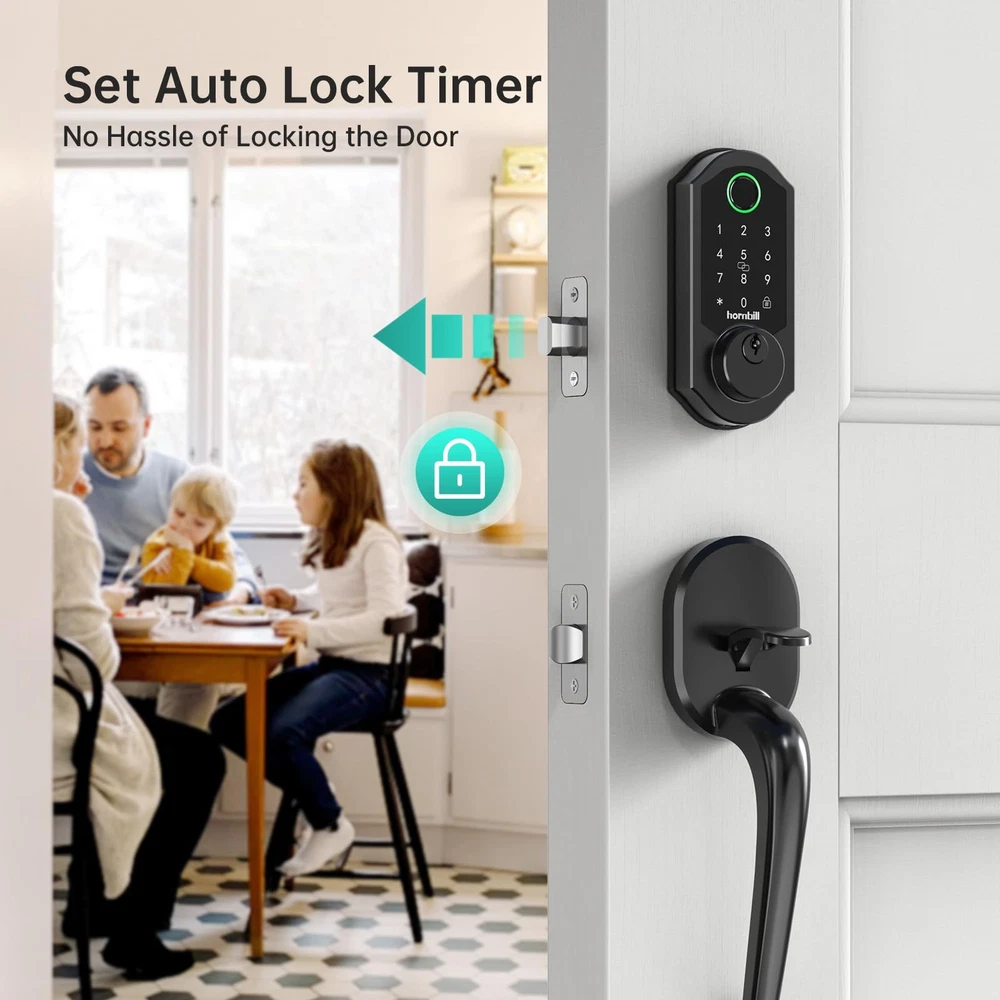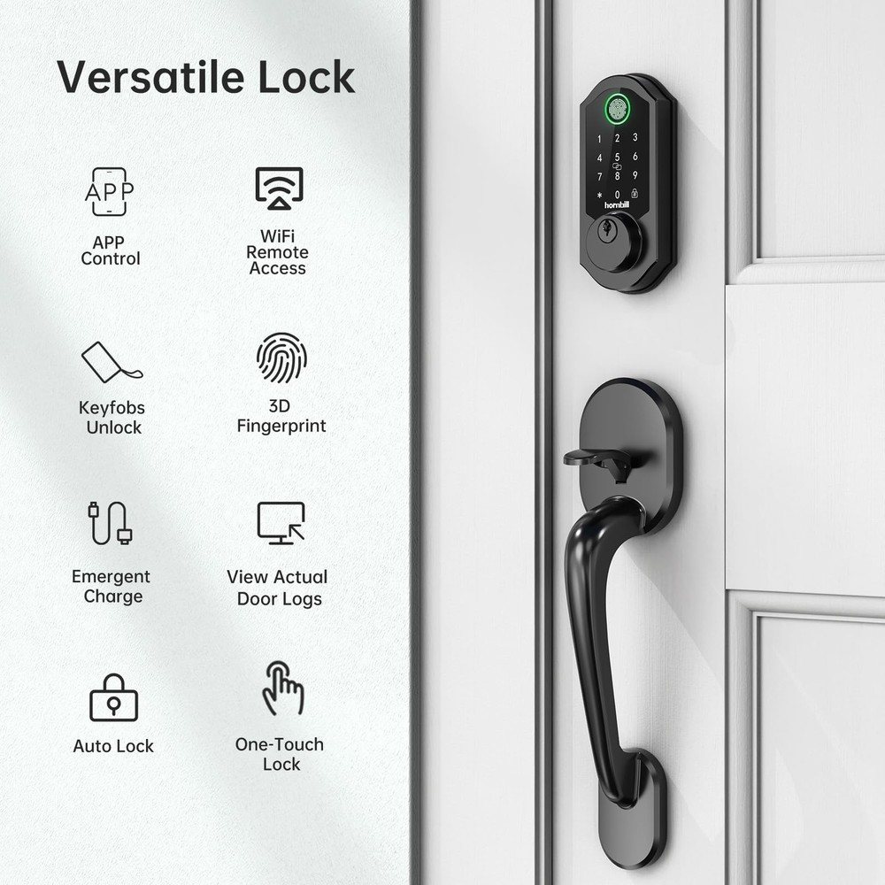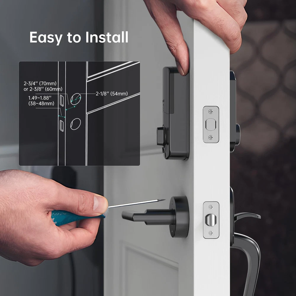 【10 in 1 WiFi Deadbolt】Features Biometric Fingerprint Reader + Bluetooth Keypad + Remotely Lock/Unlock/View Door Logs/App Control + Virtual Passcode + Keyfobs Unlock + Set Auto Lock Timer in 30 mins/One-Touch Lock + Passage Mode + Physical Keys/Emergent Charge(Type-C) + Low Battery Alert + Alexa/Google Home Voice Control. 【10 in 1 WiFi Deadbolt】Features Biometric Fingerprint Reader + Bluetooth Keypad + Remotely Lock/Unlock/View Door Logs/App Control + Virtual Passcode + Keyfobs Unlock + Set Auto Lock Timer in 30 mins/One-Touch Lock + Passage Mode + Physical Keys/Emergent Charge(Type-C) + Low Battery Alert + Alexa/Google Home Voice Control. 【Control from Anywhere】With a wifi bridge included, use the "Smart Life" App to remotely lock and unlock, share guest access, view real-time activity history, and get immediate app alerts when door state changes including invalid keypad attempts or lock tampering. Connectivity: 2.4GHz WiFi. 【Versatile & High Capicity】Backlit keypad touchscreen supports for up to 300+ digital codes/fingerprints/keyfobs Storage. Support kinds of Time-Limited/ One-timed / Temporary /Customed passcodes for different needs and people. 【Certified Security & Durability】Perform well under -25℃-70℃ with IP63-rated dust and waterproof. Built to withstand heat and cold outdoors. Made of heavy-duty alloy that can resist any human strike with a long battery lifespan (20,000 times lock/unlock once). 【Easy Installation】No extra drill. DIY in minutes with a detailed manual including our installation video. Design for US standard left or right-hand doors that thickness is 1.49-1.9''(38-48mm); Backset: 2.36''(60mm) or 2.76″(70mm); Cross Bore: 2.13''(54mm). 【Reliable Service & Assurance】60 days of return window & 1-Year replacement and LIFETIME troubleshooting & customer service support. A follow-up email with instructions and a video guide will be sent after purchase to ensure the lock function. 【Rental Hosts & Smart Home】Ideal for Airbnb short-term rental hosts, rental property management, new house contractors, and smart home residents. The app will detail who is locking and unlocking or who was denied. You can also sync and manage your multiple locks on the APP with a WiFi remote control.