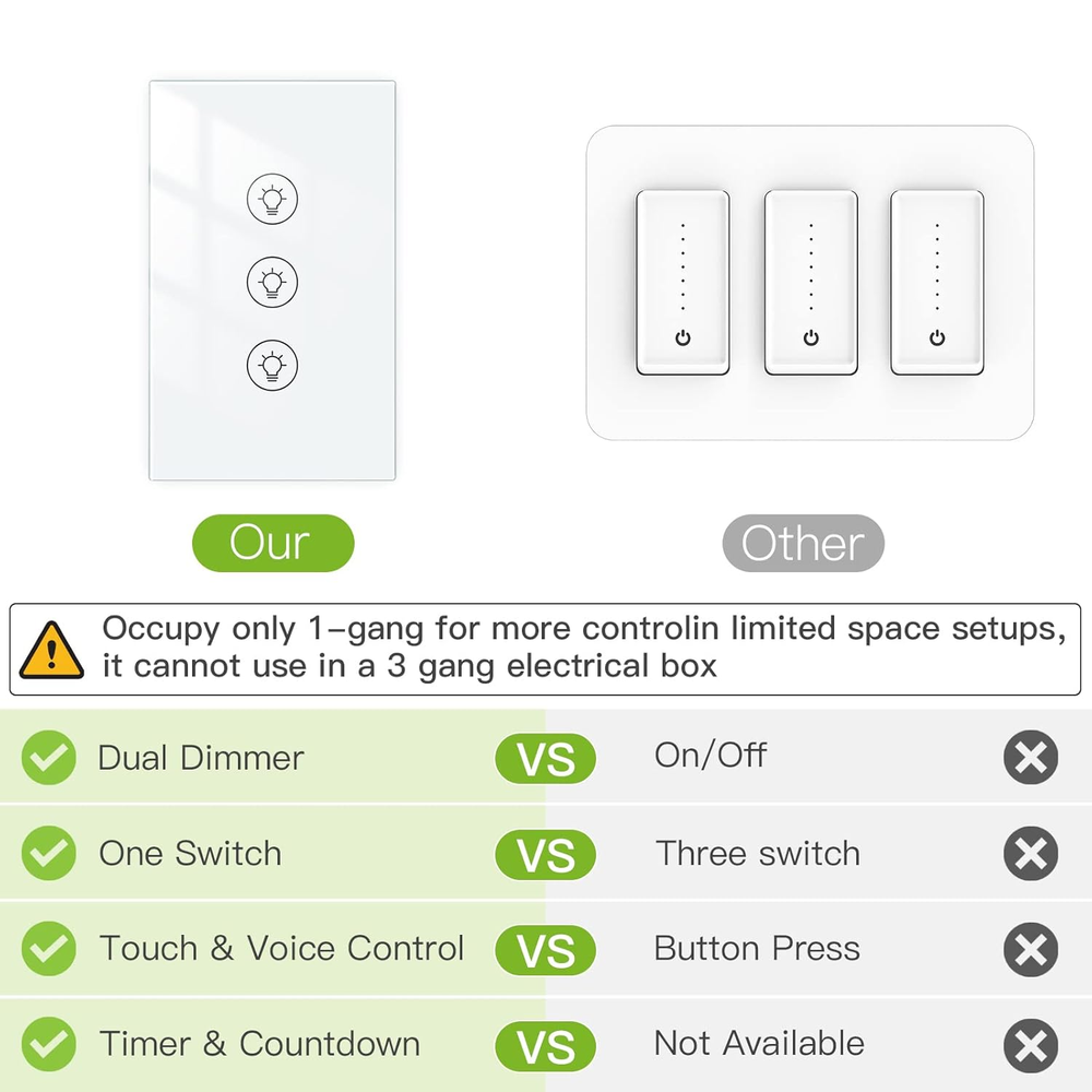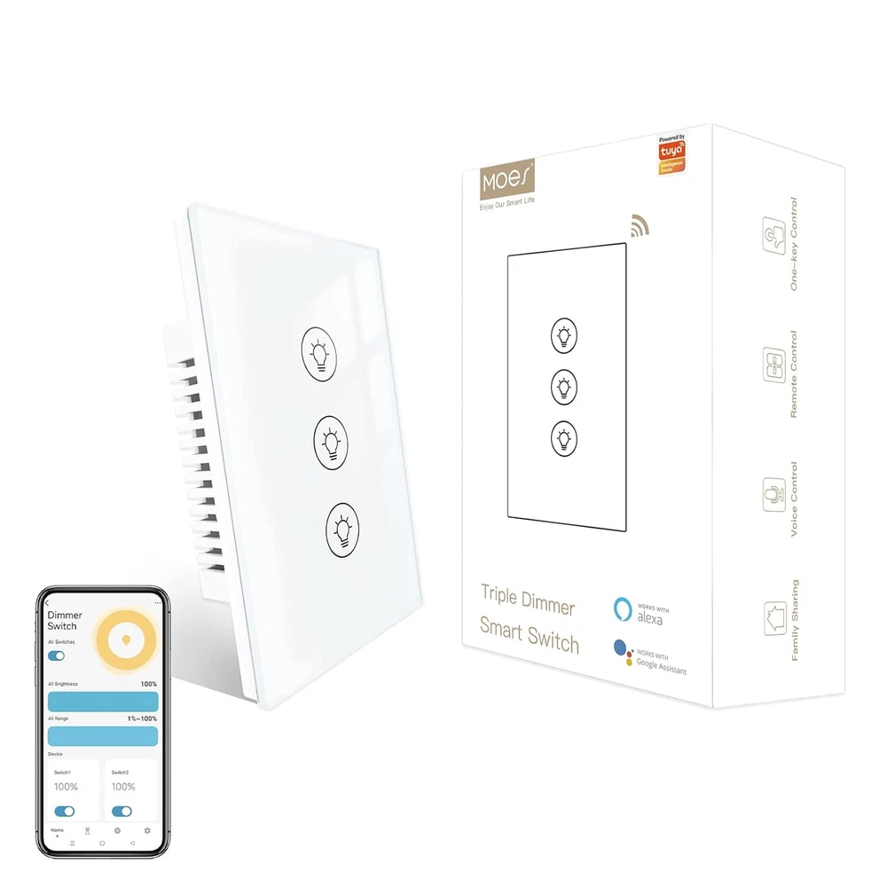 【0%-100% Triple Dimmer】Features three touch button for full-range dimming of two separate lights. This Wi-Fi double dimmer switch for led lights is compact and space-saving, perfect for both residential and commercial locations such as offices, showrooms,family rooms, home theaters, and more! Occupy only 1-gang for more controlin limited space setups,it cannot use in a 3 gang electrical box. 【Voice & App Control】Each touch button can be individually named and controlled by voice via Alexa and Google Home Assistant,just speak a simple voice like “Alexa, dimmer switch 1 to 60%". Compatible with Tuya Smart/Smart Life APP with no hub required. 【Luxury Glass Panel 】The panel is made of high quality tempered glass, making it extremely durable, moisture and water resistant. 【Timing Function】Create schedules to automatically turn the light on or off with preset brightness via Tuya/Smart Life APP app anytime, anywhere; dimming the lights with Alexa to save your eyes from harsh brightness or access the scene mode and timing mode via the app. 【Note】Neutral, Live, Load Wires are Required; Not 3 way smart switch; Cannot work with smart bulb and fans. Max. Load: 300W(INC)/110V;75W(LED/CFL)/110VProtocol: Wi-Fi 2.4GHz Product Description Product Specifications: Working Voltage: 90-250V AC 50/60Hz Max. Load: 600W(INC)/220V;300W(INC)/110V; 150W(LED/CFL)/220V;75W(LED/CFL)/110V Protocol: Wi-Fi 2.4GHz Working Frequency: 2.4G Wireless Distance(outdoor): 20-30M MOES Wi-Fi Smart Dimmer Light Switch Easily set the ambiance of any room and control your lights from anywhere with Moes Dimmer Switch.,it can easy replace the traditional switches directly,then you can start controlling your lights from your mobile phone by 'Smart Life' APP(ios or android).The smart dimmer light switch also a normal switch,simply touch the switch to dim or brighten your lights. Package listing Smart Dimmer Switch*1 User Manual*1 Screw*2 Hands-Free Voice Control After paired with Amazon Alexa or Google Assistant,you can turn your lights on/off or dim/brighten your lights just by your voice. Ultimate Beauty Ingenuity design Beauty appearance,Highly texture. Toughened Glass Surface Prevents the scratch from knives or something hard. Dampproof available for humid operation. Fire Retardant Strengthen protection for the short circuit of power lines. Group Control You can remotely Control Your House lights on smart phone. Touch Dimming Add schedule for flexible timer control of Your Lights with countdown featured.Timer your schedule for all three lights or set individual one for each lights without interference. Sharing device to family membeer. Neutral line required. No hub required. WIFI 2.4G (Not 5G)