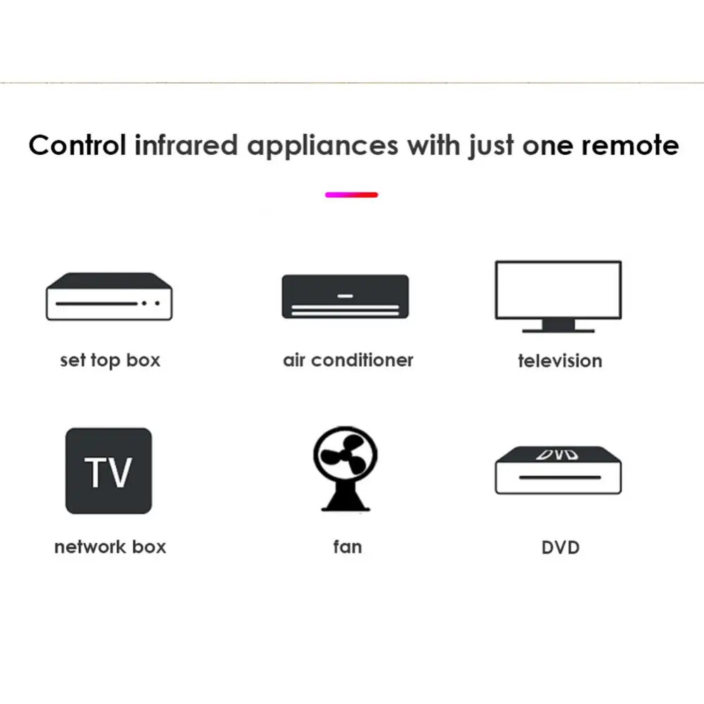 Smart Wifi IR Universal Remote Control with Tuya and Smart Life Home Remote for Air Conditioner TV DVD via Alexa Google home Description: With this Universal IR Remote Control, you may use your smart phone to control home appliances, such as STB(Set-Top-Box), TV Box, TV, Air Conditioner, Fan, DVD, etc. Compatible with most of brands, for details, please refer to the supported brand list in App. Besides, it has LEARNING FUNCTON, allows you to copy the key function of original remote control to App. Note: Not compatible with the home appliances which use RF or BLUETOOTH remote control. 【1.Massive IR Code Database】 Support 4000 brands, 50000 IR Code on cloud, supported devices library is constantly being updated by the cloud. 【2. App Remote Control】 Remote Control your home appliances by using “Tuya Smart” App in your smart phone anywhere anytime. For example: Switch on home A/C in advance, enjoying the comfortable temperature once you get home. 【3. Easy to install and add to app】 Once you plug the cable line into the device, the device starts to start, and then select the app's "auto scan" function to find device. The whole process takes only a few minutes. 【4. Voice Control】 By connecting Intelligent speaker, such as Amazon Alexa, Google Home, you are able to control your home appliances by voice. For example: Alexa, turn on TV; OK Google, set air conditioning temperature to 25 degrees. 【5. Scenario and Automation in App】 A scenario consists of 1 or more actions. By creating an “Scenario”, you may control multiple devices with one tap; By adding an “Automation” and interworking with other smart home devices, Wi-Fi remote control is able to execute actions automatically according to conditions, such as device status, weather and time. 【6. Timer and Automatic Trigger】 According to your living habits, set time switches for your home appliances, such as turning on/off the air conditioner at regular intervals. 【7. DIY】 Customizing buttons in the Tuya Smart App if your home appliances brand is not in the list or not supported. 【8. Third-Party Control】 Works with Amazon Alexa, Google Assistant, Siri(iOS 12.0 or later), Tmall Genie, Tecent Xiaowei, DingDong, Rokid, DuerOS, etc. Specifications: Power input: DC 5V/1A Standby power consumption: <0.5W Working temperature: 0~50℃ (32~122℉ Working humidity: <85% RH Infrared frequency: 38K Infrared distance: <8m (affected by the environment) Connection method: 2.4GHz 802.11b/g/n Package Included: 1*Universal Remote Control 1*USB cable 1*Instruction
