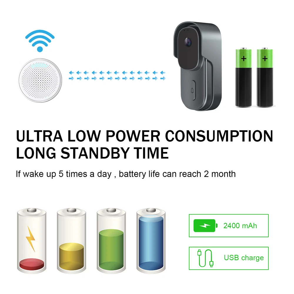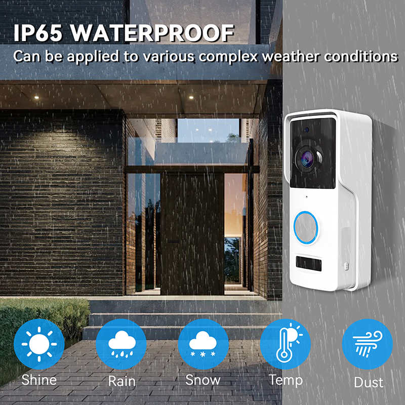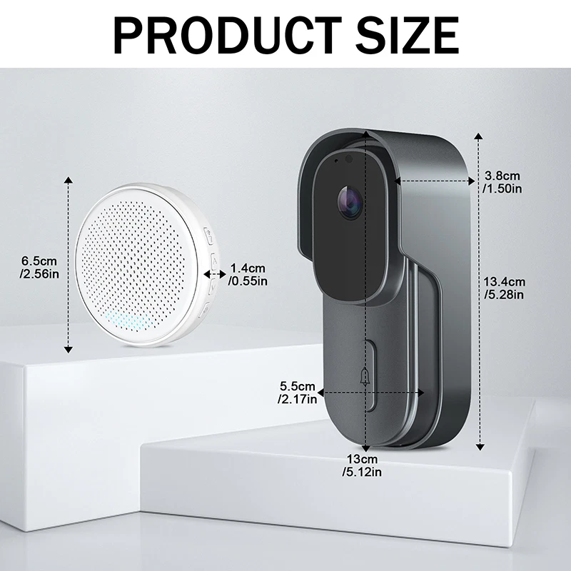 Item Width: 3.8cm/1.50in Pixel: 300,000 pixels Brand: ONE Material: Plastic Type: Door Chime Consumption: <0.5W Item Length: 13.4cm/5.28in Video Compression: Standard H.264 Connected Home Protocol: Wi-Fi Manufacturer Warranty: 5 Years Waterproof: IP65 Volume: 25-85dB Color: Black/White Finish: Glossy Viewing Angle: 90° Battery Included: Yes Communication Protocol: TCP/IP, HTTP, DHCP, DNS Item Weight: 0.368kg Music: 58 Ringtones WiFi connection: WIFI Support 2.4G WIFI IEEE802.11b/g/n Style: Modern Product: Smart Wireless Doorbell Year Manufactured: 2023 Sub Type: Doorbells Suitable For: Office, Home, School, Shop Voltage: 5V Resolution: 640x480 Network Wifi: 2.4GHz Field Of Angle View: 90° Number of Batteries: 2 Storage: 8G/16G/32G(not included) Features: Portable Bell/Chime, Wi-Fi Connectivity, Waterproof Power Source: Battery, Wi-Fi, USB Storage capacity: Storage TF Card (Max. 32G) -Not Included & Cloud Storage Items Included: Doorbell Receiver, Battery, Screws, Button Power Suppiy: USB 2.0 DC 5V-1A Audio: Two-way talk with noise cancellation Shape: Rectangle Model: Doorbells Connectivity: Wireless MPN: Does not apply Blue light solids on: camera running correctly
