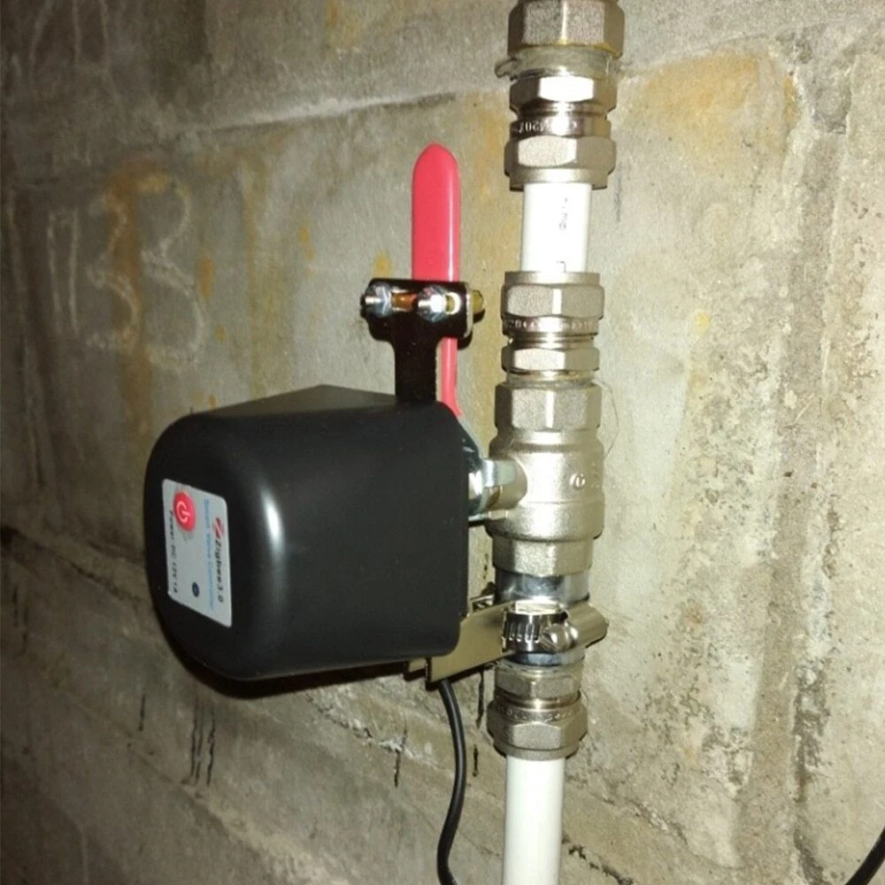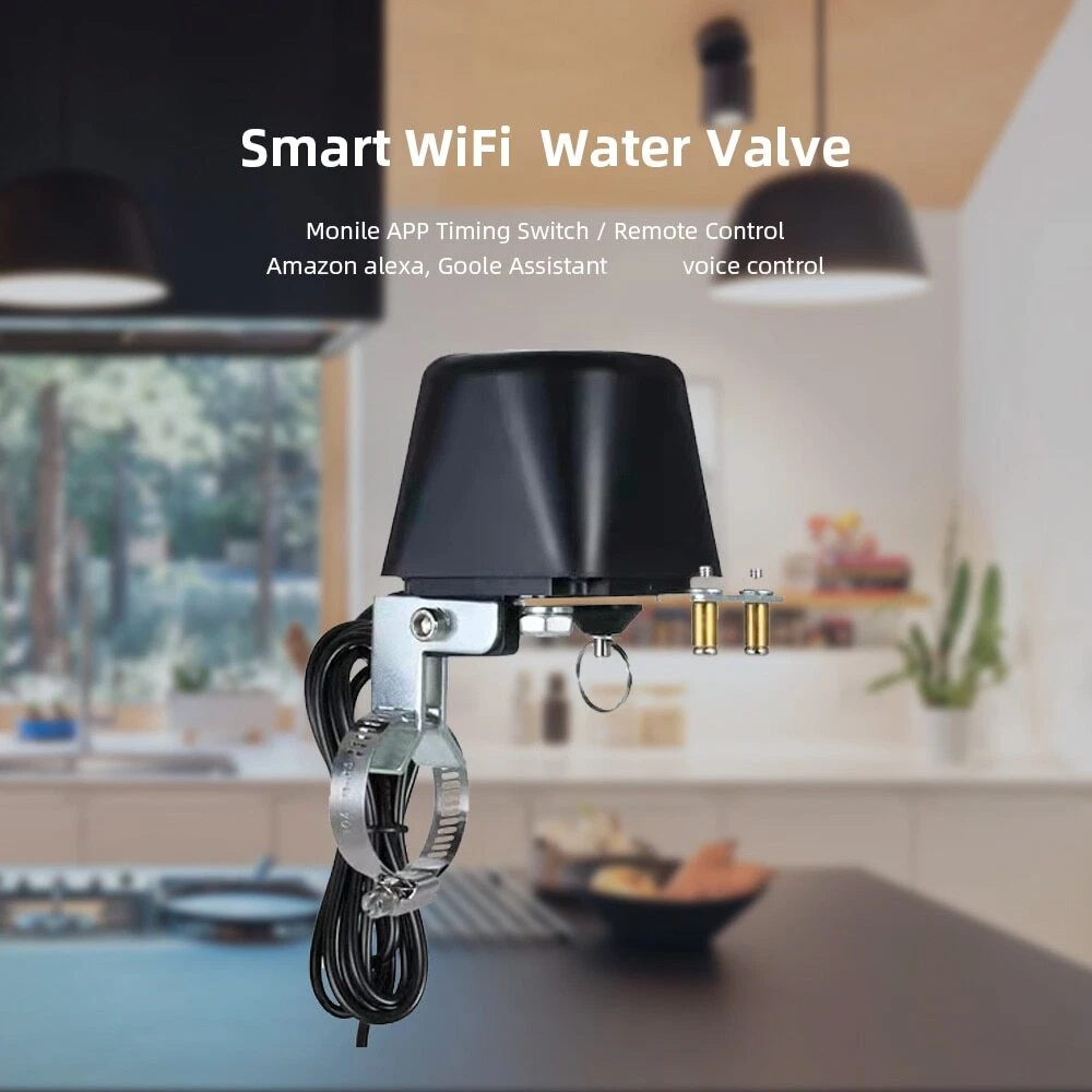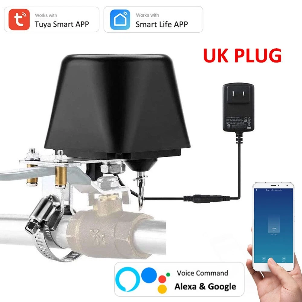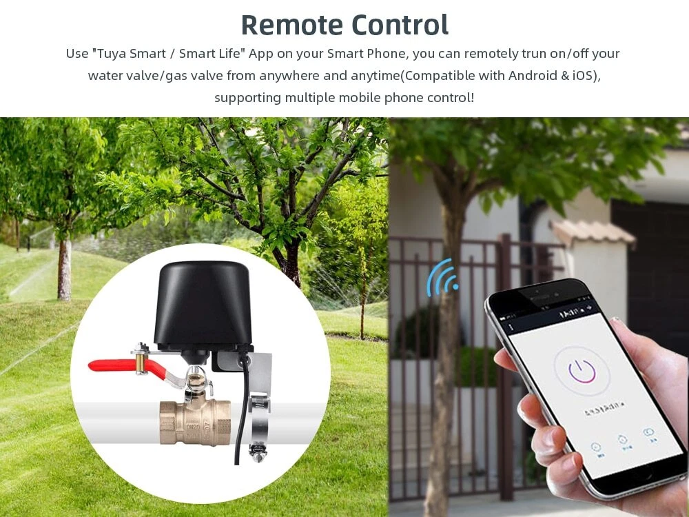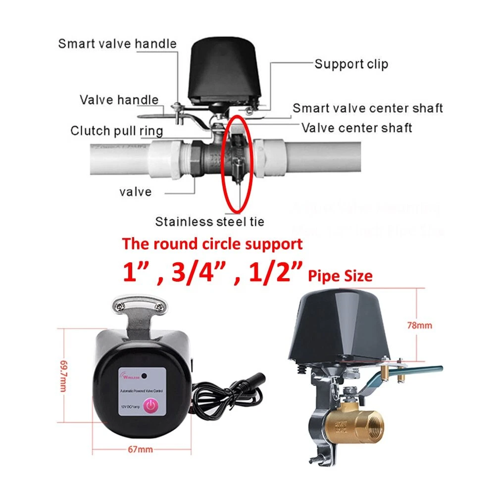 Smart Irrigation System If you're interested, please click below link: NOTE: Below Video product is WIFI Tuya Smart Valve. ZigBee version need to add hub first, then add to app under zigbee hub. WiFi&ZigBee Alexa, Google voice Command is the same operation. THIS SMART VALVE CONTROLLER IS ONLY COMPATIBLE WITH BALL VALVES WITH LONG LEVERAGE SHOW IN THE IMAGES. Please Pull the ring to manually shut off the valve if power supply is off. Tuya Smart Valve Features: WiFi & ZigBee Tuya Smart Valve Controller WiFi VERSION can work standalone! ZigBee Version need to add TUYA ZigBee Hub. A Smart Add-on for your Existing Water or Gas Ball Valve Simply add this smart valve controller to your water valve or gas shutoff valve, you can simple control the water supply or turn off gas valve from anywhere at any time with your smartphone, using free Smart Life app. Works with Amazon Alexa and Google Home When paired with the Amazon Alexa or Google Assistant, the smart shut off valve gives you hands - free voice control over your home. Voice Command: "Hey, Google, Turn ON/OFF DEVICE NAME" "Alexa, Turn ON/OFF DEVICE NAME" Wide Application The smart shut off valve is compatible with water pipe ball valves, electric/ manual control switches, and natural/ liquid/ tap gas valve. Enjoy home automation like automatic irrigation of garden, farmland; timing water supply for feeding farm, stockyards; remote control the gas valve when you are leaving home in haste. Easy Installation & Pipe Size Just need screw to fix over your existing levered ball valve, no addition plumbing required. With specially designed metal clamping ring, it is adjustable to compatible with most widely used pipe size like 1/2", 3/4", 1" Share with your families and set time schedule The smart controller allows you to setup multiple users, and you can also set time schedule to turn on/ off your garden yard sprinkler at certain time. Specifications: Power adapter input: 100V-240V Power adapter output: DC12V 1A WiFi: 2.4GHz only Radio Range: 30 meters Valve pressure: 1.6 meters Valve pressure: 1.6MPA Time off valve auto: 5-10 seconds Time off valve electric: 5-10 seconds Torque: 30-60kgf.cm Power cord: 2.3 meters (0.9 meter from power adapter, 1.4 meter from the body) Power cord extendable with 5.5x2.1mm size DC male-famale cord. ZigBee Smart Valve--NEED WORKS WITH HUB Real-Picture Installation