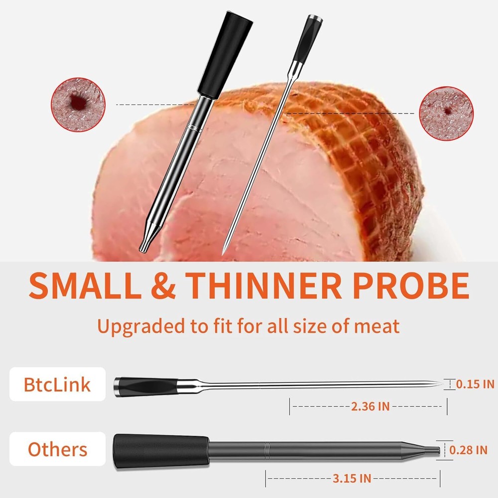 Smart Wireless Meat Thermometer 3.9mm Ultra-Thin 777FT Range Small, Black Product Details Brand: BtcLink Special Feature: Alarm Color: Black Age Range (Description): Adult Included Components: 1*probe 1* booster Outer Material: Stainless Steel Display Type: Digital Connectivity Technology: Bluetooth Unit Count: 1.0 Count Power Source: Battery Powered Smart Cooking Tool: Built-in sensor can track the real-time temperature of your meat and send an alert to the app, allowing you to cook with complete flexibility, and just relax on your sofa without worrying about overcooking and undercooking with our smart meat thermometer digital with app. Uncanny Accuracy and instant read : Wireless meat thermometer with advanced temperature sensor provides instant readings within 2 seconds. Probe temperature range -4°F to 932°F (internal temperature up to 212°F/100°C & handle withstand temperature up to 932°F/500°C), accuracy ±1.8°F/1°C. Whether you're bbq, smoker, rotisserie and sous vide.You'll get the information you need to fast and accurately. Say good bye to vercooked or undercooked food. 777FT long distance connection: BtcLink 5.4 Bluetooth technology enables a stable connection range of up to 777ft (without any obstacles) or 500ft (materials such as solid substances,glass, wood, metal, and concrete) for the wireless meat thermometer. You no longer have to worry about application disconnections, ensuring a reliable connection. 100% no wire: Smart wireless meat thermometer eliminates all tangled wires, making it a versatile tool for rotisserie, smoker, oven, grilling, etc. You will no longer be tied to the kitchen, constantly checking your food temperature, and easily achieve a master chef level of cooking. The probe sensor responds in 2 seconds, ensuring temperature accuracy within ±1.8°F, helping to avoid overcooking or undercooking of the food Easy to Use & Clean: Smart digital thermometer has a pre-programmed function for different types of meat, so you only need to select the type of meat and the optimal temperature (steak, turkey, fish,chicken). It notifies you when the food has reached the desired temperature.making it a great gift for cooking enthusiasts and beginners.