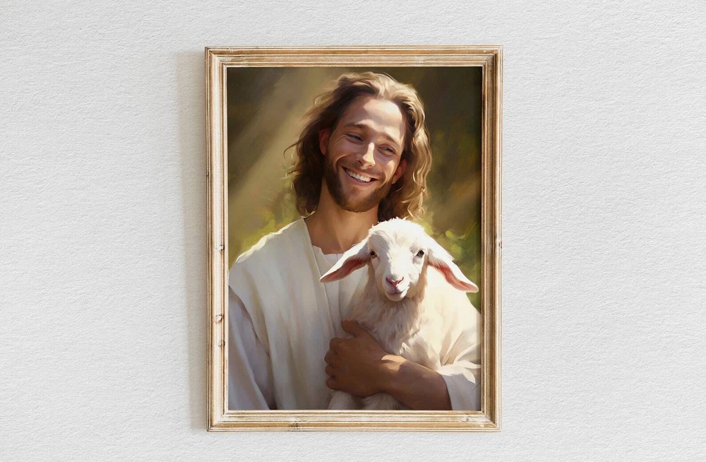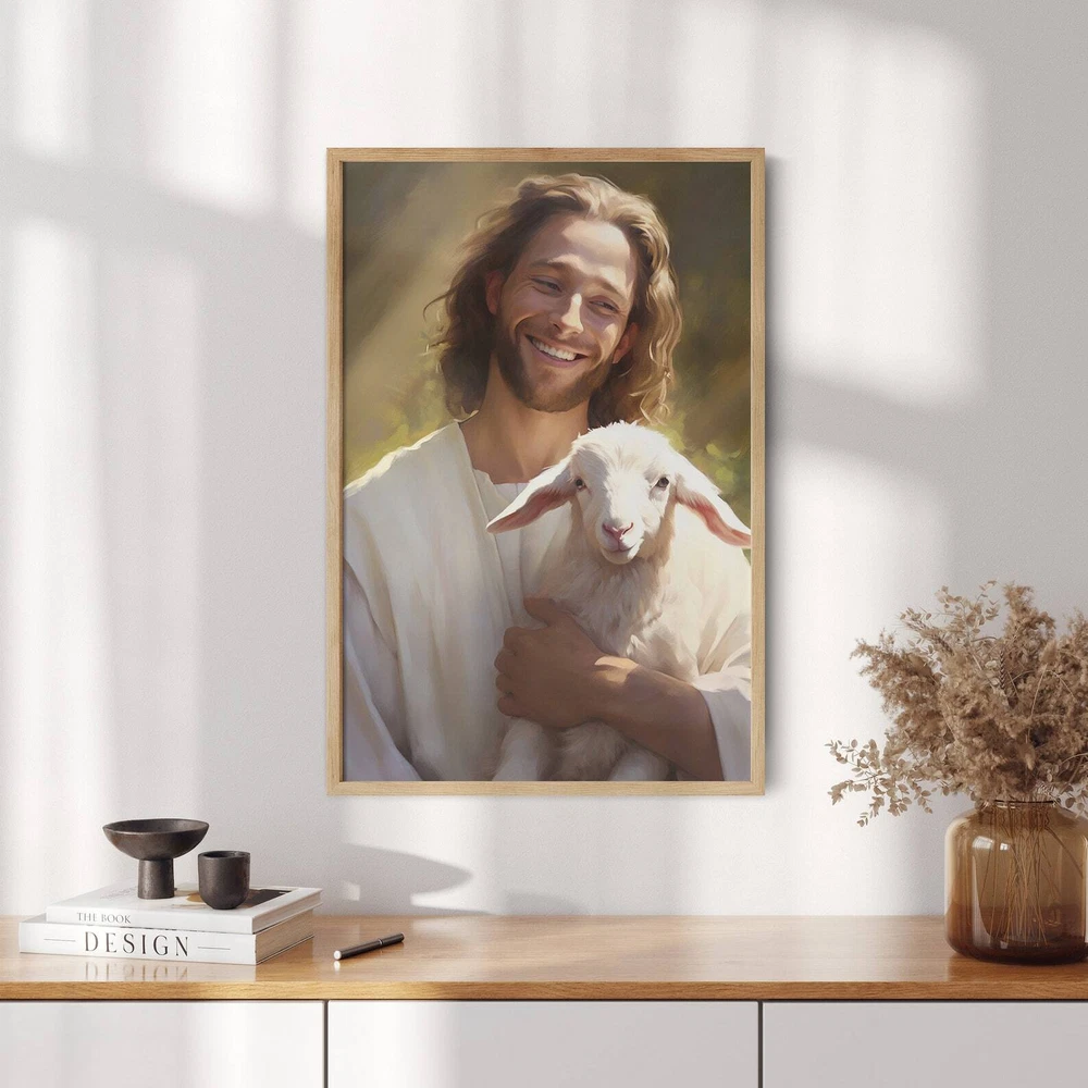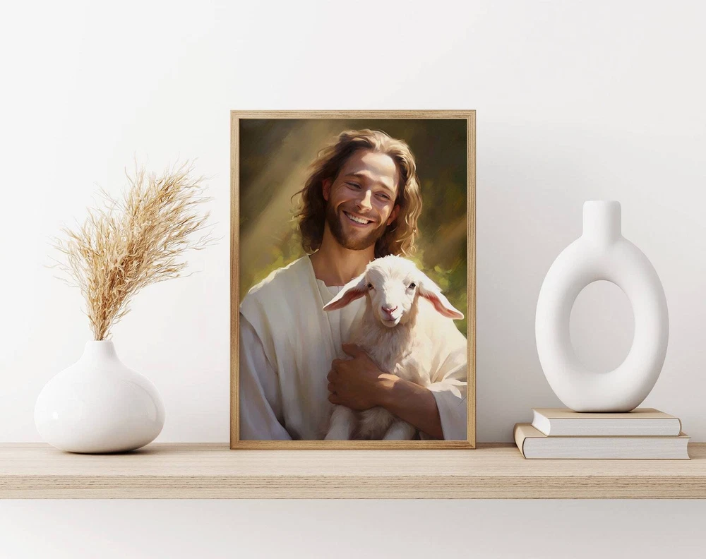 Smiling Jesus With A Lamb Oil Painting Jesus Wall Art Christian Wall Art Jesus Painting Wall Art Jesus Print Bible Verse Material: Premium luster photo paper Print type: Inkjet printing One side printed + The finish provides the highest possible resolution and color saturation + Lasts up to 200 years in color and 400 years in black-and-white + Printed on high-quality resin-coated photo base paper medium + Posters can be hung with double-sided tape, tacks, or framed + Hand washing with a gentle cry cloth is recommended for extended durability I will hand select the best choice of paper for your chosen design to ensure top quality results for a beautiful, bright and luxurious print. All prints are sealed in cellophane slips for protection during transportation, and are shipped in a protective cardboard envelope.