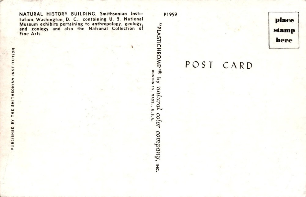 The postcard was published by the Smithsonian Institution, specifically from the Natural History Building in Washington, D.C. This building houses exhibits from the U.S. National Museum related to anthropology, geology, and zoology, as well as the National Collection of Fine Arts. The postcard was produced by the Natural Color Company, Inc.