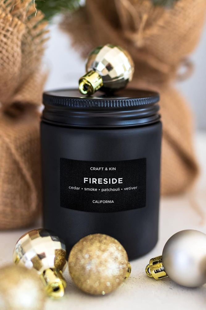 MASCULINE ELEGANCE: Immerse yourself in the magical allure of our fall scented candles crafted specifically for men. Designed to capture the essence of the season and the cozy warmth of masculine charm, these candles are an irresistible delight. Perfect for those who savor luxury and the comforting scents of the season, each gift comes in captivating, ready-to-give packaging. Elevate your gift-giving experience with this thoughtful and unforgettable present for any man deserving of a touch of elegance. PREMIUM SOY CANDLE: These 100% natural soy wax, wood wick fall candles are safe to use and long-burning. This Fireside aromatherapy candle for home is made with essential oils that bring you a strong masculine fragrance to your home. CANDLE FOR MEN: Have you looked for a candle for men for a long time? We’ve designed the perfect one for you and your loved ones. It comes with a strong masculine scent and a stylish black design. LONG LASTING SCENT: This 7.6 oz scented candle will bring in the masculine notes of cedar, smoke, patchouli, and vetiver to your home. Enjoy this luxury candle made with the finest essential oils to bring you a lasting and strong scent. OUR MISSION: The Craft & Kin Collection is carefully designed and crafted with your home and family in mind. We believe that your home should be a collection of people and things you love. Our mission is to help you craft a little more of that love with your kin. Product Description Aromatherapy candle These soy candles are made with strong essential oils that will create an enjoyable ambiance in your home. 100% Natural Soy Wax Each candle is made with 100% premium soy wax. Strong Essential Oils A highly scented candle made with a blend of essential oil mixtures. Wood Wick Featuring a wood wick for the ultimate "fireplace"-like atmosphere. Elegant Packaging Our scented candles come in a giftable black box for the ultimate experience. 1 100% Natural Soy Wax 2 Strong Essential Oils 3 Wood Wick 4 Elegant Packaging Fireside Featuring the masculine notes of cedar, smoke, patchouli, and vetiver. Lavender Woods The mystical notes of grapefruit, lavender, vetiver, and moss. Pine & Clove Woodsy pine, musk, oakmoss, and clove mix together in this earthy scent. Smoke & Vanilla Bergamot, sandalwood, leather, and vanilla meet to form this unique blend. Vintage Leather A blend of birch, amber, Vintage leather, and cedarwood. 1 Fireside 2 Lavender Woods 3 Pine & Clove 4 Smoke & Vanilla 5 Vintage Leather