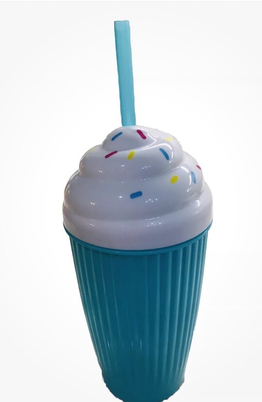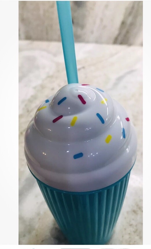This 10 oz plastic tumbler is designed in the shape of a smoothie cup with a fun cupcake theme, making it a perfect Valentine's Day gift for kids. It comes in red color and includes a straw for sipping drinks. The tumbler is made of plastic, making it durable and ideal for kids to use. It is a single serving cup, perfect for enjoying smoothies or other beverages. Baby box 1